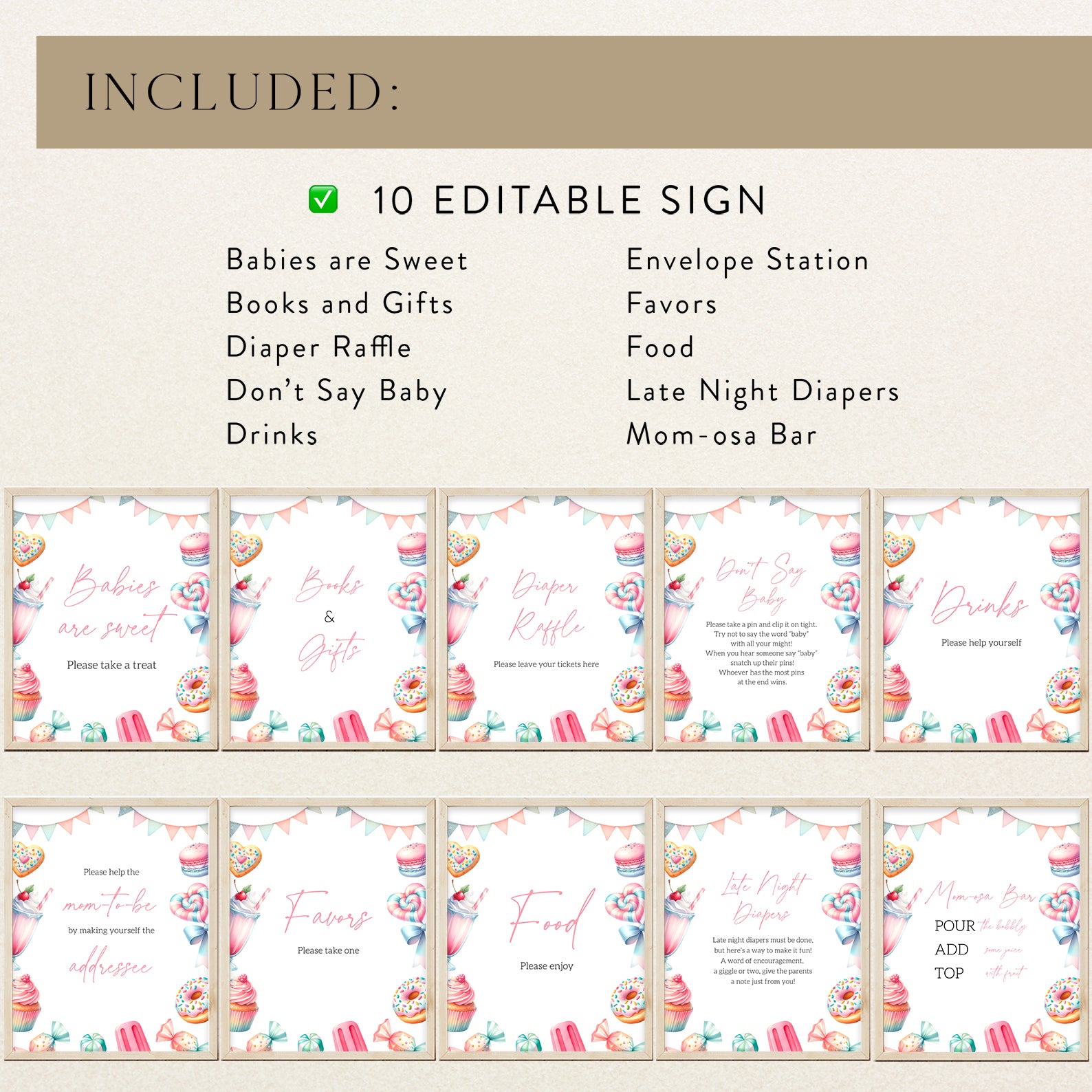 Elevate your baby shower with this set of 10 beautifully designed editable table signs! Featuring soft watercolor details, these printables help guide guests while adding a stylish touch. Signs include “Babies Are Sweet,” “Books and Gifts,” “Diaper Raffle,” “Don’t Say Baby,” “Mom-osa Bar,” and more. Perfect for food stations, games, and special moments, these signs make hosting effortless and elegant.