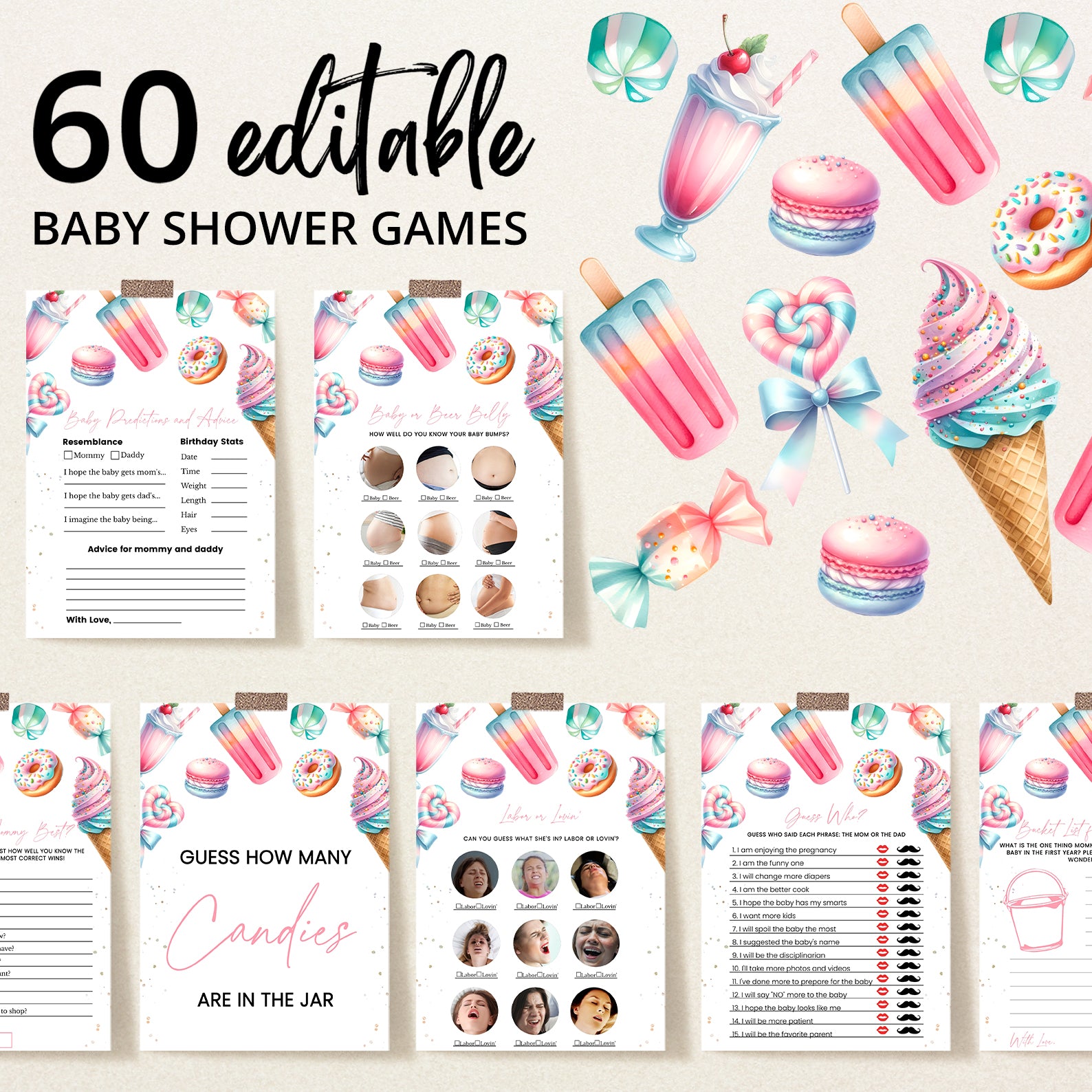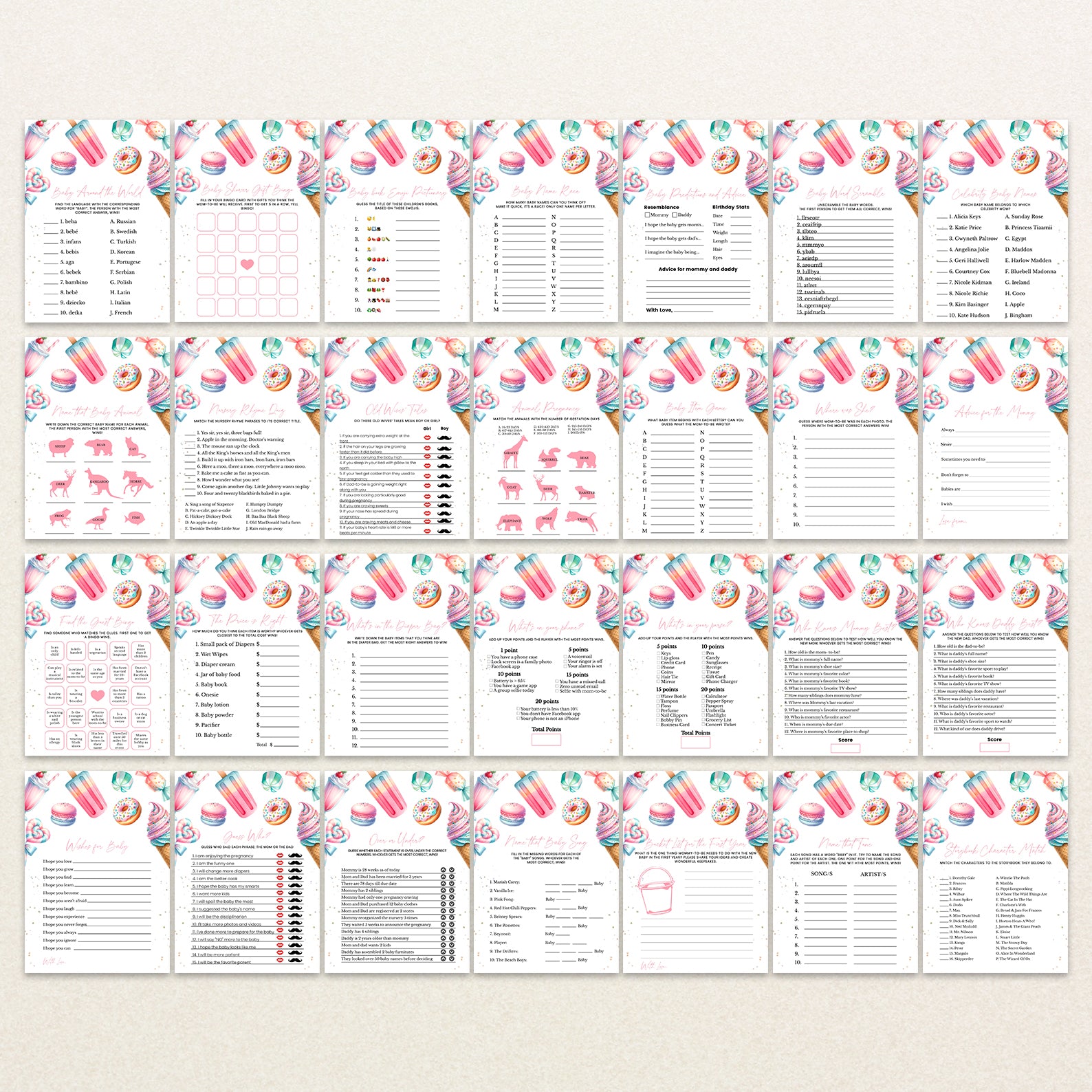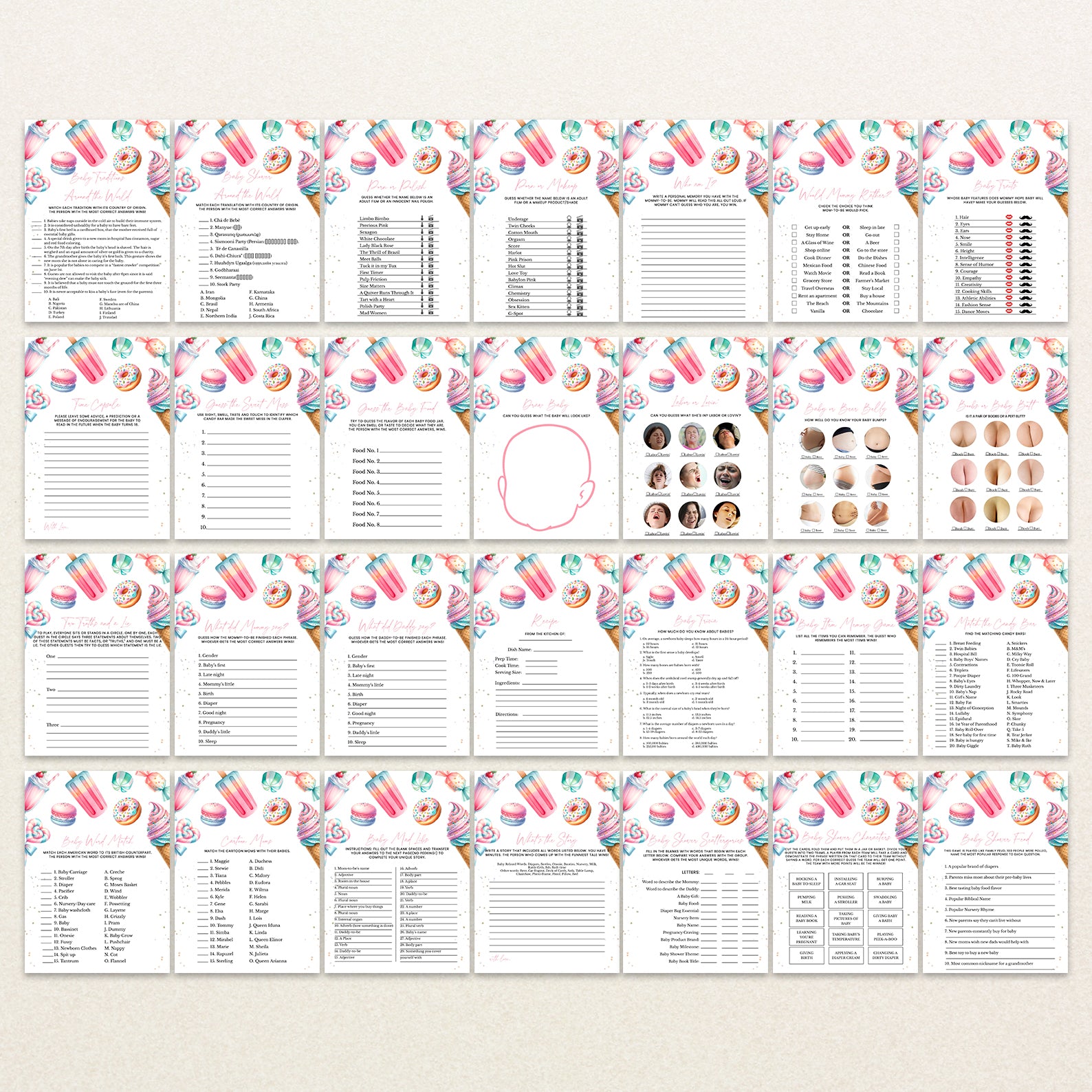 Celebrate the upcoming arrival of your little one with our charming summer baby shower game bundle! Adorned with delightful sweet treats like strawberry milkshakes, macarons, candies, popsicles, ice cream, donuts, and lollipops, this bundle includes 60 fun and engaging baby shower games that will keep your guests entertained. The elegant gold accents on the designs add a touch of sophistication, making this bundle perfect for inviting friends and family to join in the fun and sweetness of your celebration. A wonderful way to make your baby shower unforgettable!