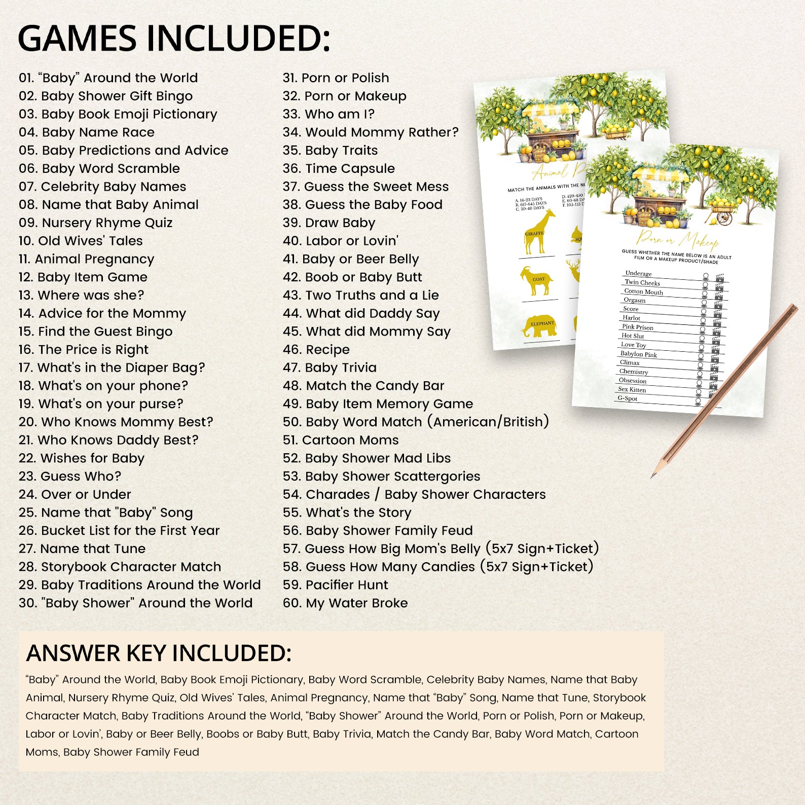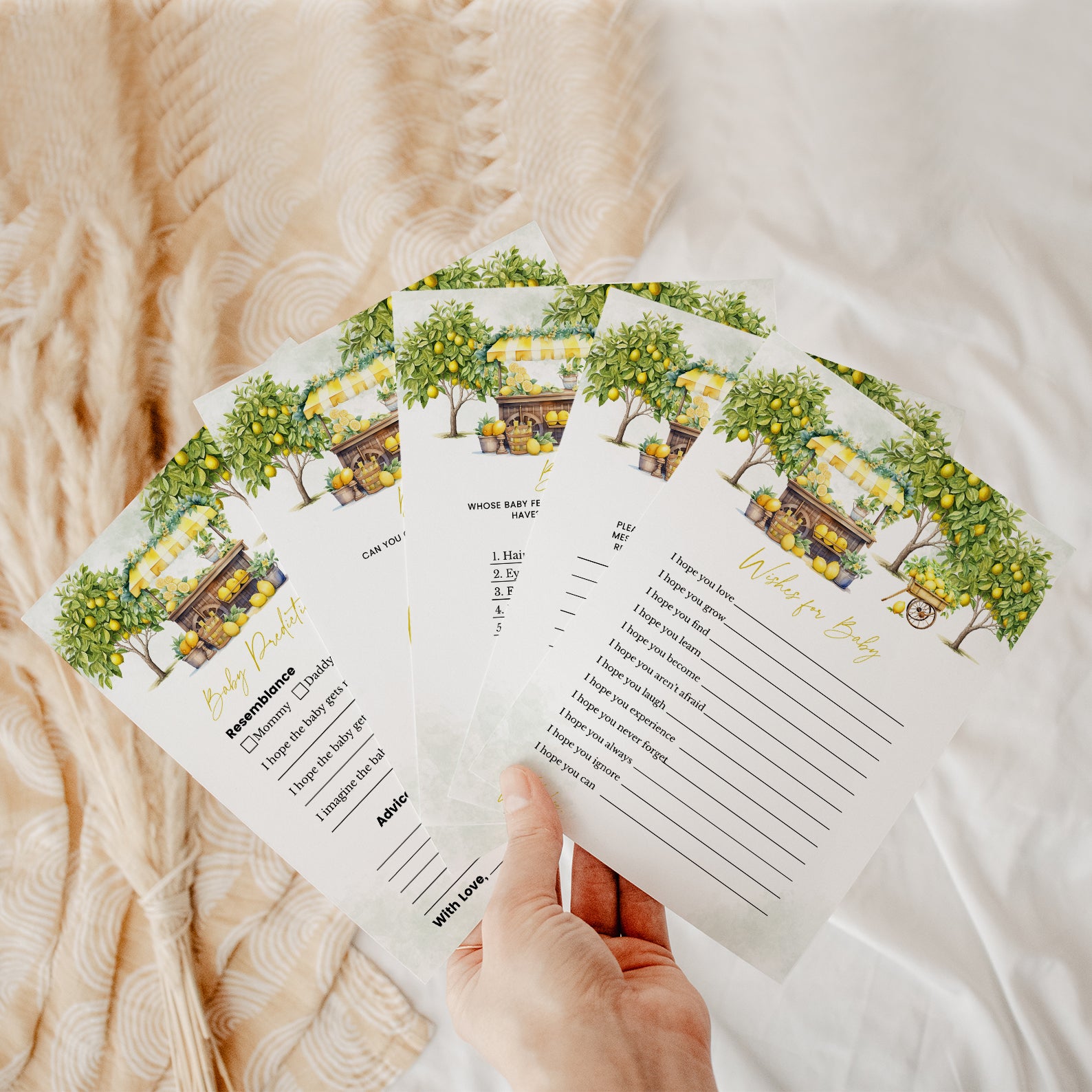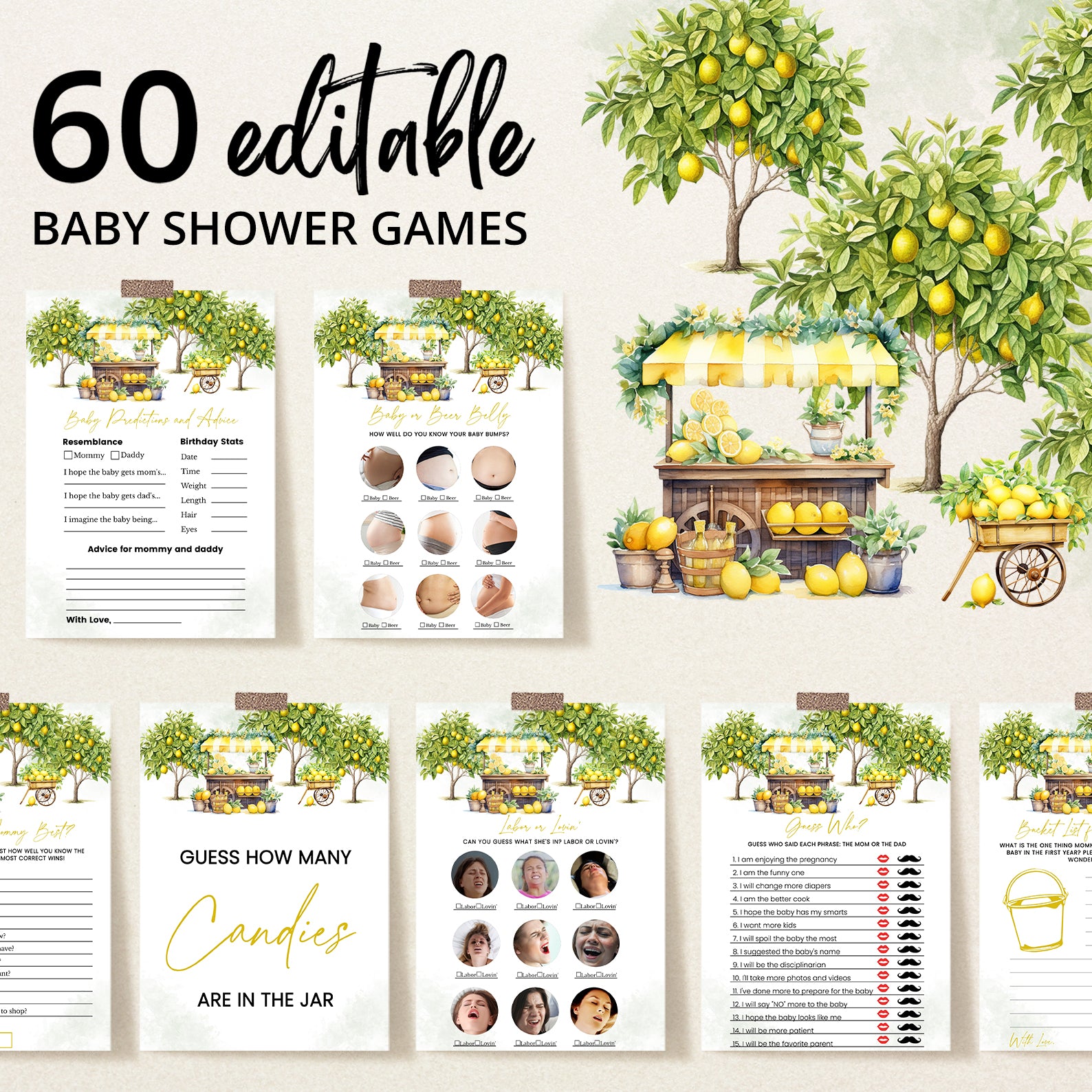 Celebrate the arrival of your little one with our cheerful "Lemon Grove" summer baby shower game bundle! Featuring delightful lemon trees, a whimsical lemon stand, and a rustic wooden cart brimming with fresh lemons, this design captures the essence of sunny days and sweet beginnings. Perfect for a lively and vibrant gathering, this game bundle will keep your guests engaged and entertained, making your baby shower as refreshing and memorable as a glass of lemonade. Invite your loved ones to share in the fun with this sunny, playful game bundle!