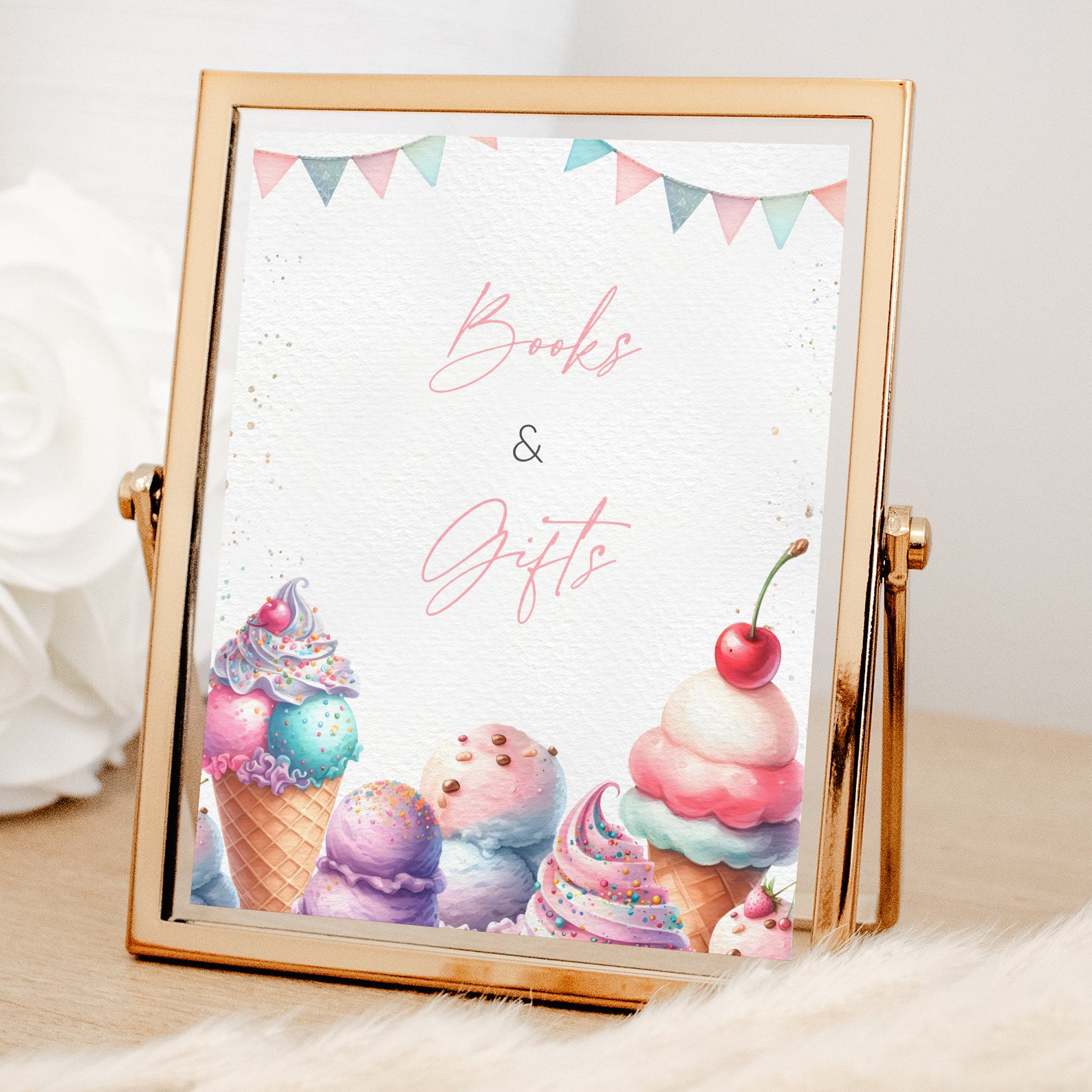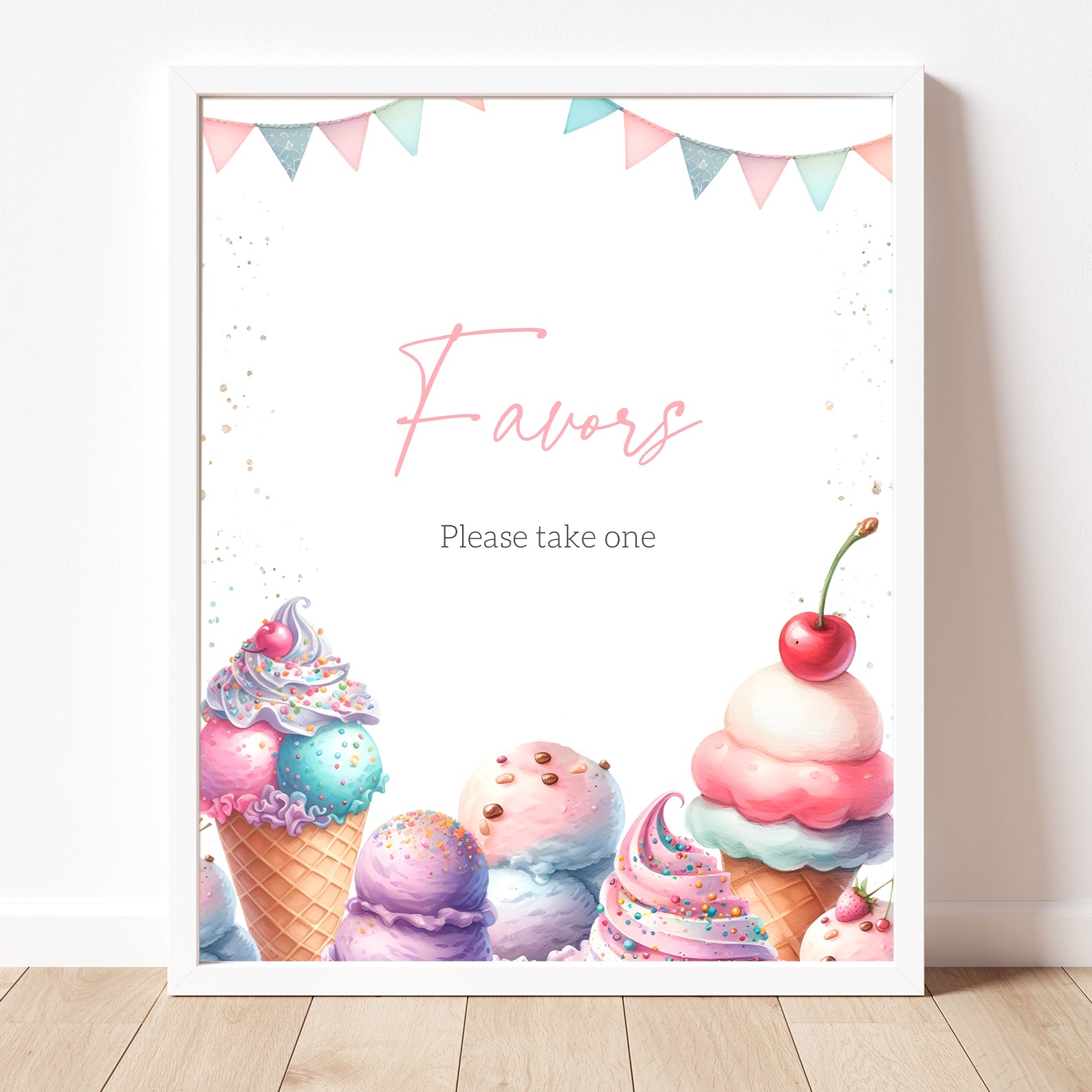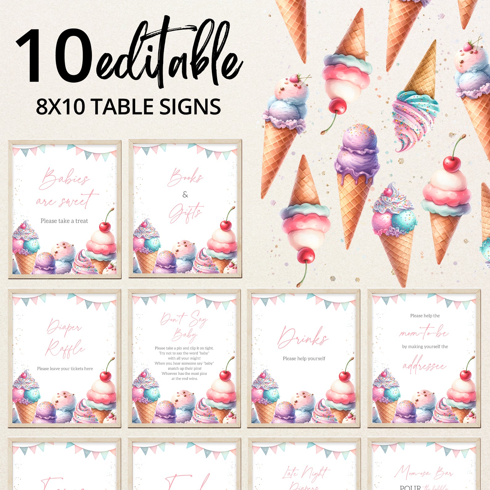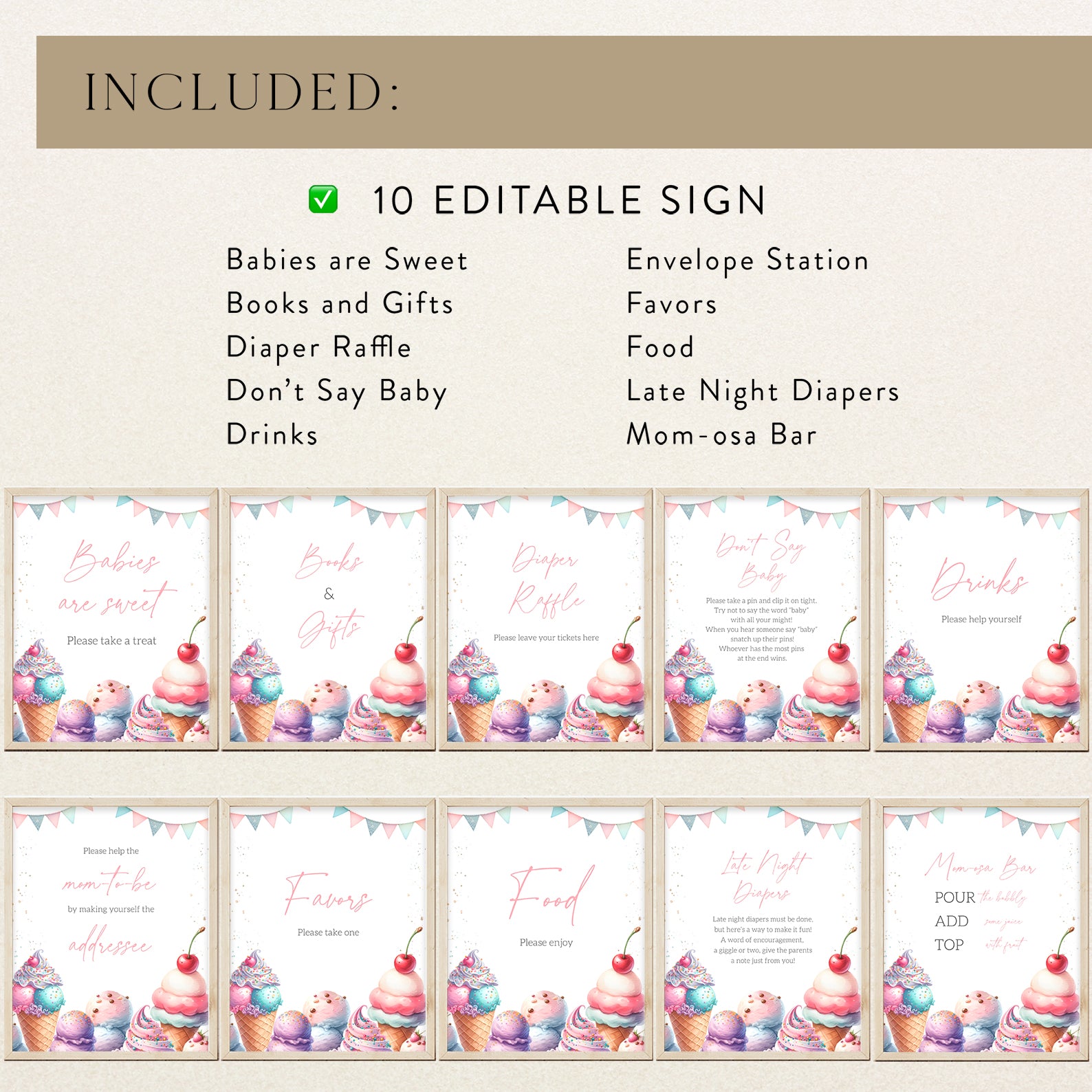Complete your summer baby shower décor with this set of ten editable table signs, designed to match your sweet and refreshing theme! Featuring a watercolor banner, gold accents, and playful ice cream designs, these signs add a fun and whimsical touch to your event. The set includes Balloons, Drinks, Envelope Station, Favors, Food, Late Night Diapers, Ice Cream Bar, Gifts, Mom’s Advice, and Welcome, ensuring a beautifully coordinated and delightful celebration!