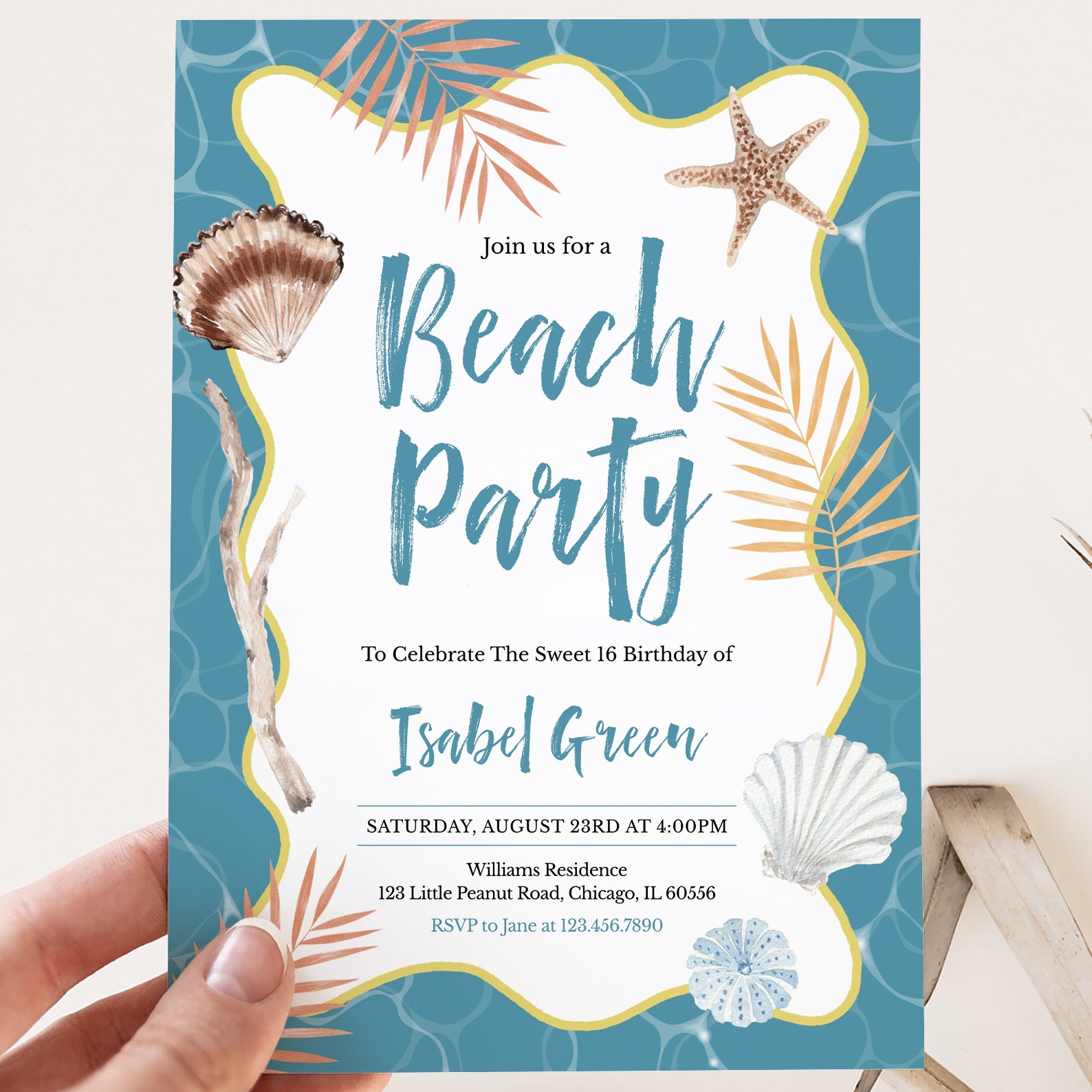 - Purchase this Beach Party Invitation: Scalloped Design with Seashells & Palm template