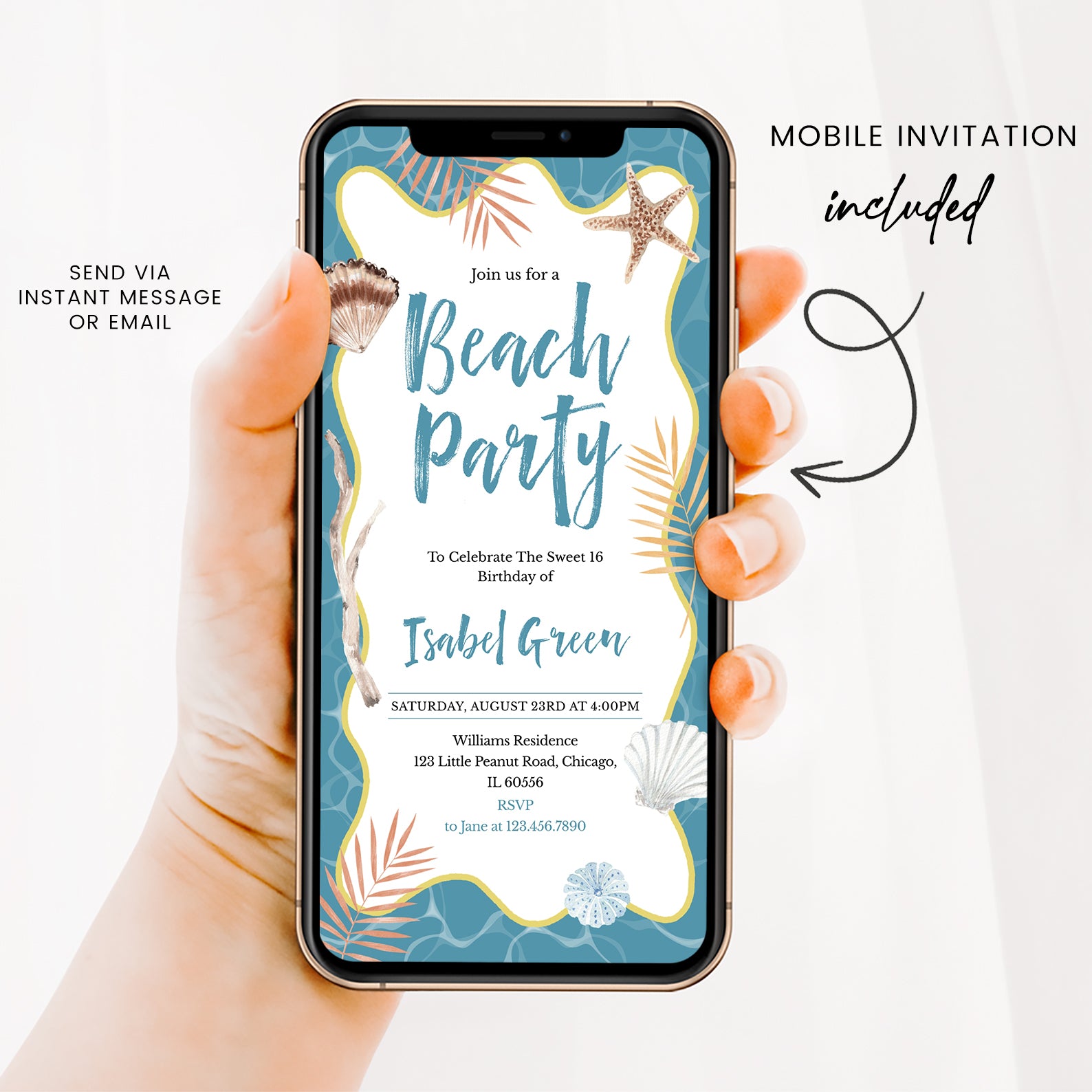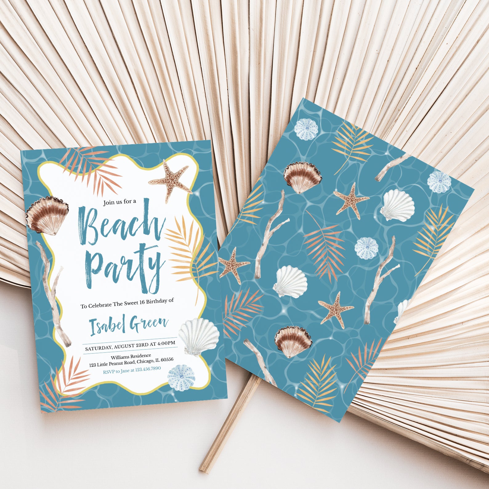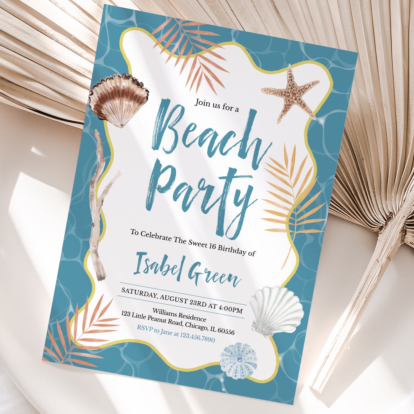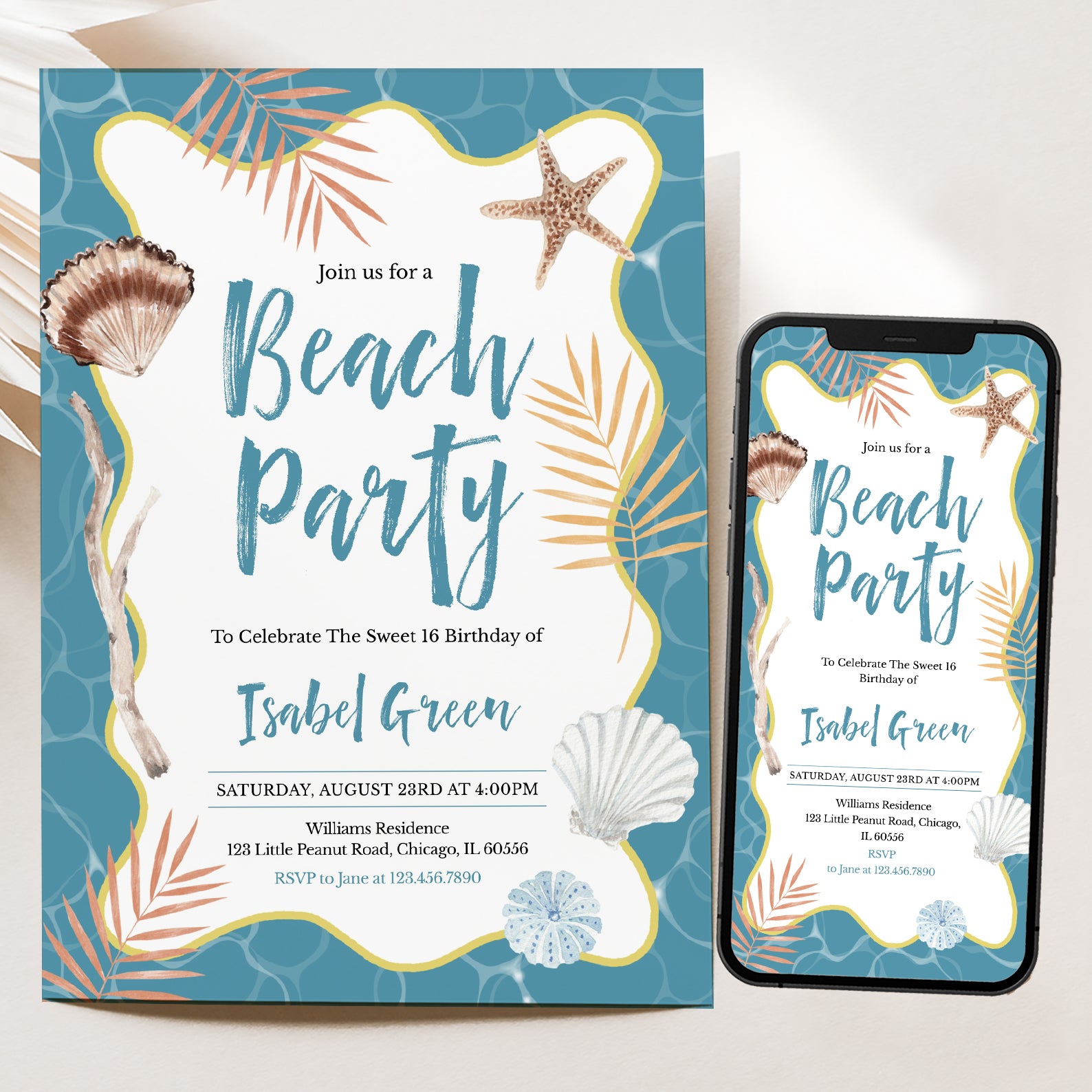 Dive into summer fun with our vibrant digital invitation for your beach birthday party! This beautifully designed scalloped-shaped invite features a refreshing pool water background, adorned with charming seashells and lush palm leaves, setting the perfect tropical tone for your celebration. Make a splash and invite your guests to join in the sun-soaked festivities with this eye-catching and playful design!