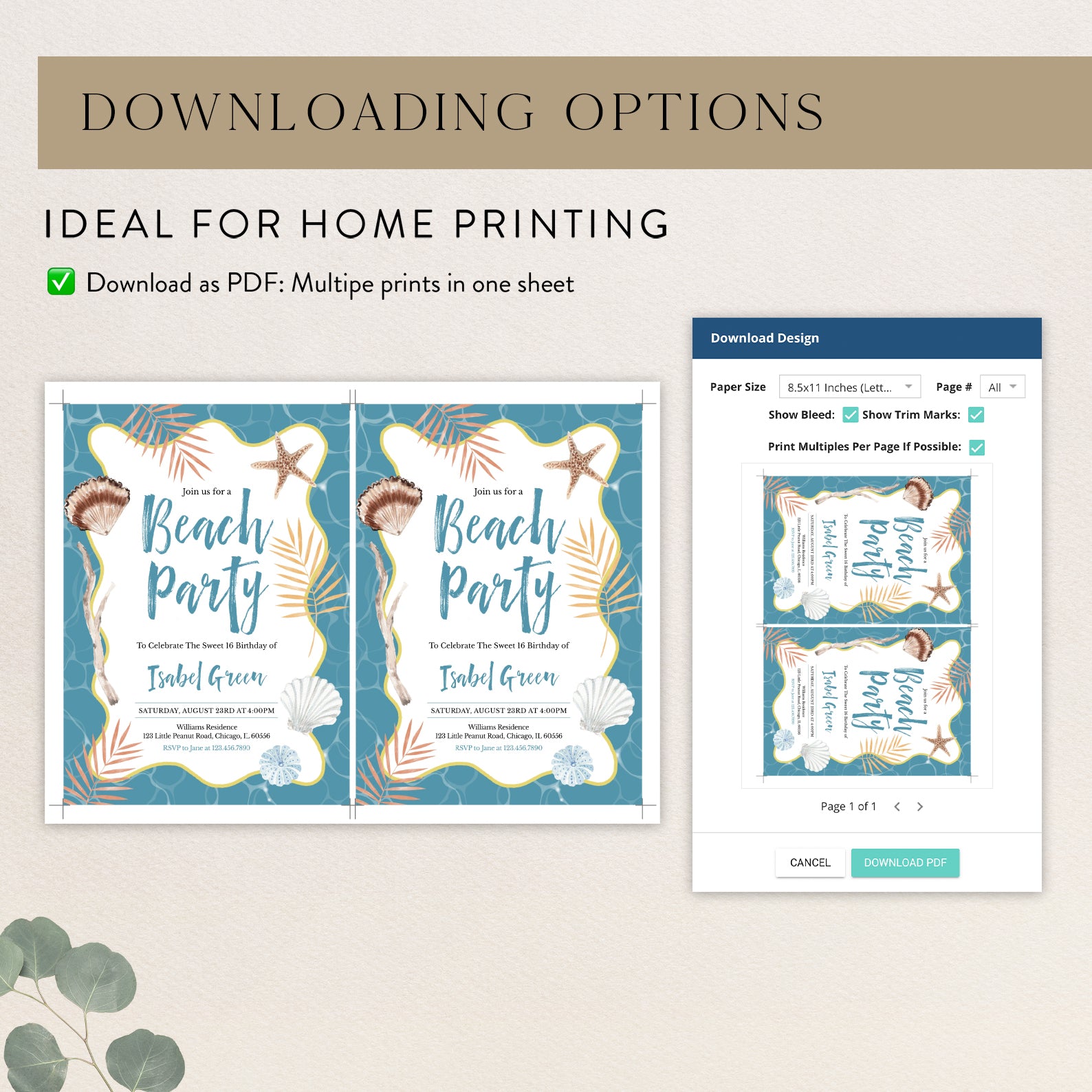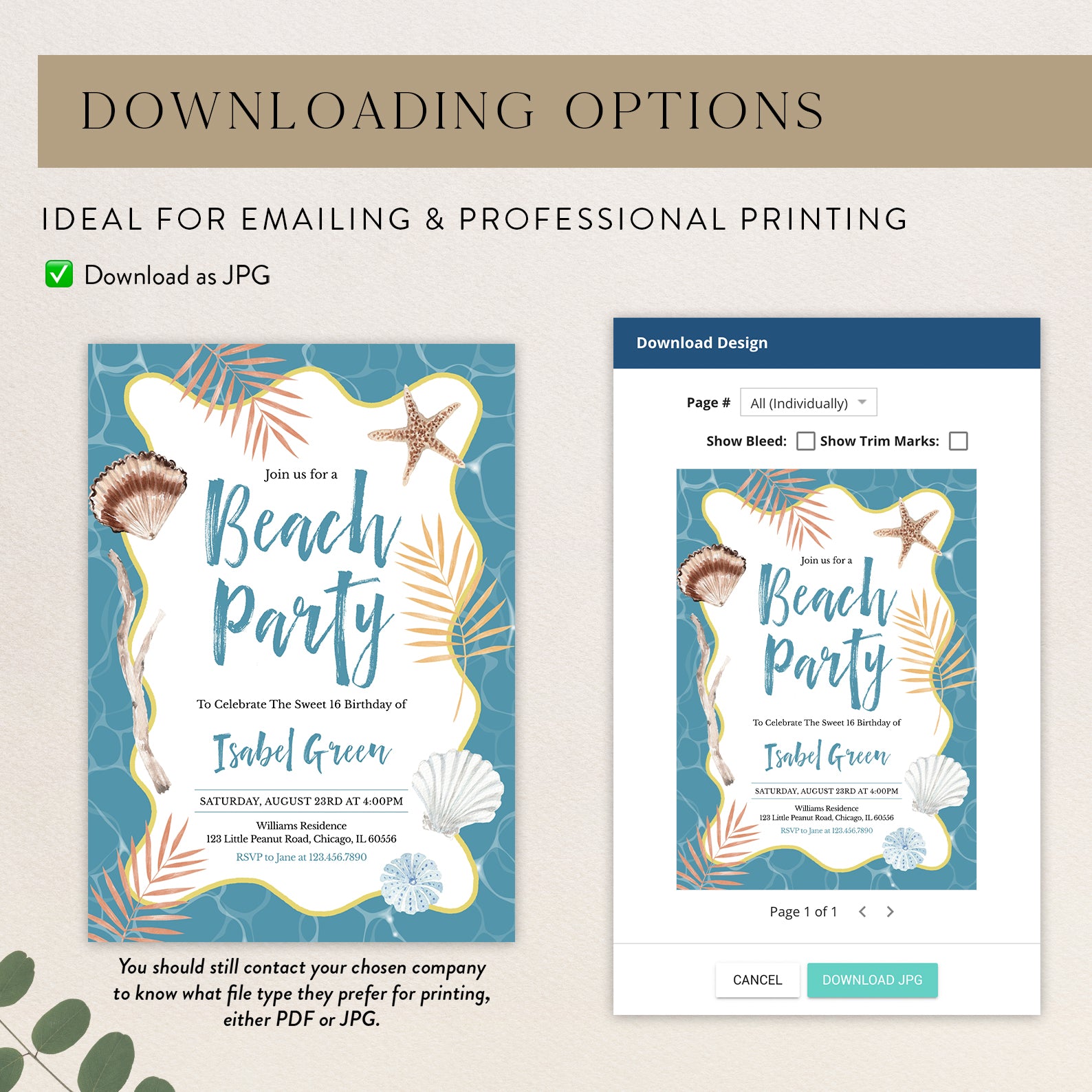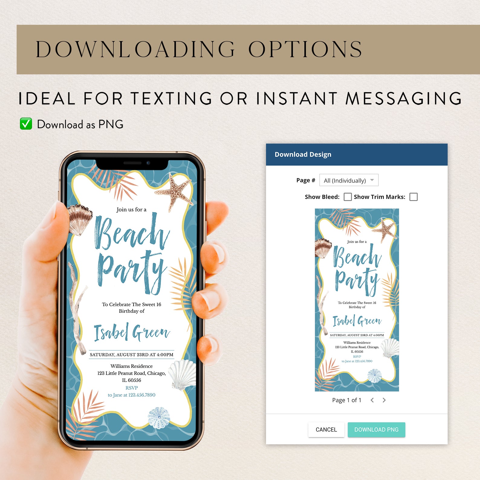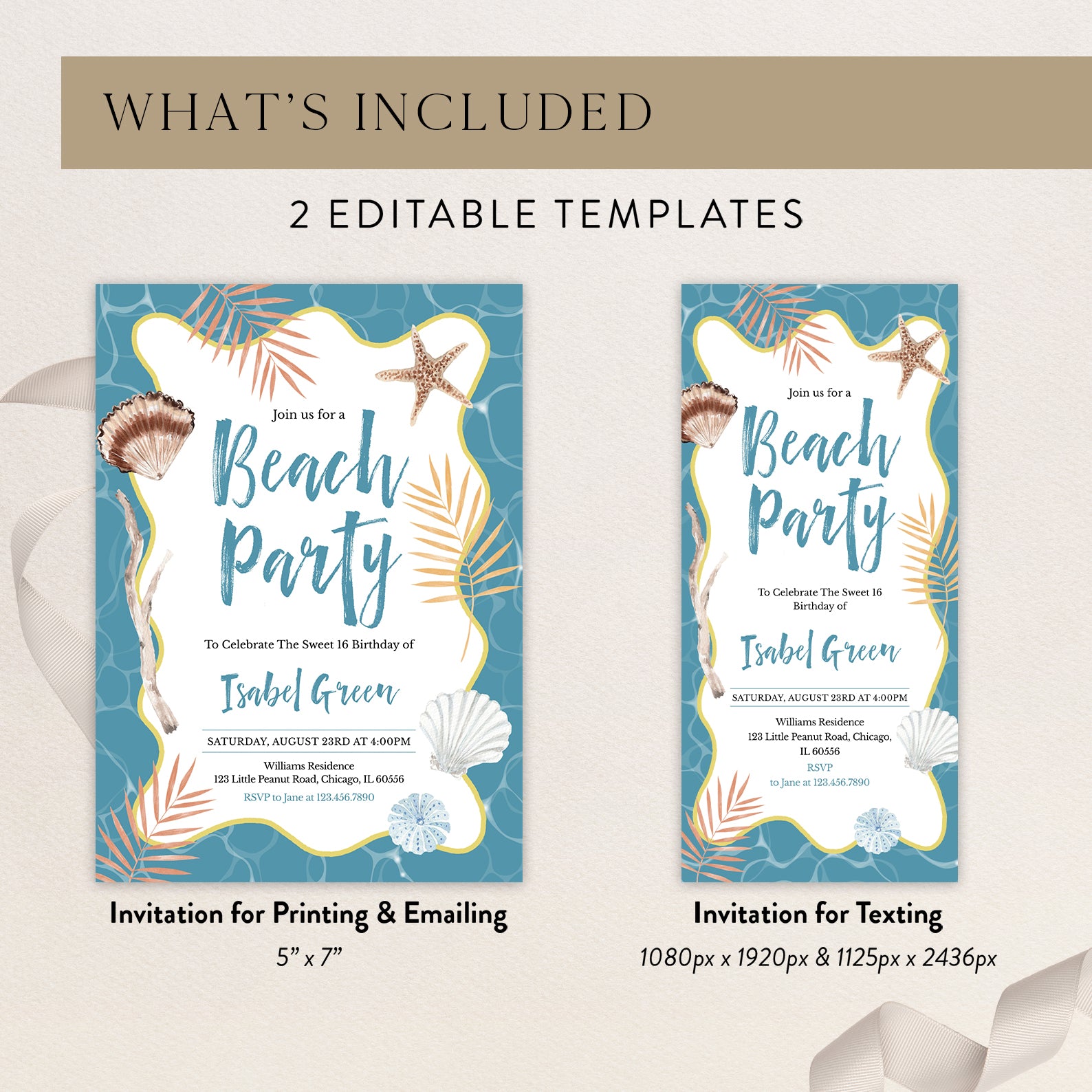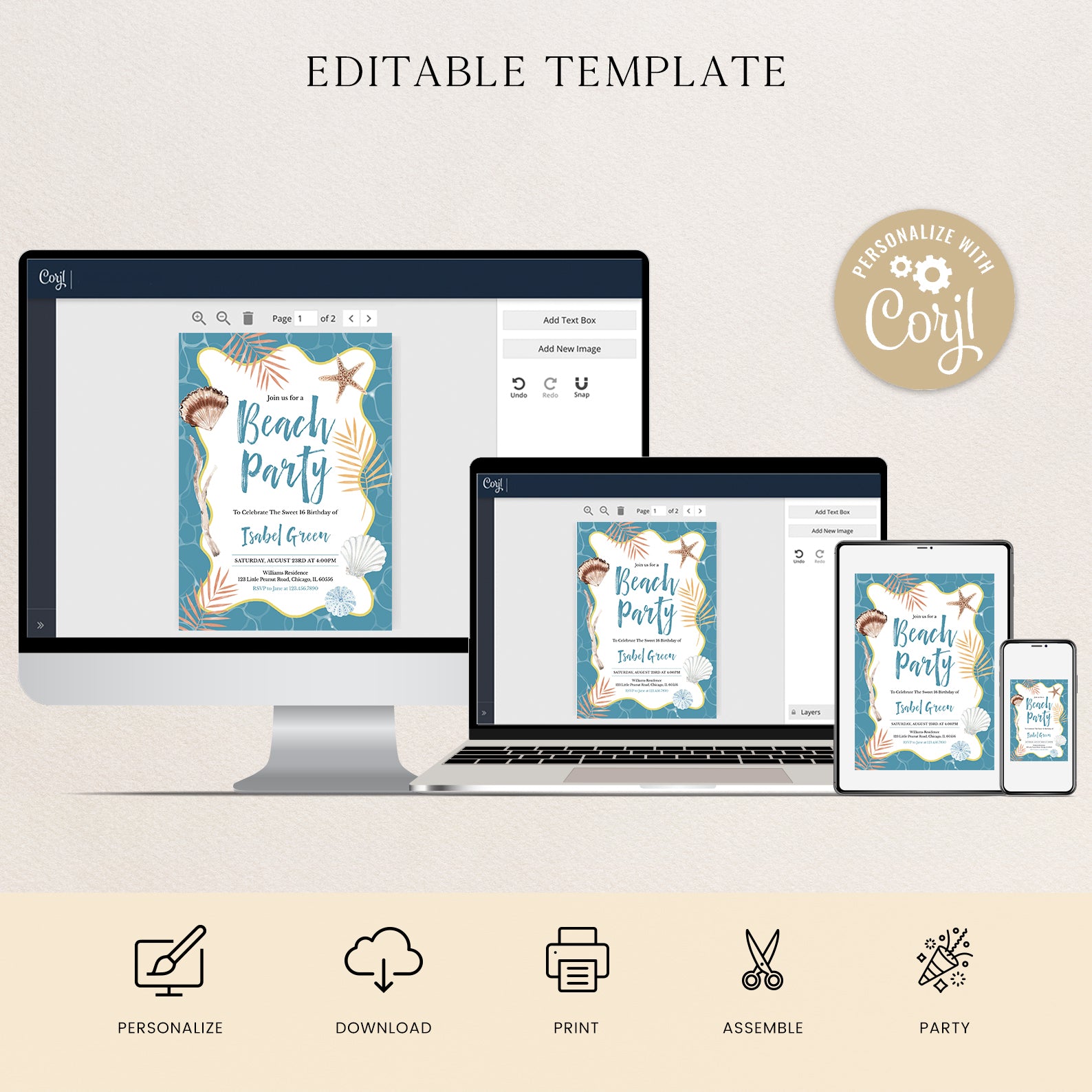 Dive into summer fun with our vibrant digital invitation for your beach birthday party! This beautifully designed scalloped-shaped invite features a refreshing pool water background, adorned with charming seashells and lush palm leaves, setting the perfect tropical tone for your celebration. Make a splash and invite your guests to join in the sun-soaked festivities with this eye-catching and playful design!