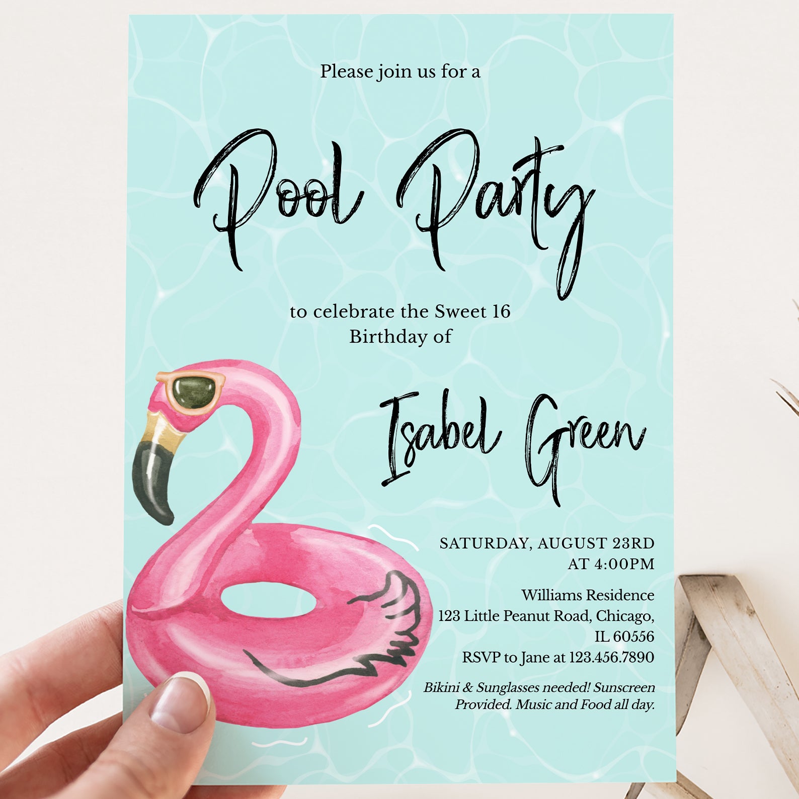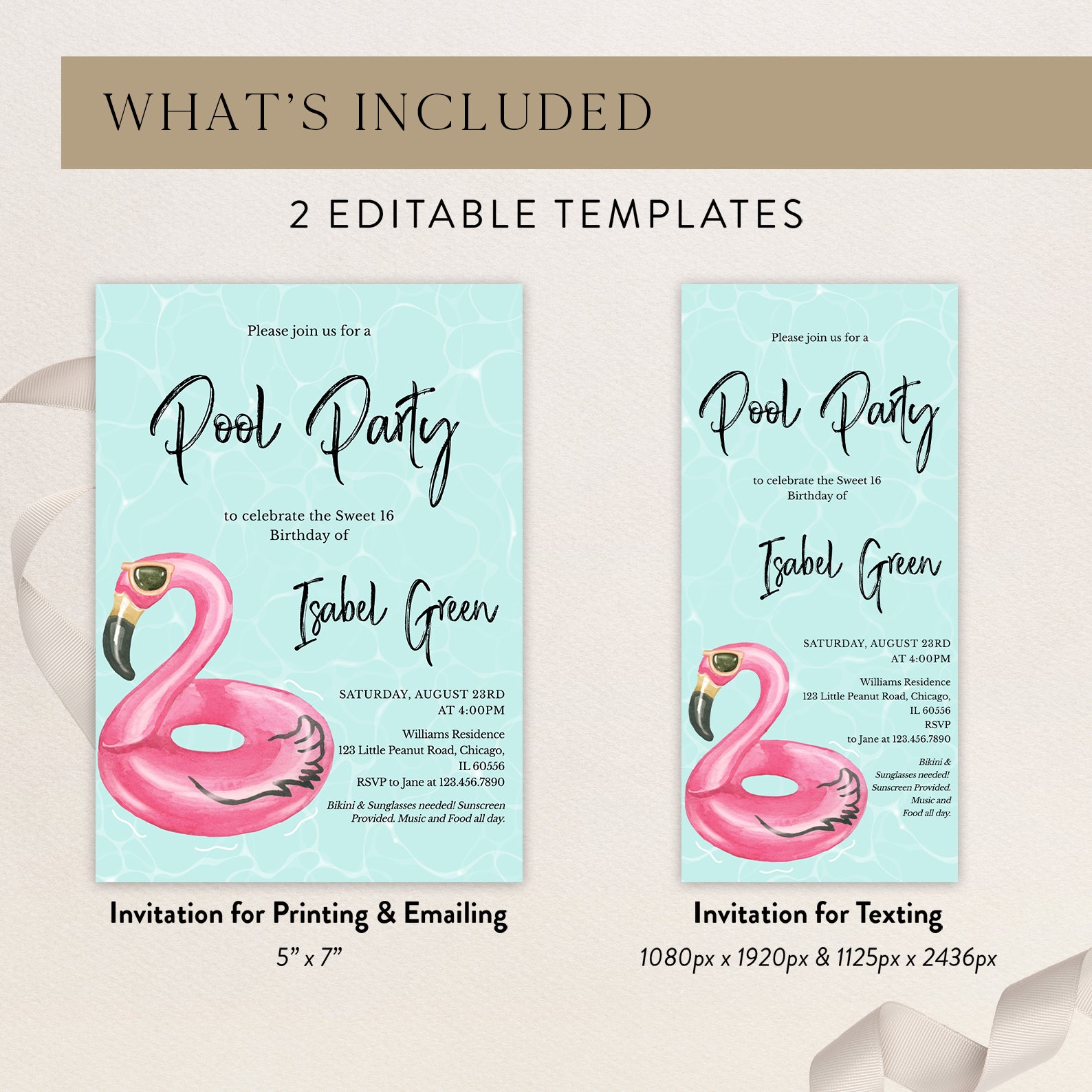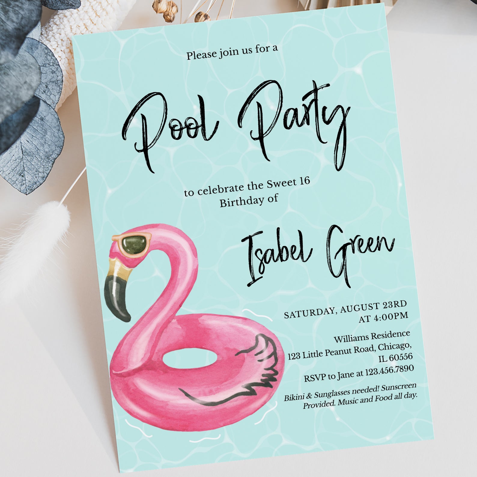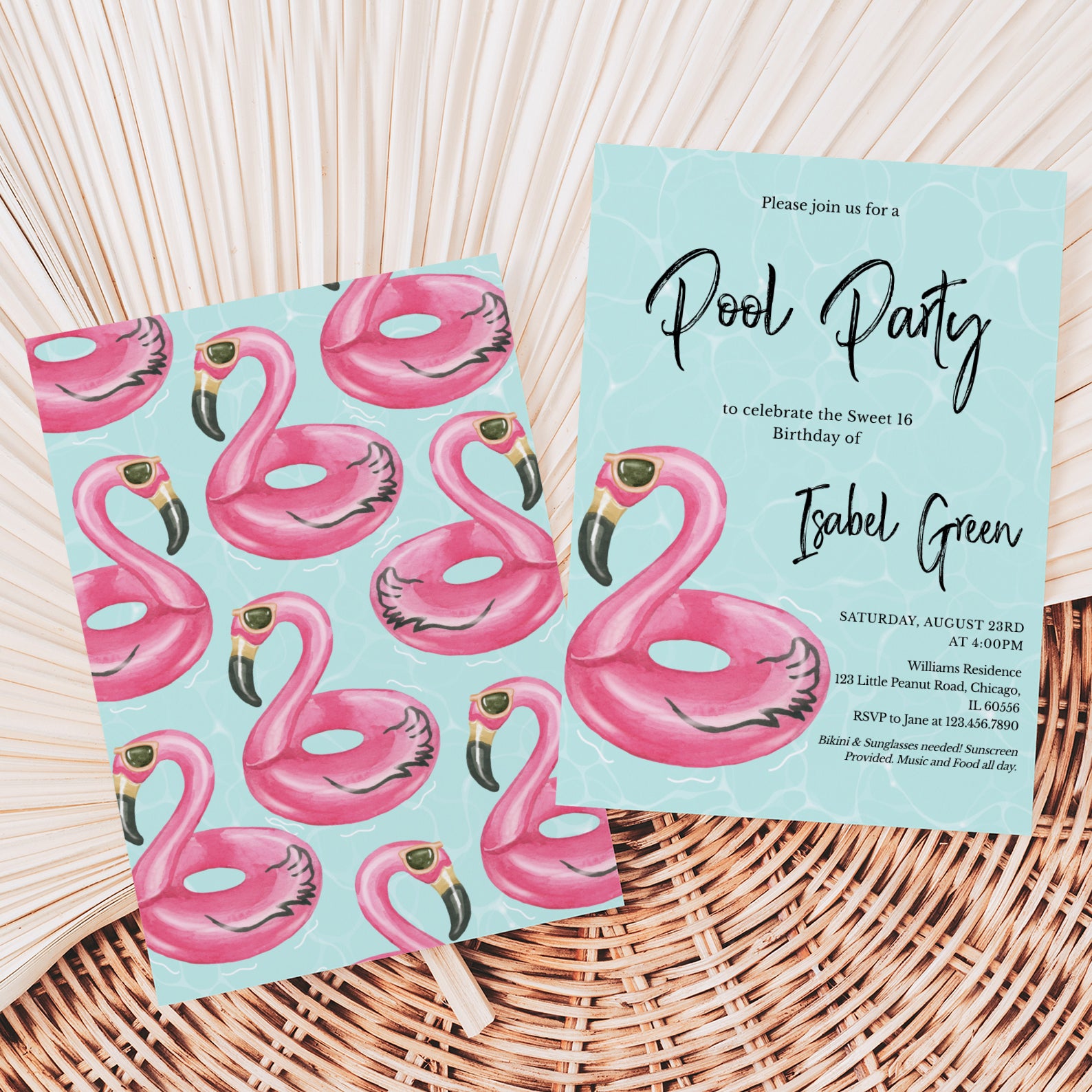 - Purchase this Pool Party Birthday Digital Invitation with Pink Flamingo Float template