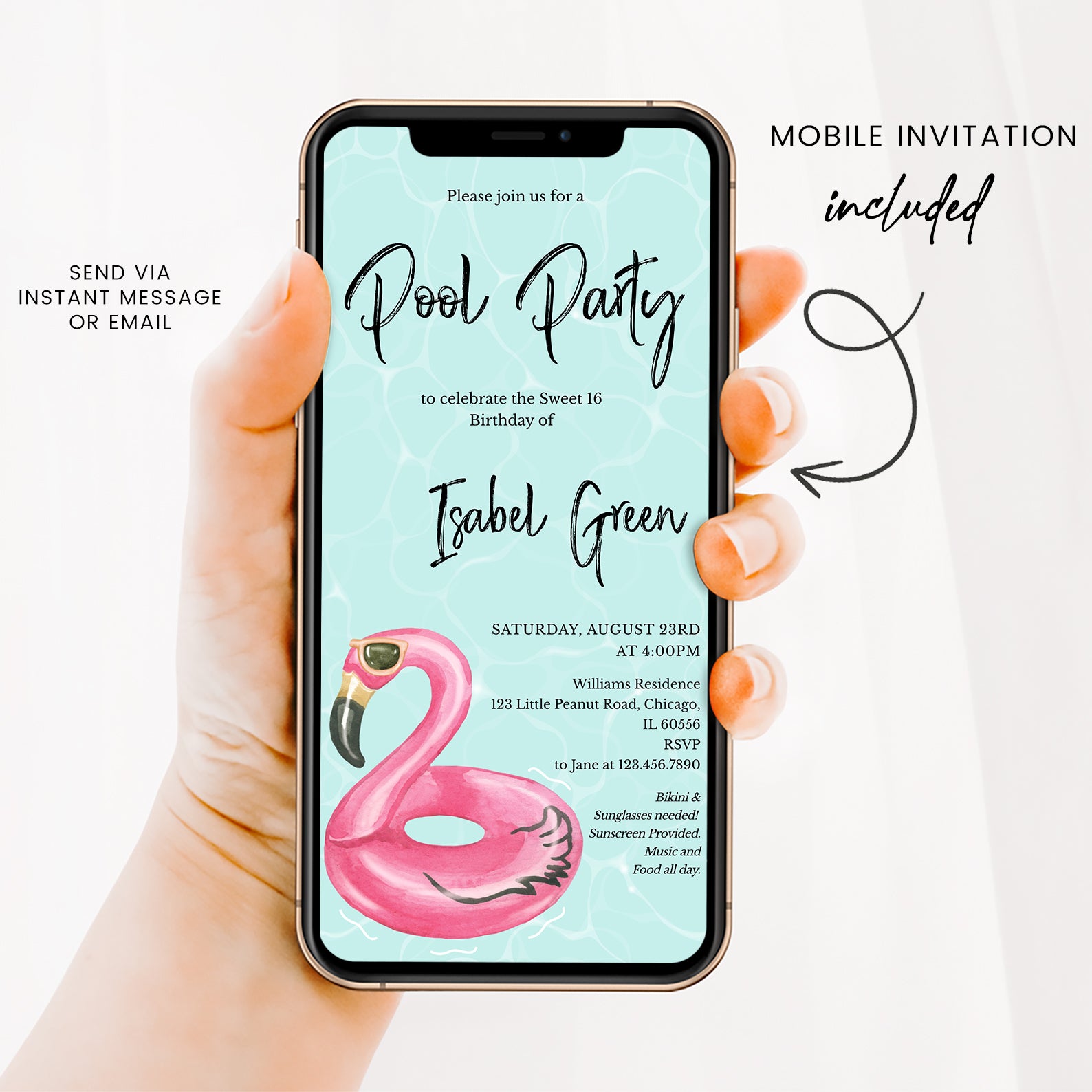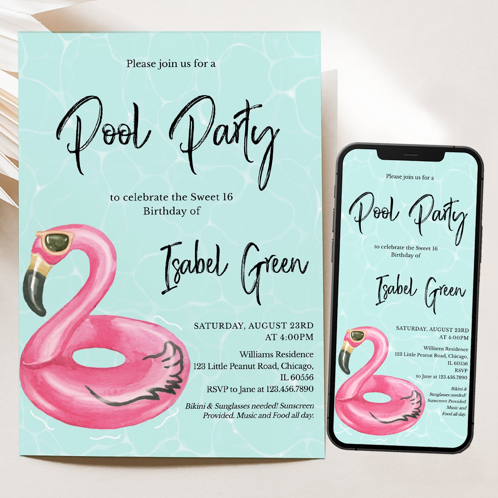 Dive into summer fun with our vibrant digital invitation for a 16th birthday pool party, featuring a playful pink flamingo float! Perfect for celebrating birthdays under the sun, this eye-catching design sets the tone for a splash-tastic celebration. Easy to customize and share, it ensures your guests are ready for a day filled with laughter, sunshine, and unforgettable memories. Make your summer birthday unforgettable with this delightful invitation!