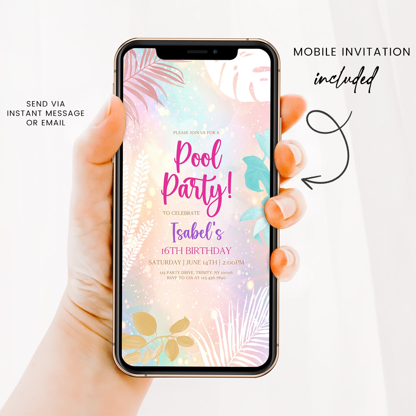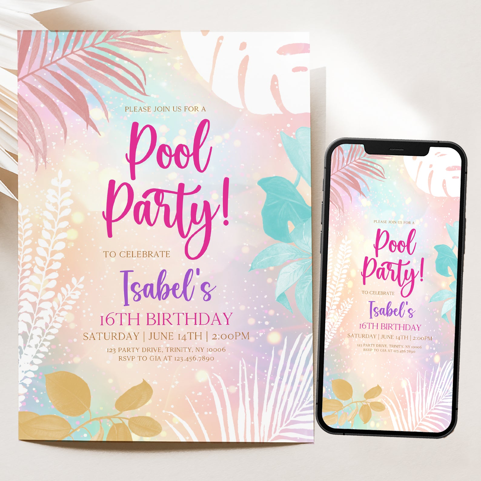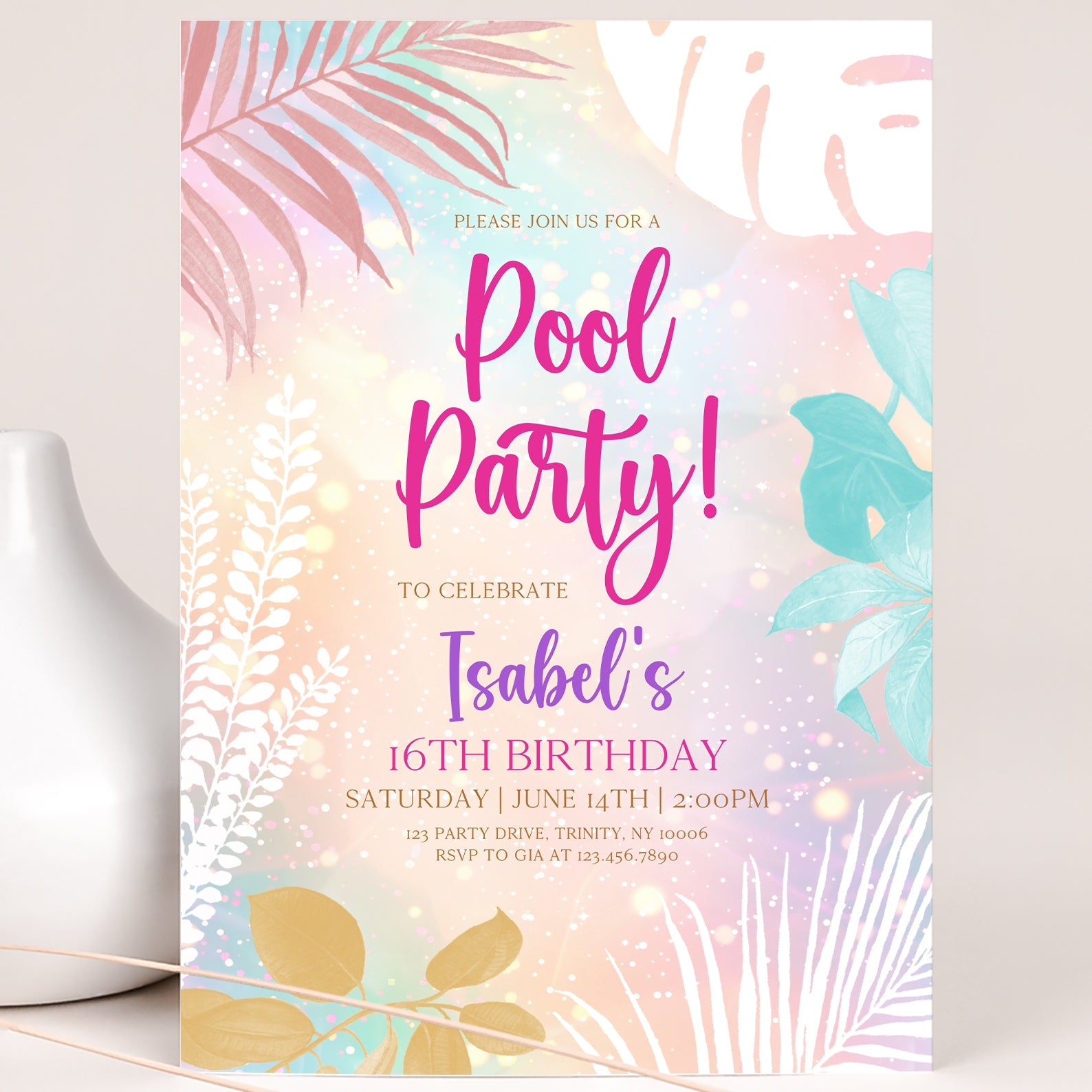 Pool Party Summer Birthday Digital Invitation with Pine Leaves