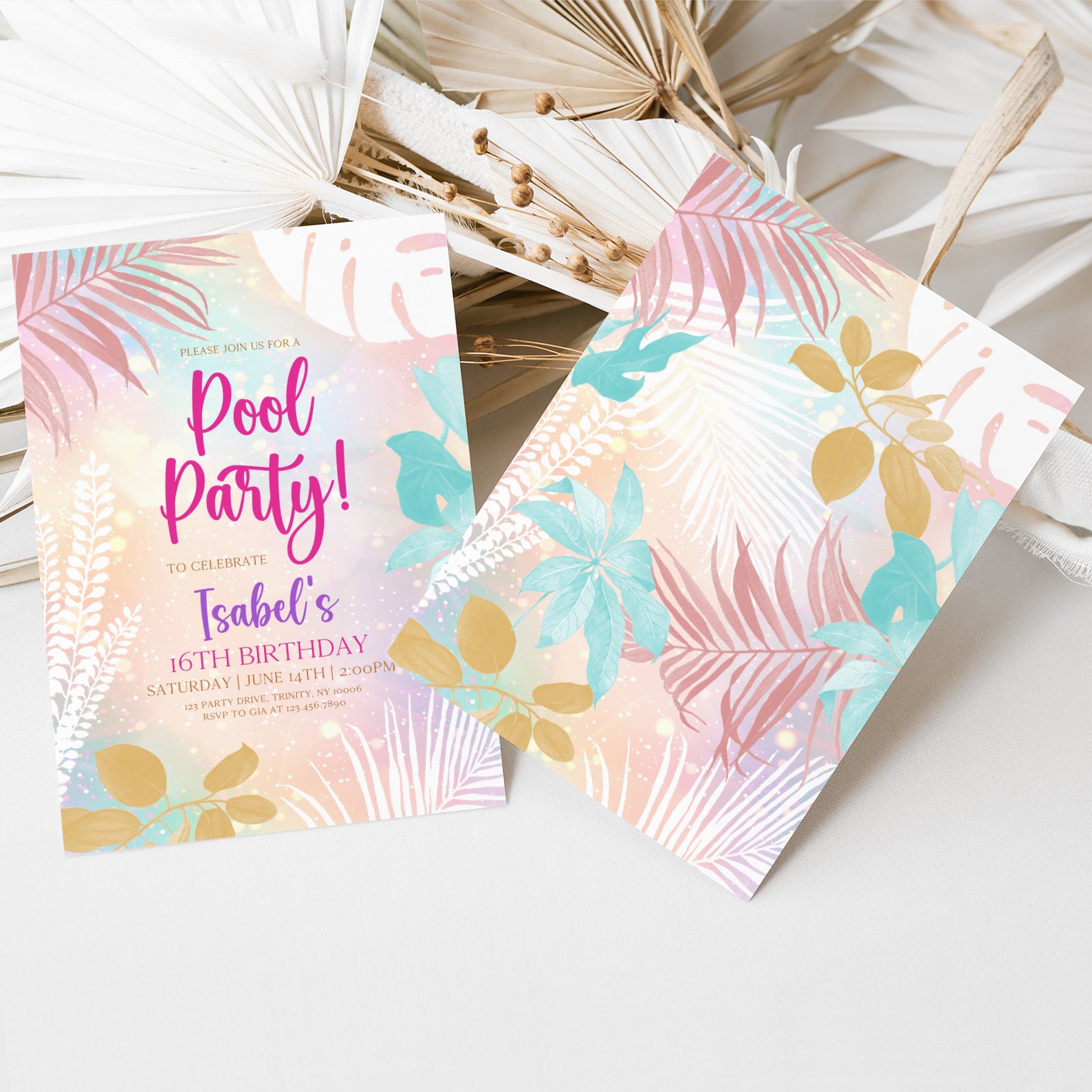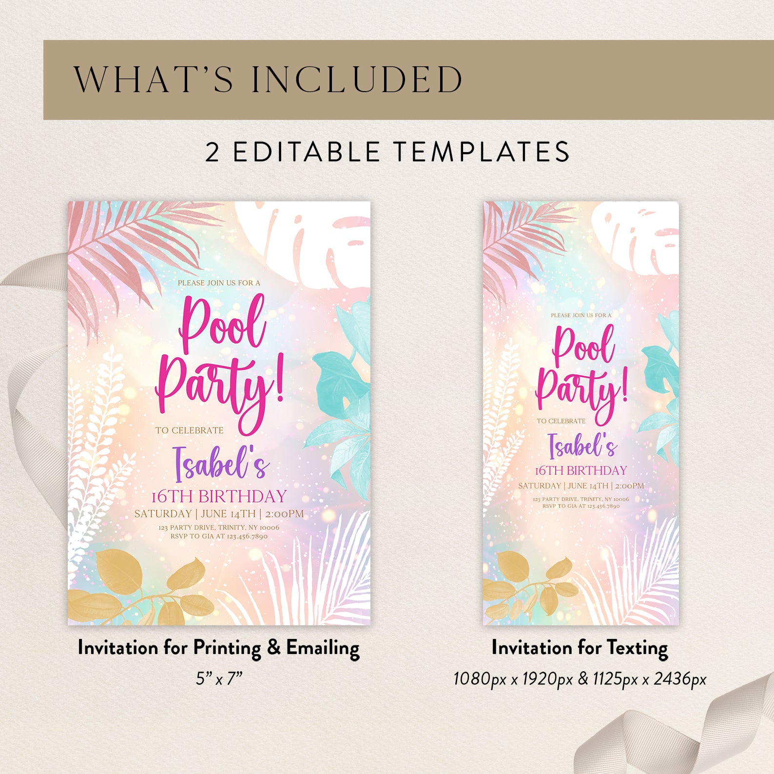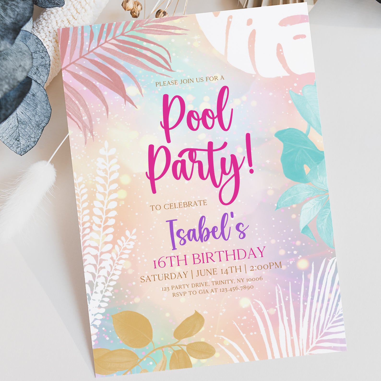 - Purchase this Pool Party Summer Birthday Digital Invitation with Pine Leaves template