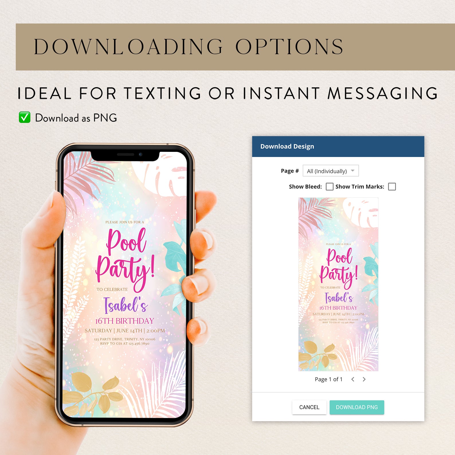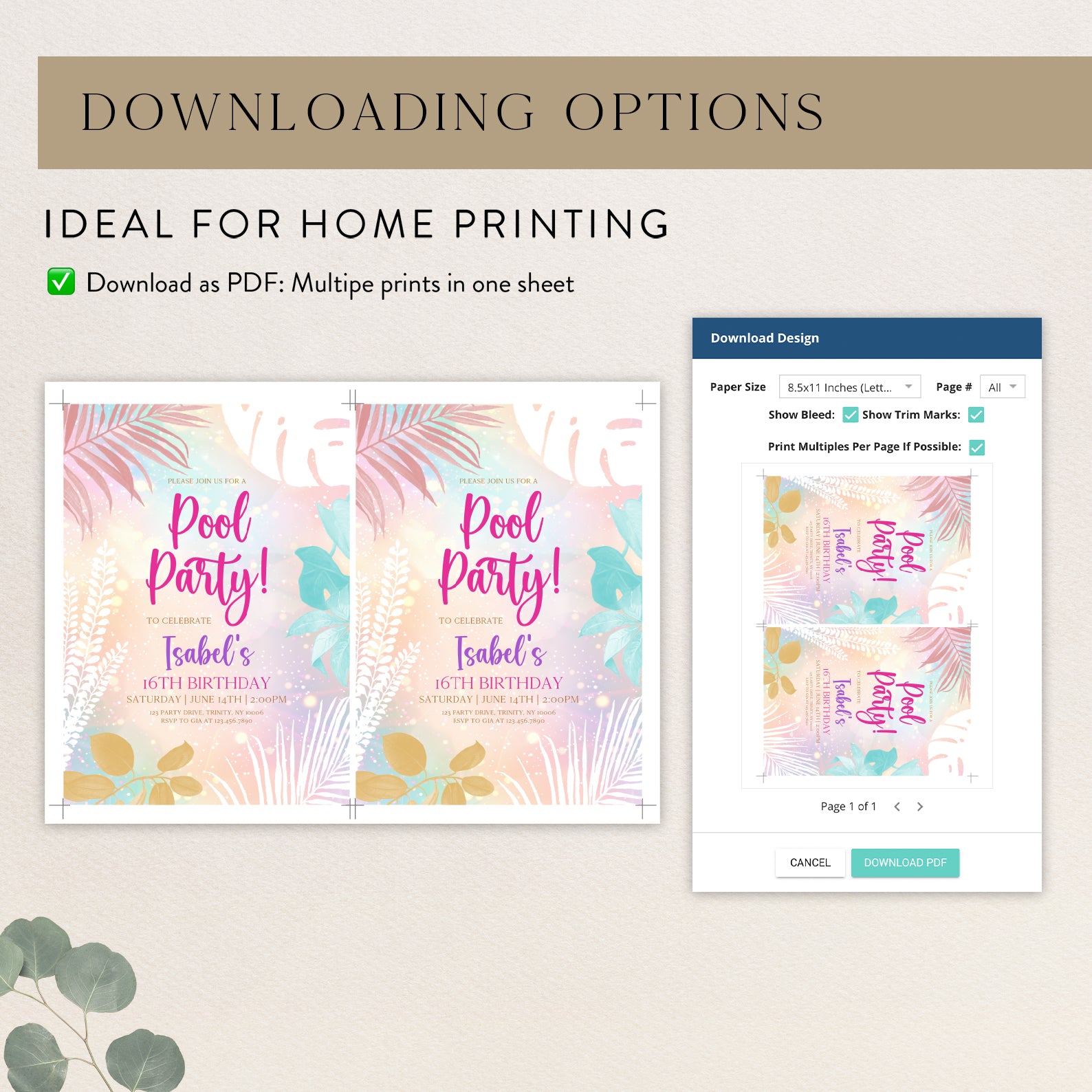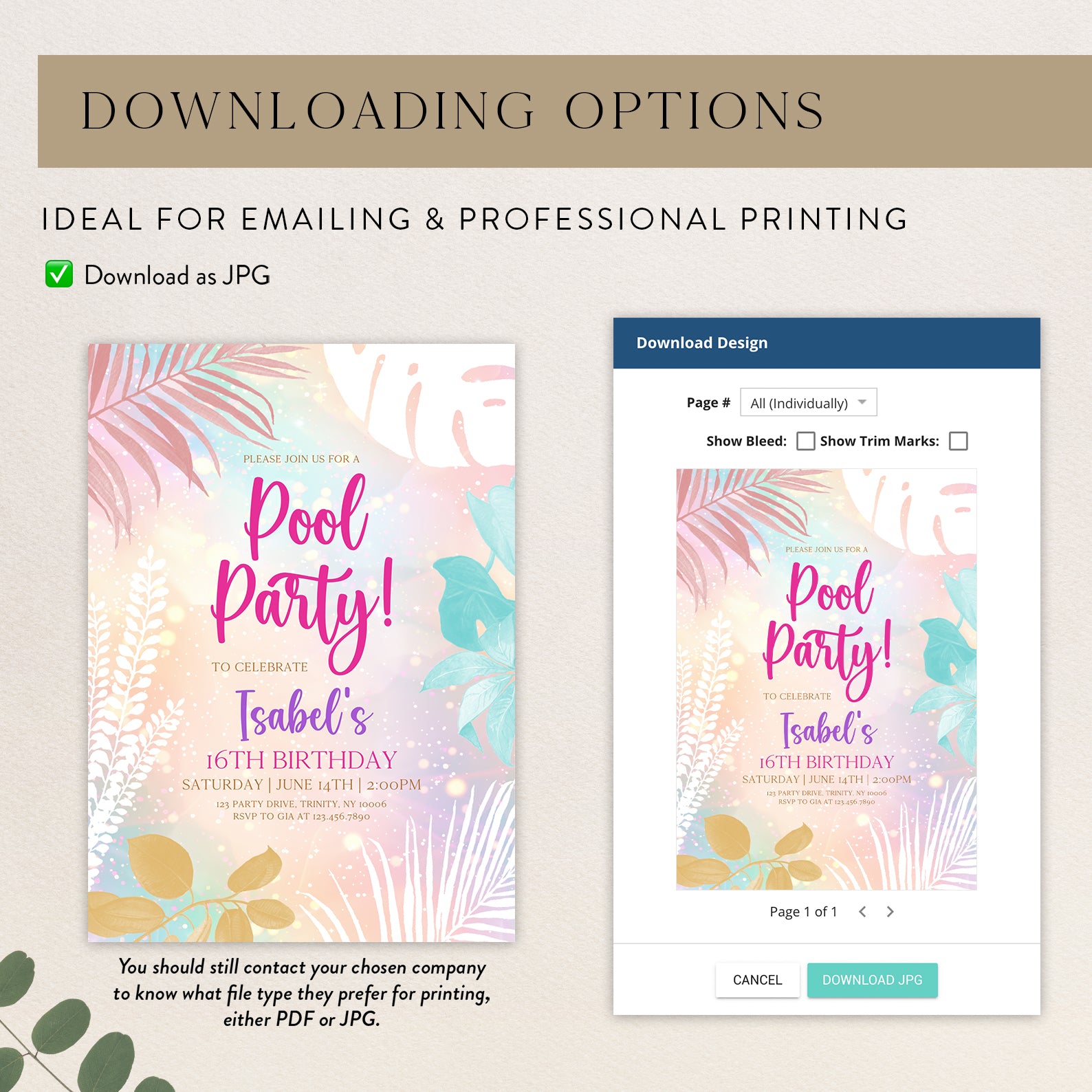 - Purchase this Pool Party Summer Birthday Digital Invitation with Pine Leaves template