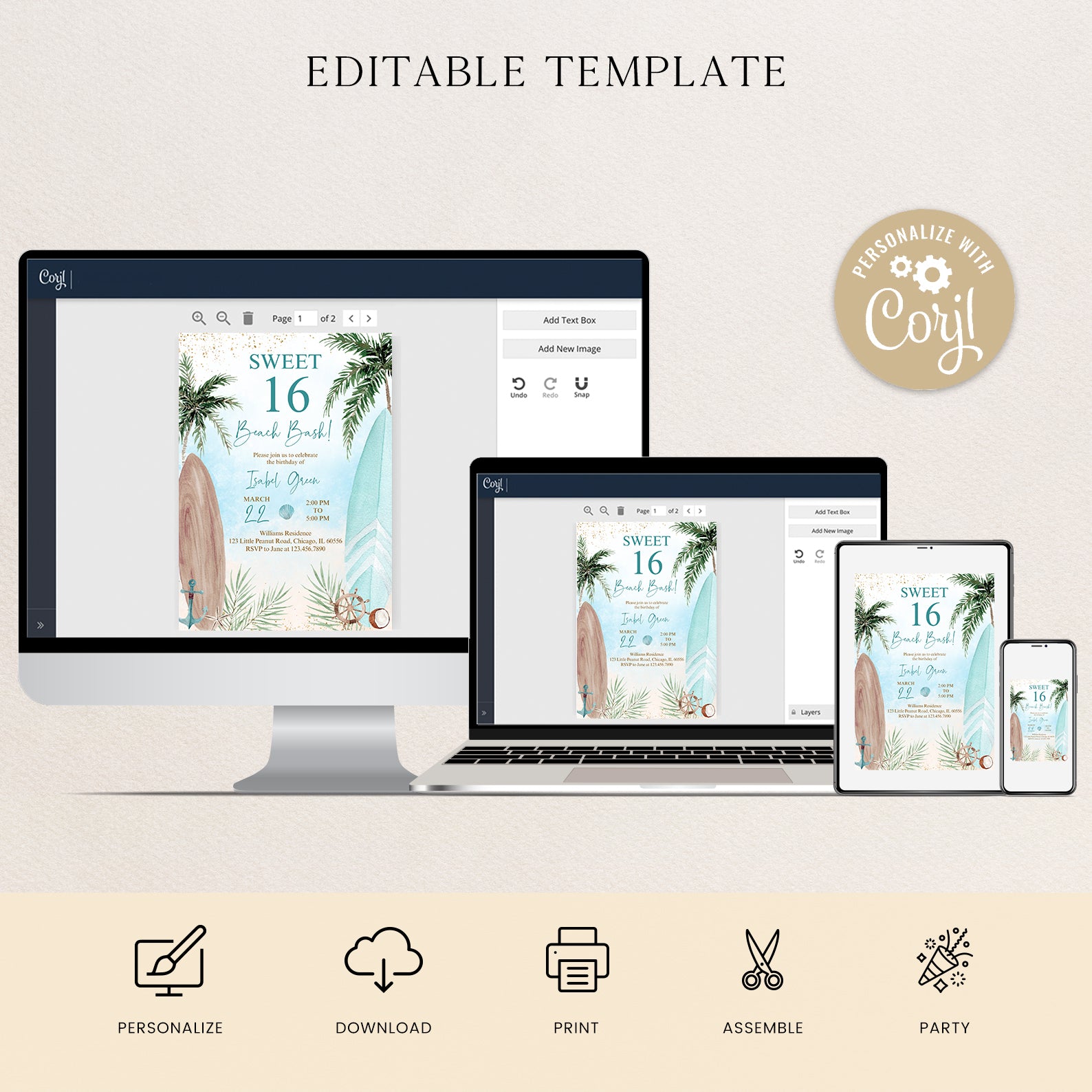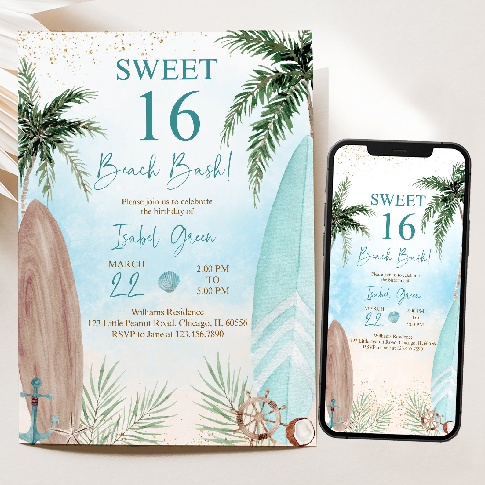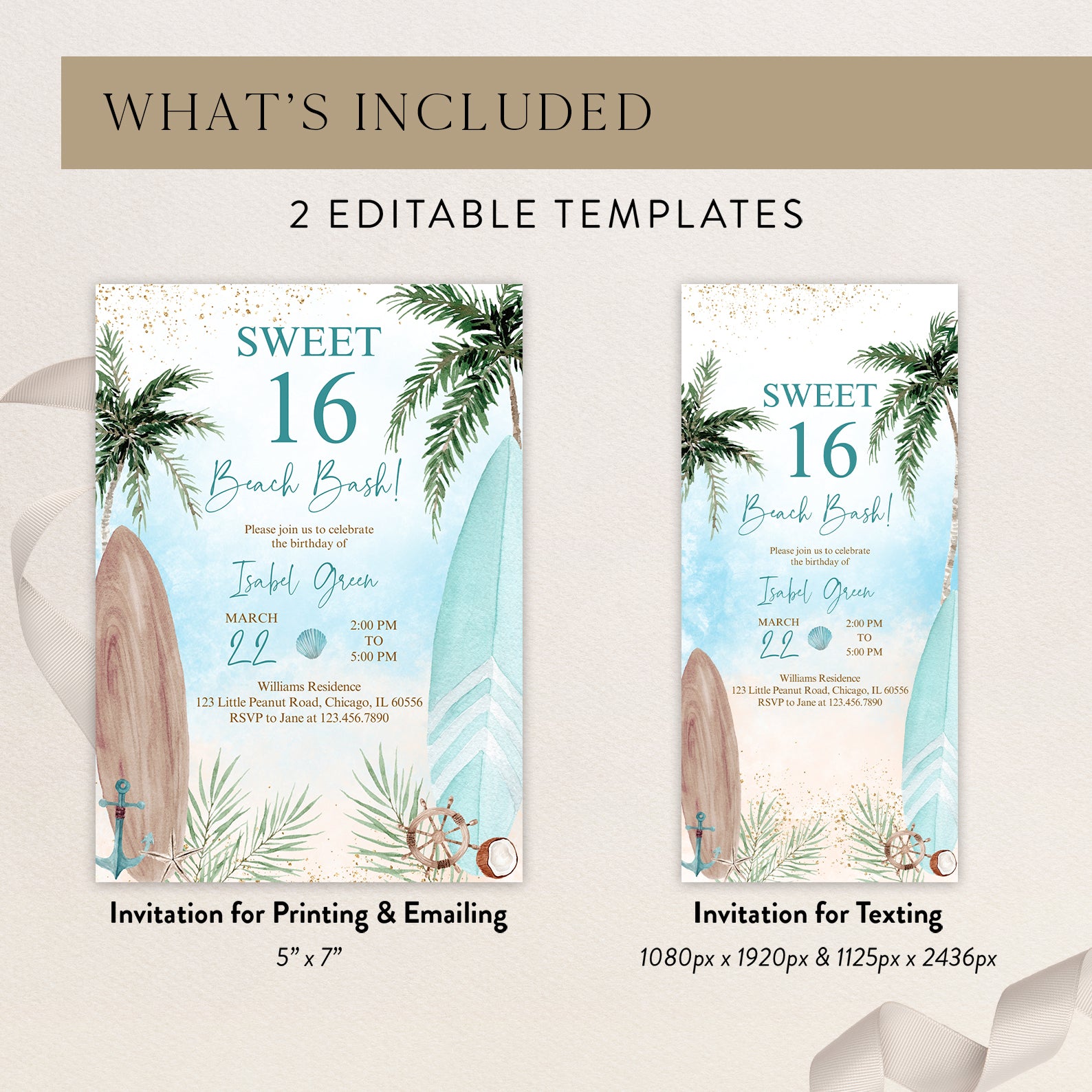 - Purchase this Sweet 16 Beach Bash Invitation: Tropical Surf Party Theme template