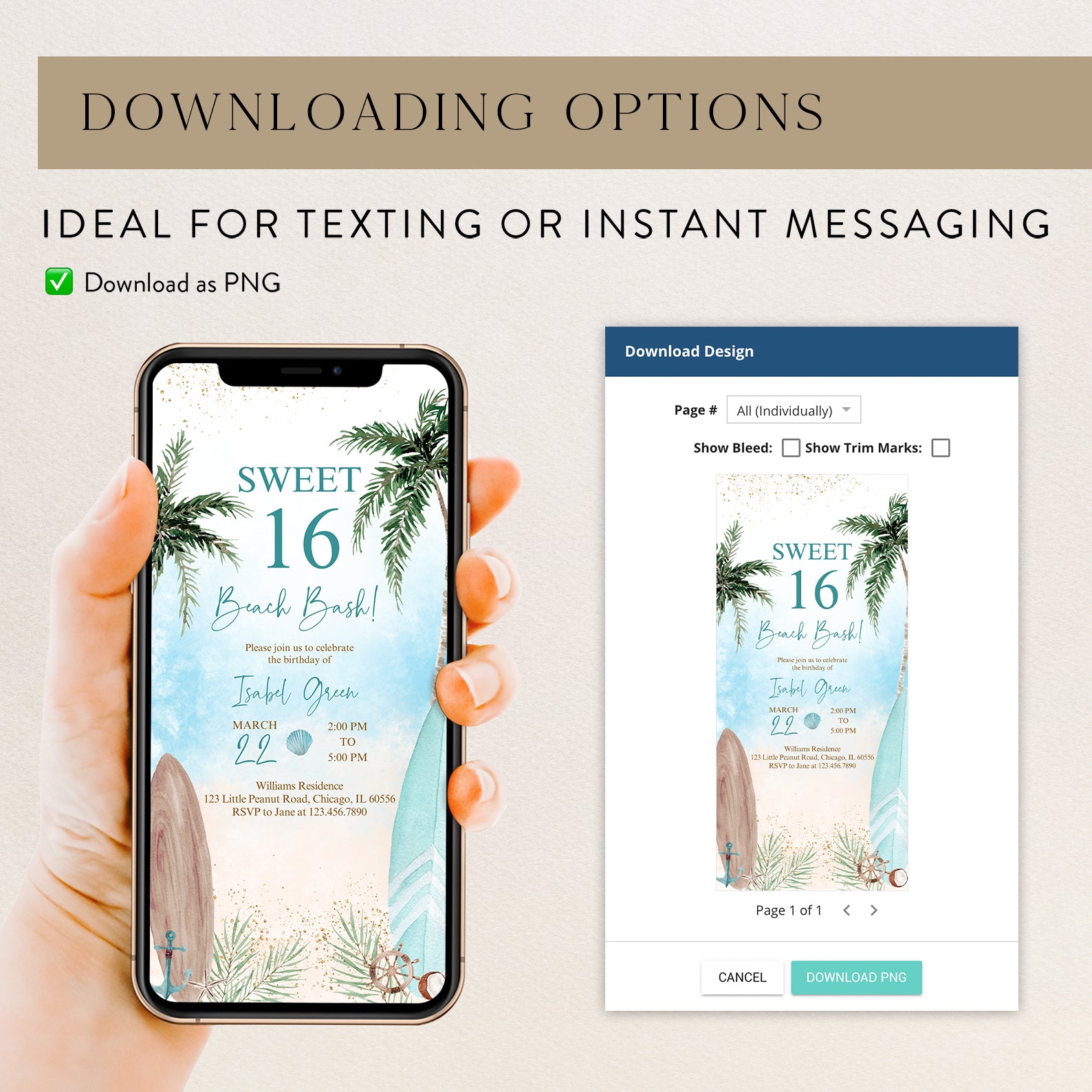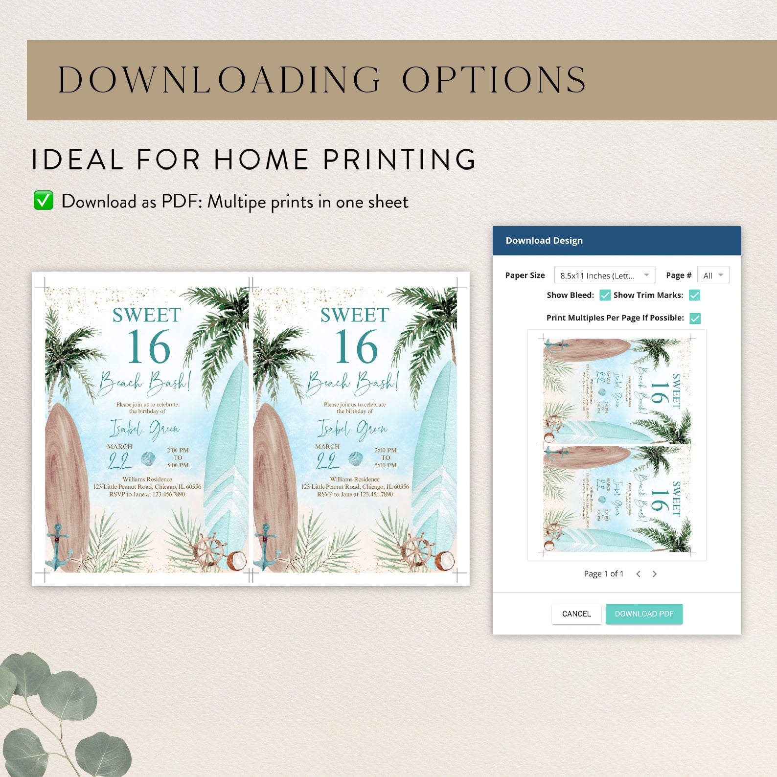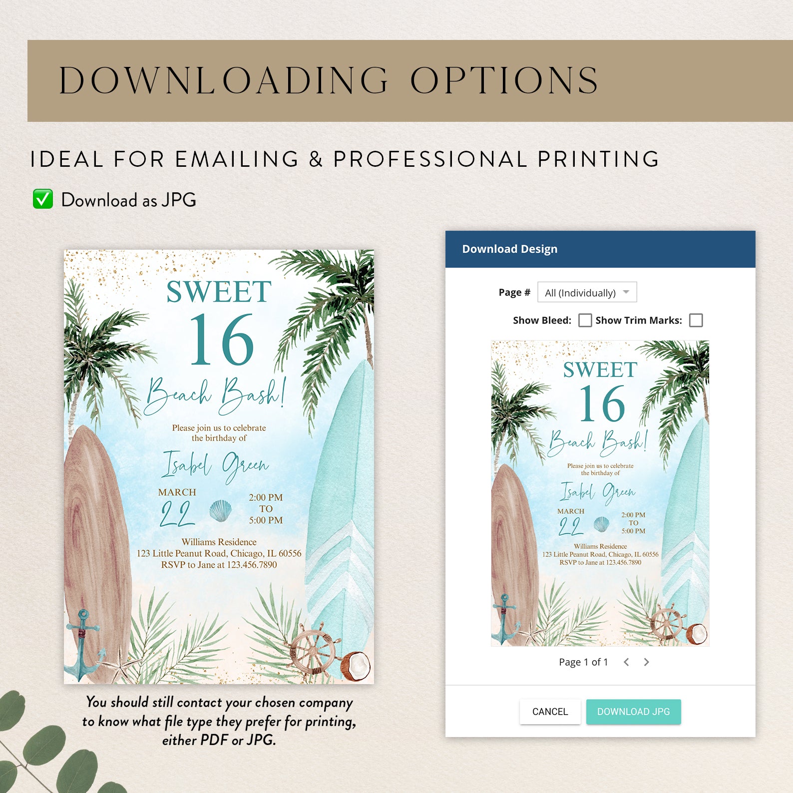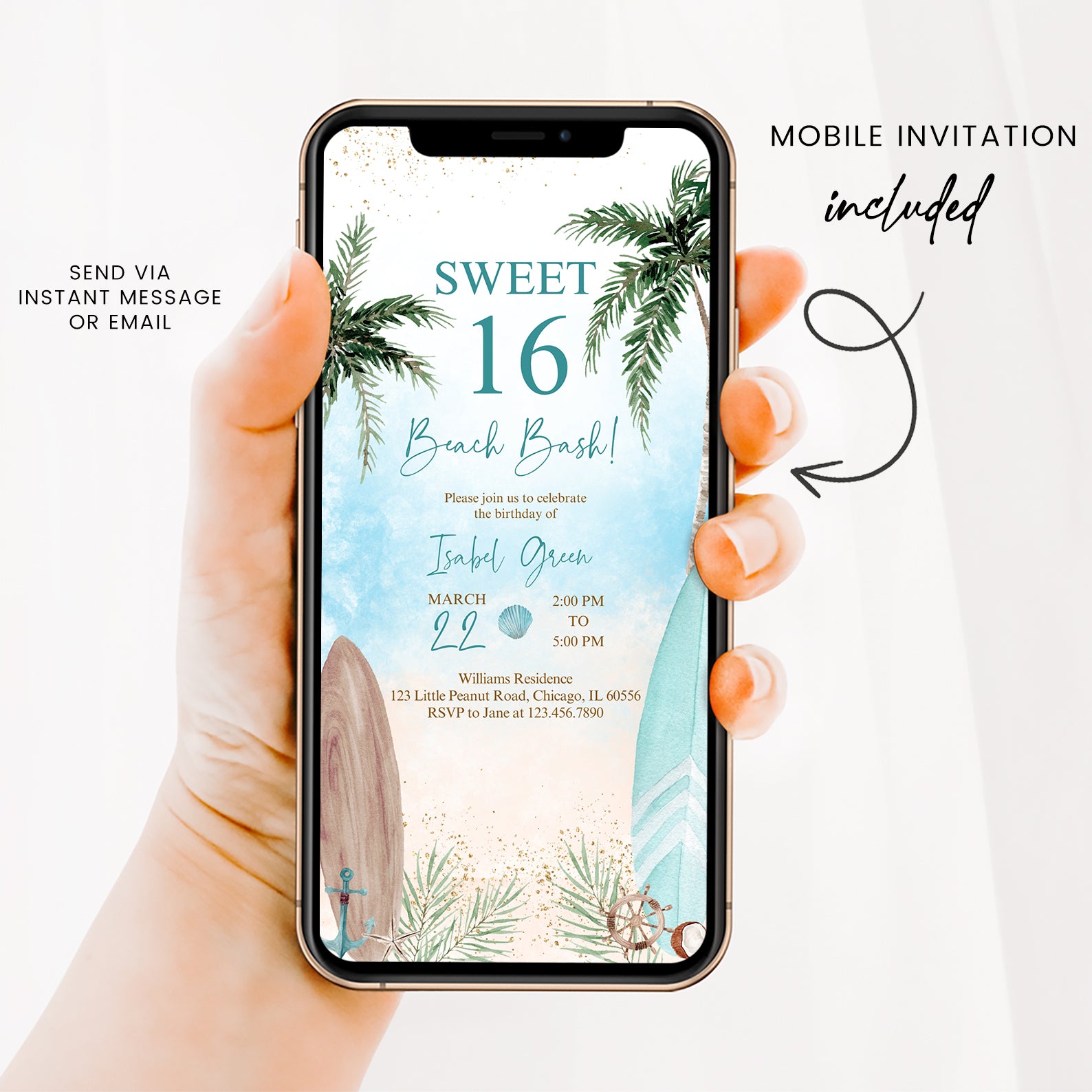 - Purchase this Sweet 16 Beach Bash Invitation: Tropical Surf Party Theme template
