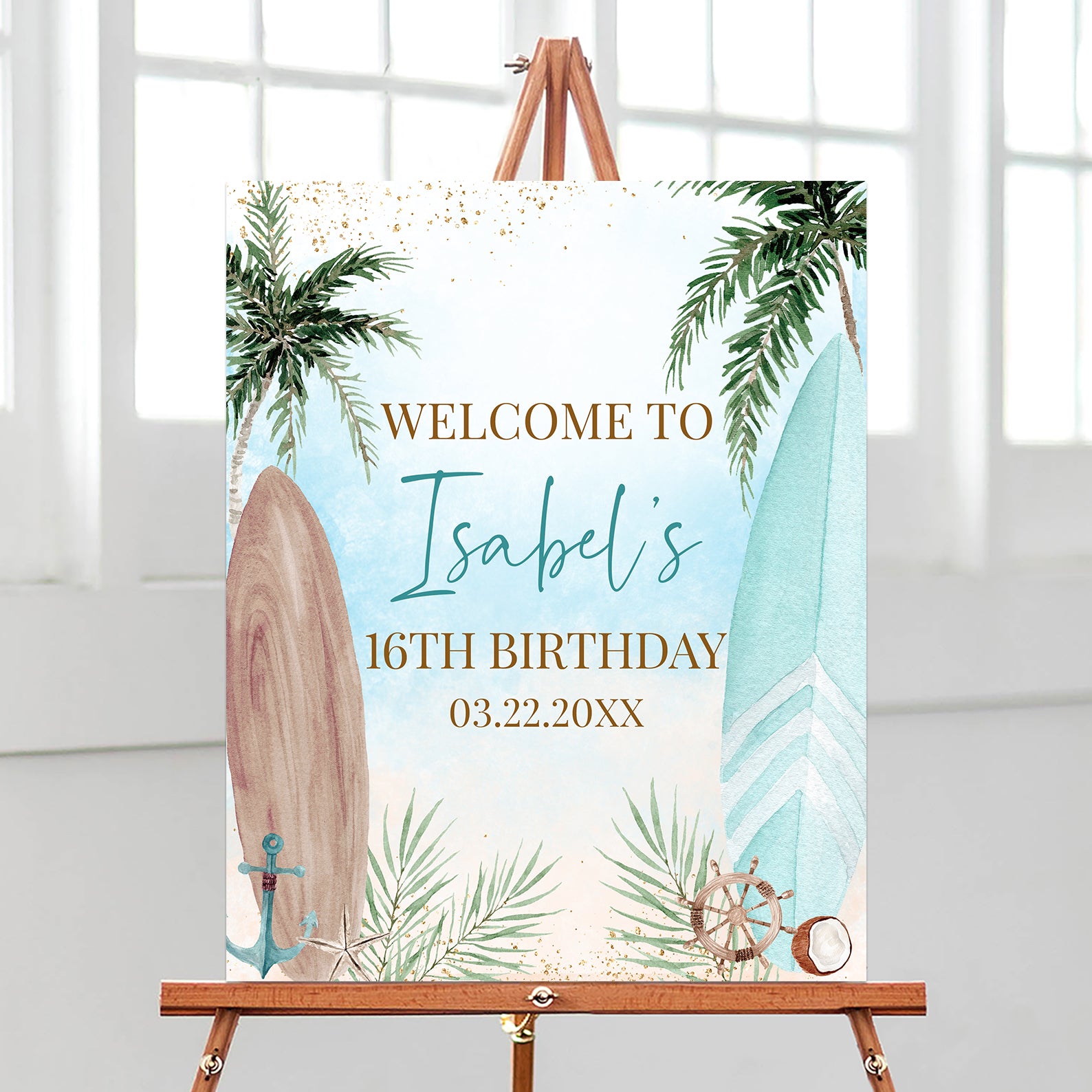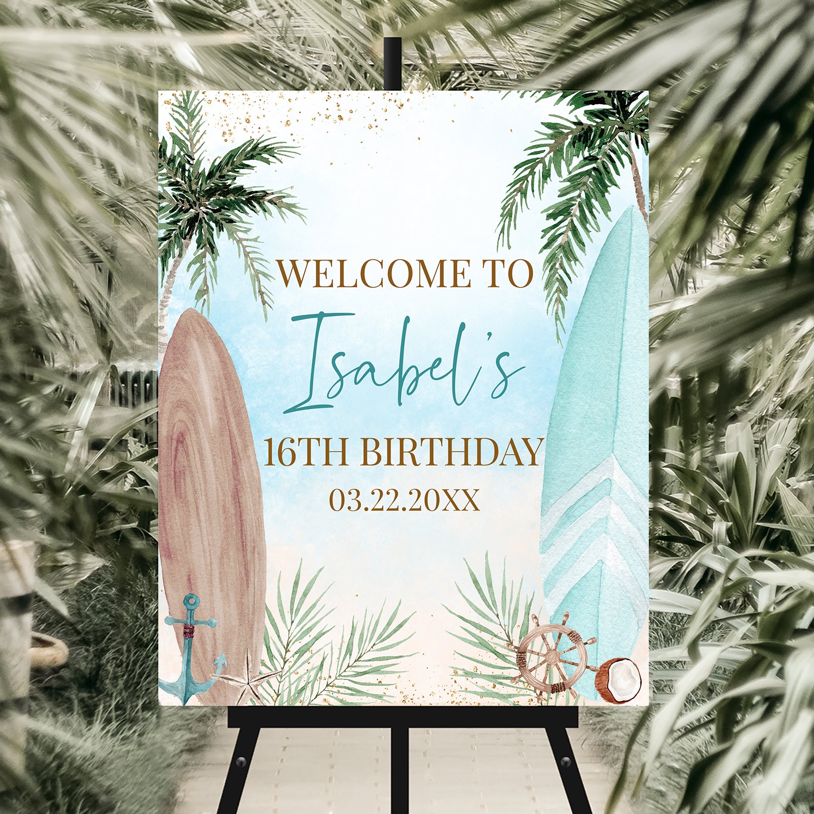 Set the scene for an unforgettable Sweet 16 with this tropical beach bash welcome sign! Designed with a serene sea-colored background, this vibrant sign features a towering palm tree and stylish surfboards on both sides, creating the perfect coastal vibe. At the bottom, nautical accents like pine leaves, an anchor, an open coconut, and a helm add a fun, beachy touch. Whether you're celebrating by the shore or bringing the beach to your party, this eye-catching sign is the perfect way to greet your guests and kick off a day of sun, surf, and celebration!