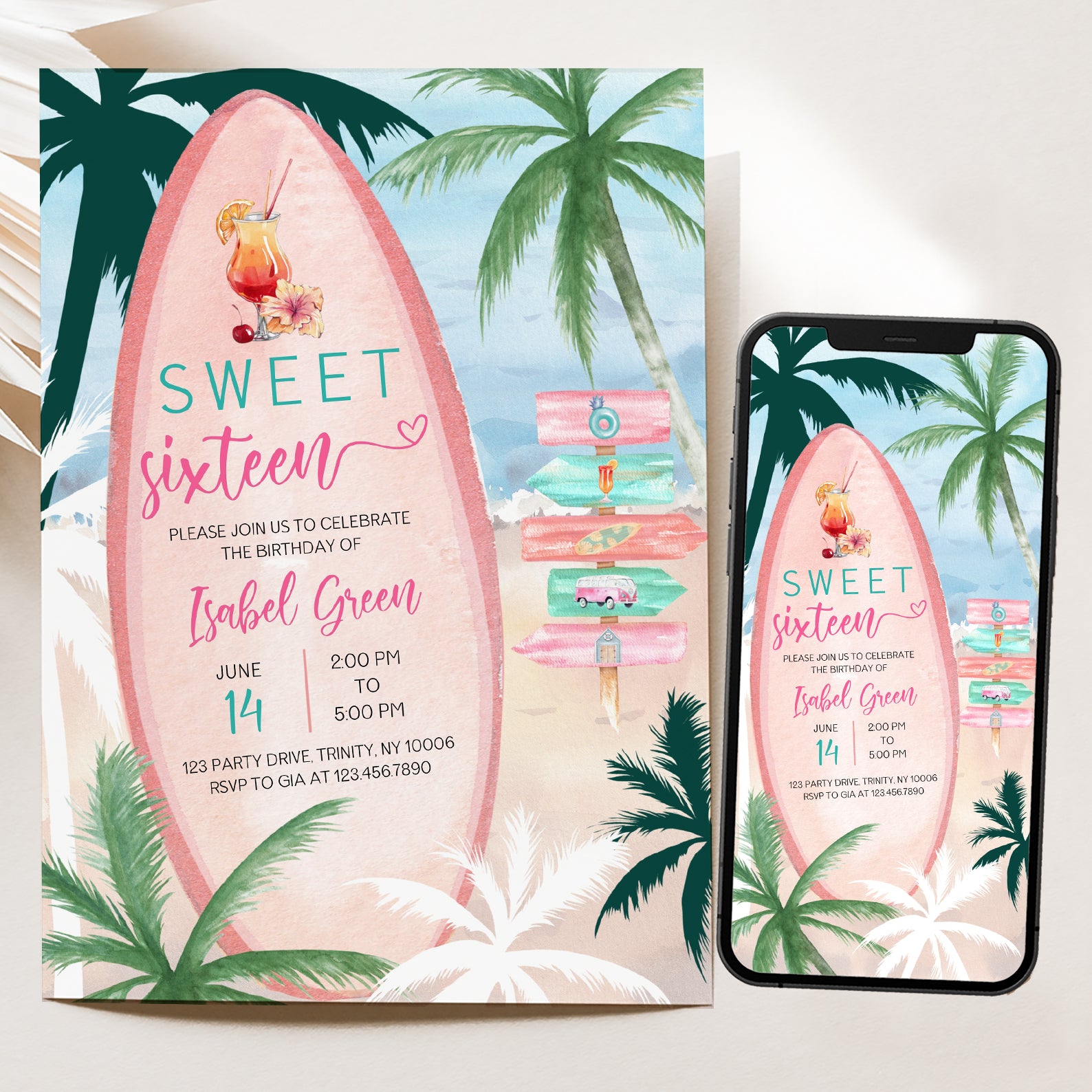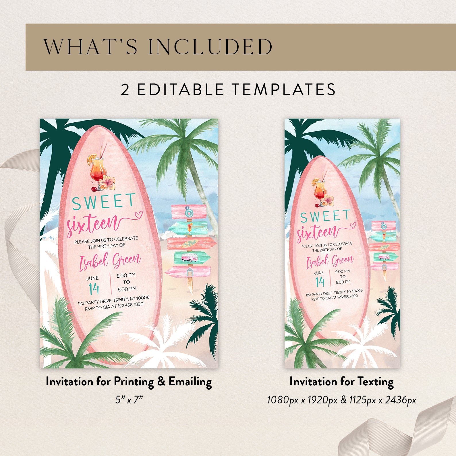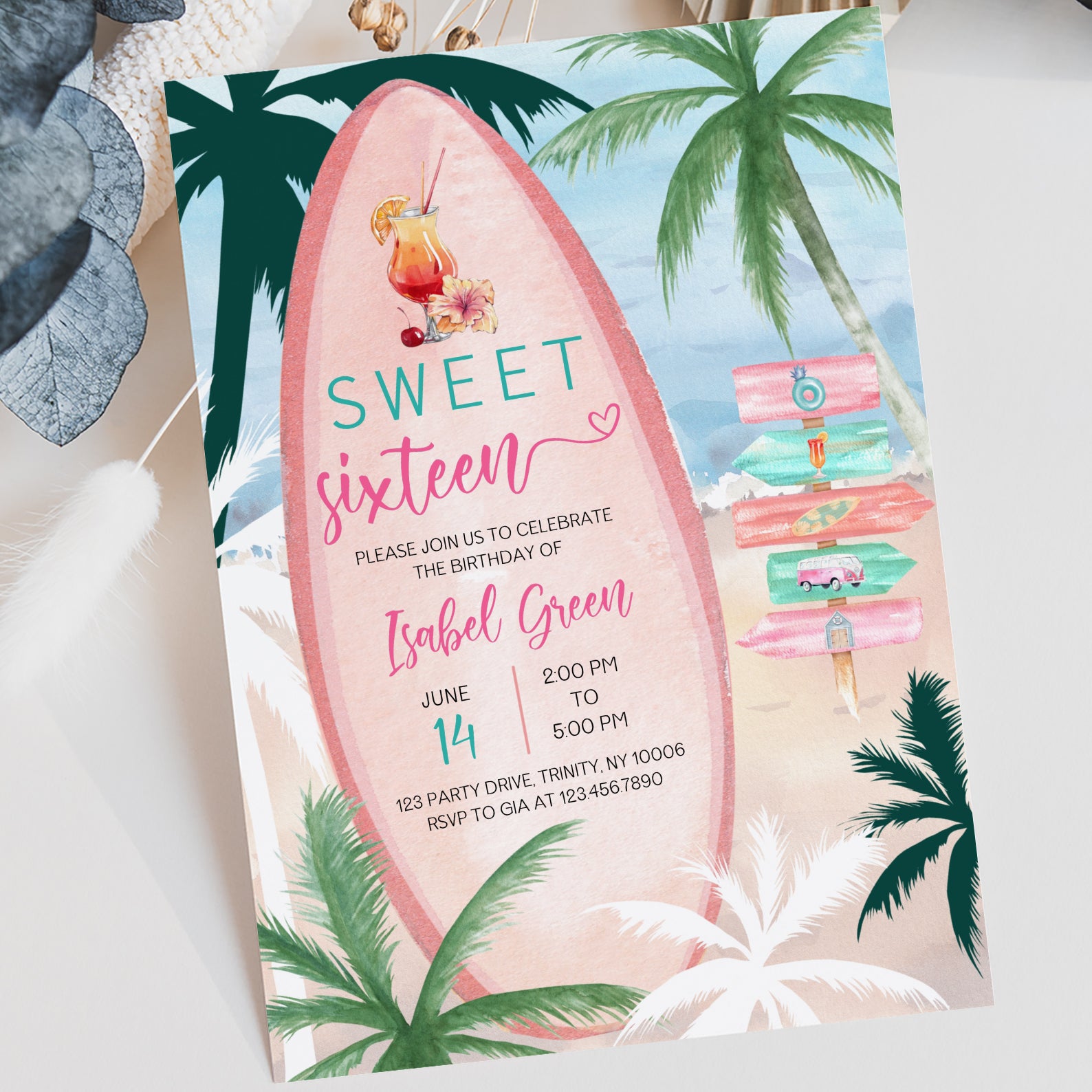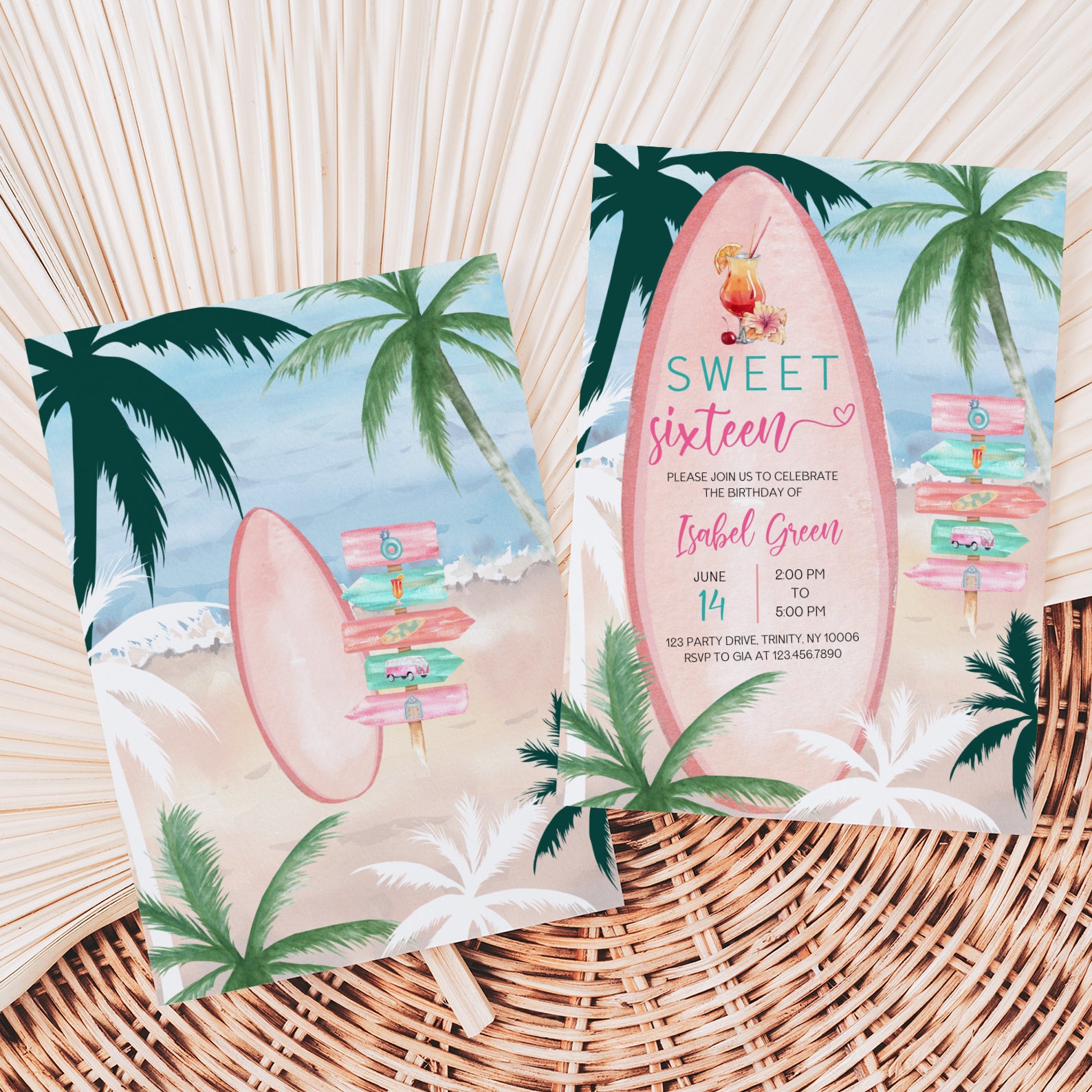 - Purchase this Sweet 16 Summer Beach Party Invitation with Surfboard & Palms template