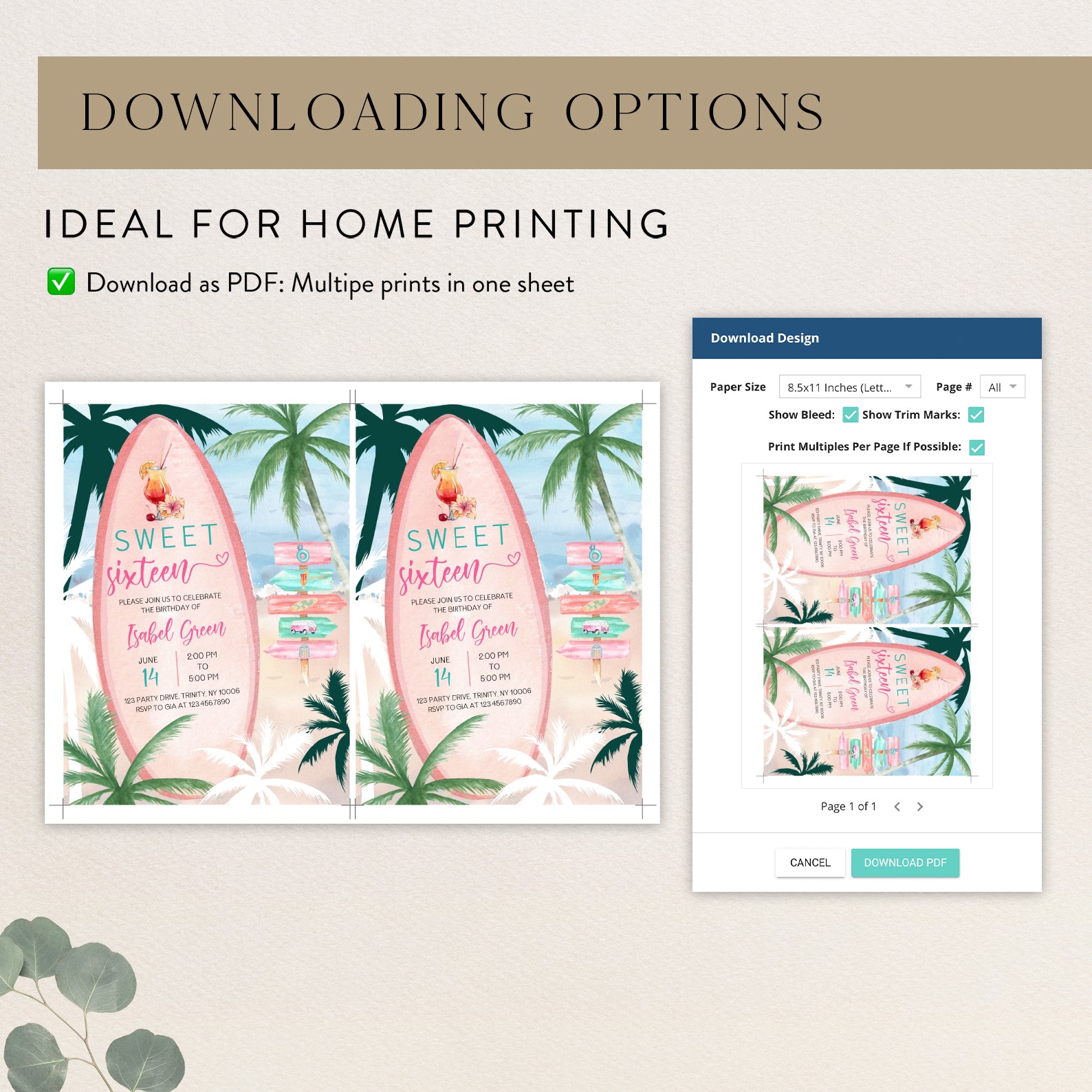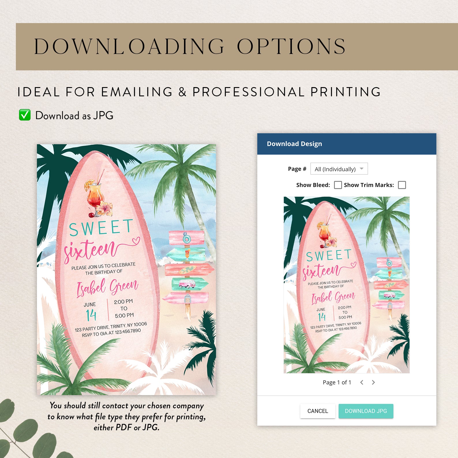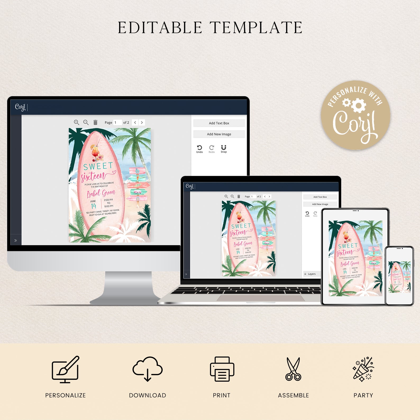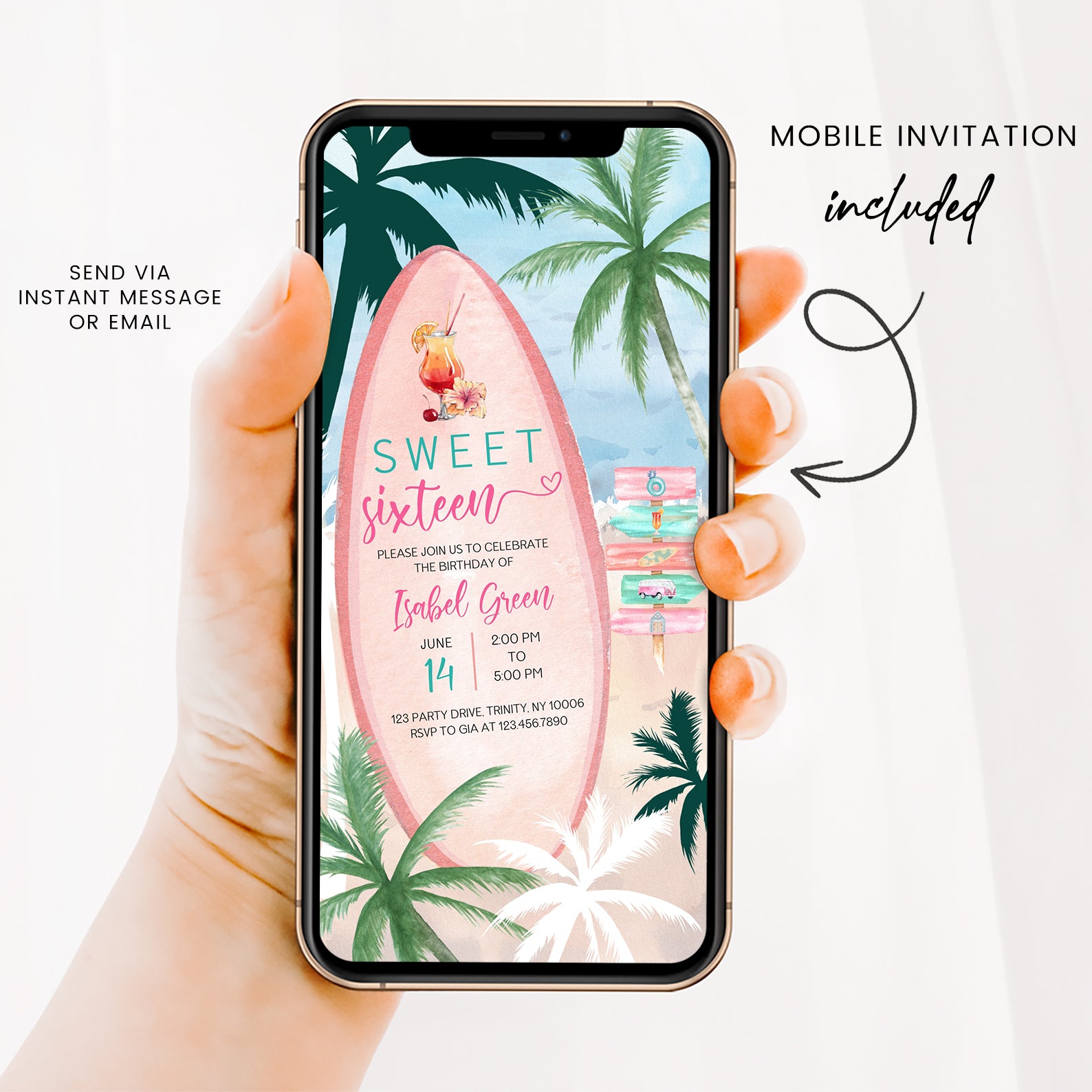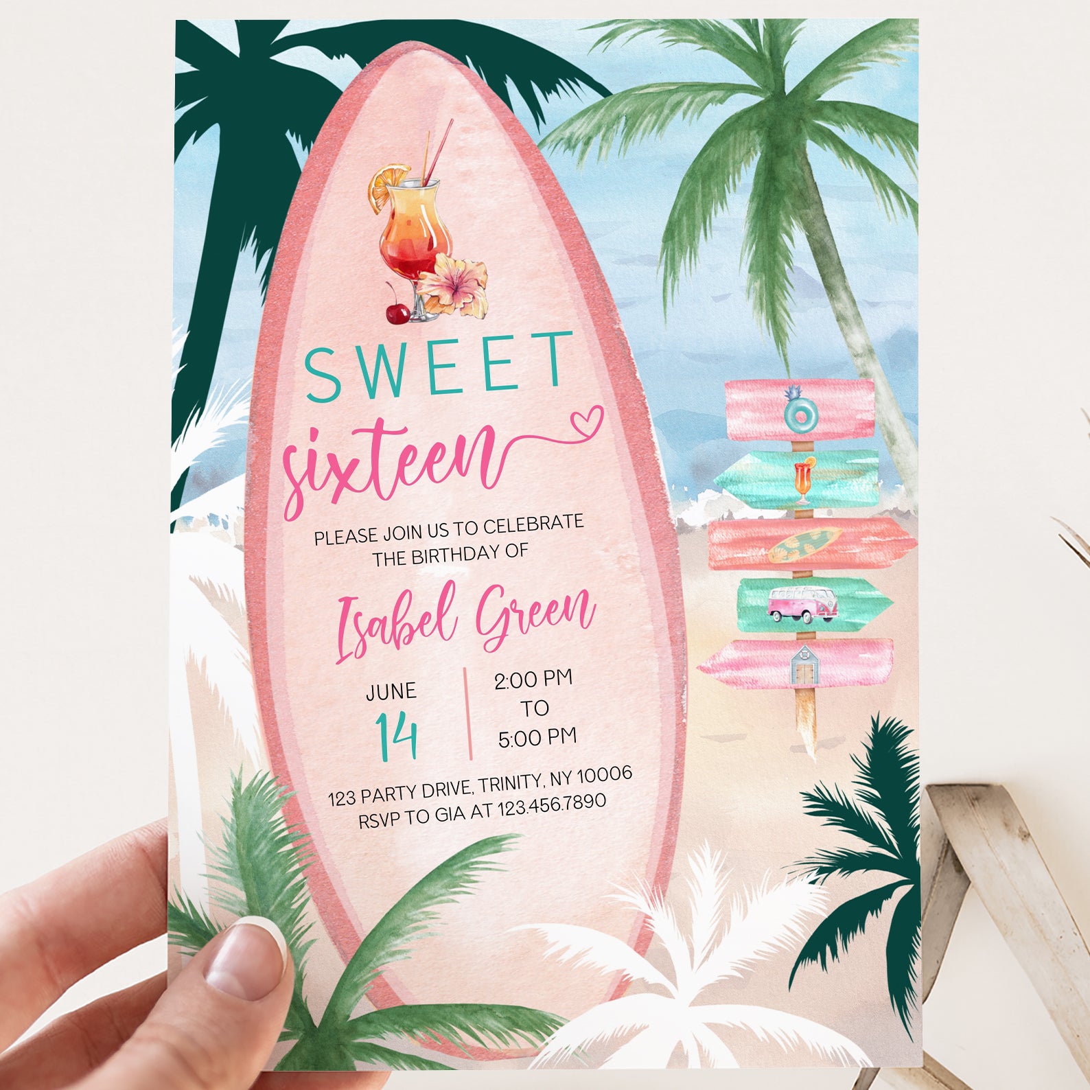 - Purchase this Sweet 16 Summer Beach Party Invitation with Surfboard & Palms template