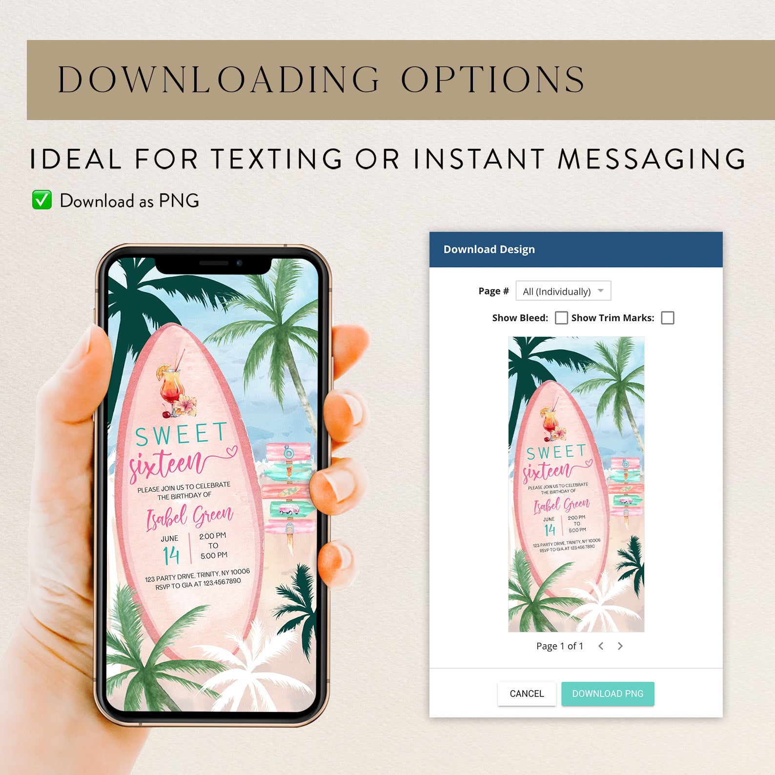 Celebrate your sweet sixteen in style with our vibrant summer birthday digital invitation! This beach-themed design features a charming pink surfboard that showcases all the essential details of your special day, perfectly complemented by lush palm trees swaying in the breeze. Set the tone for a fun-filled beach party and make your guests feel the sun-kissed vibes right from the moment they receive this eye-catching invite!