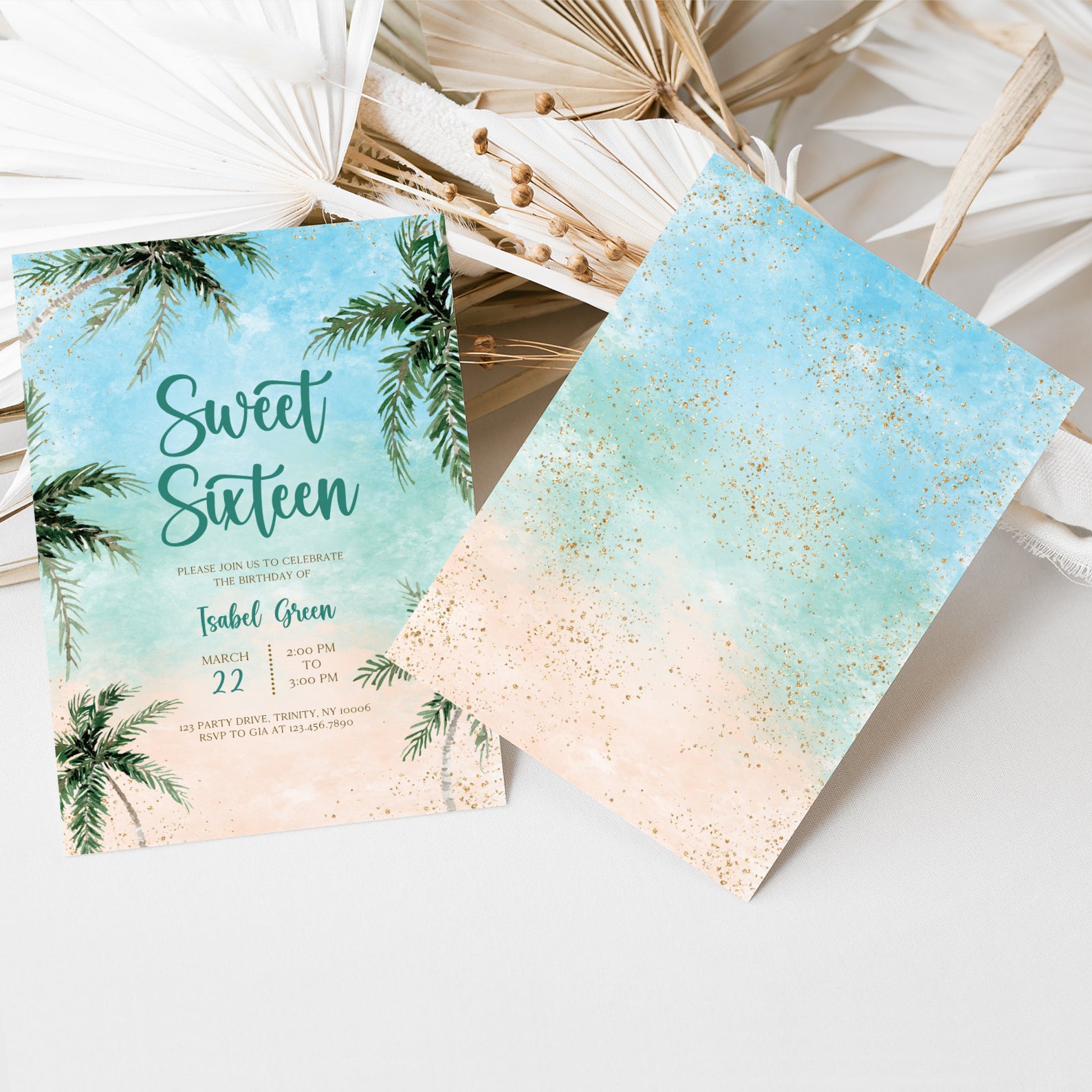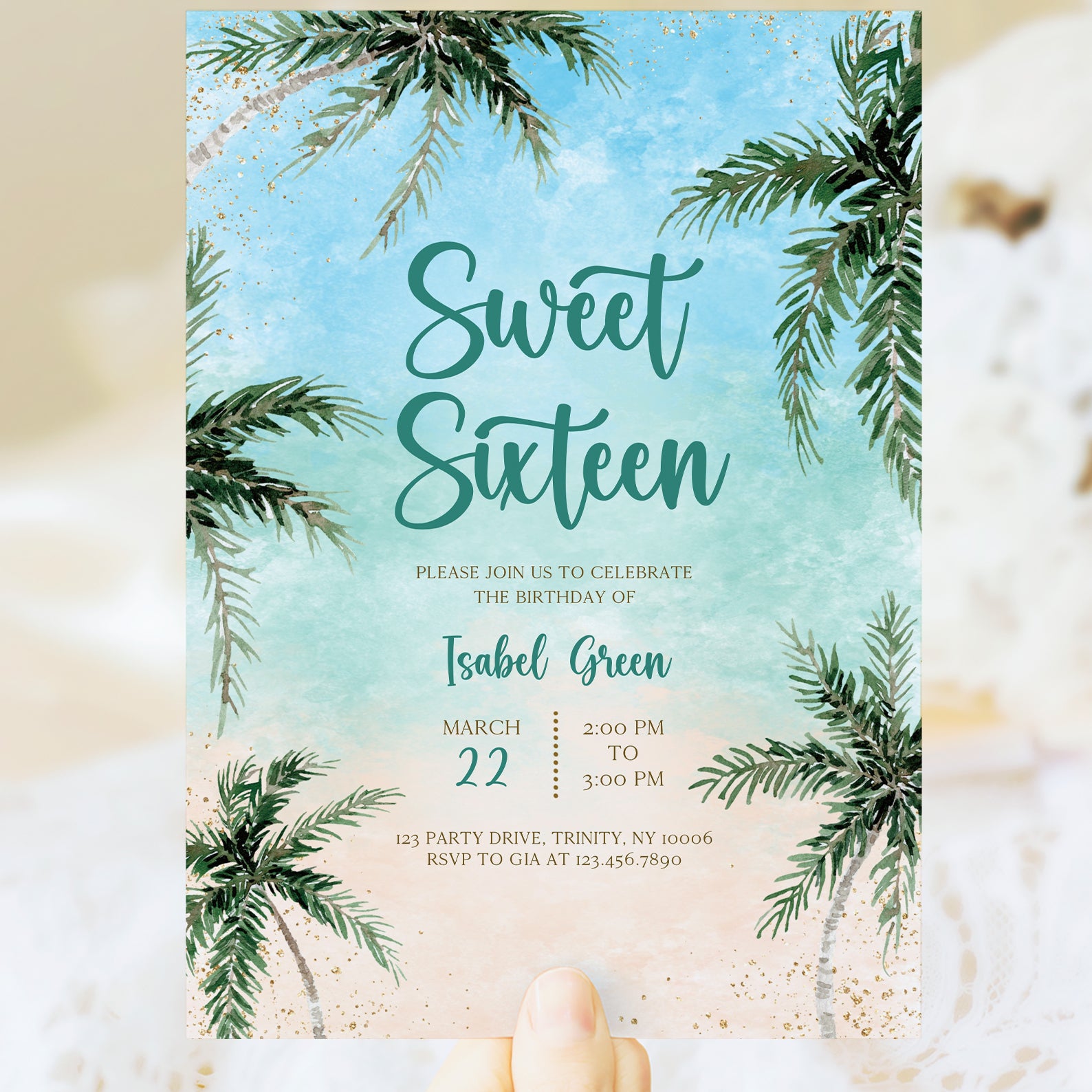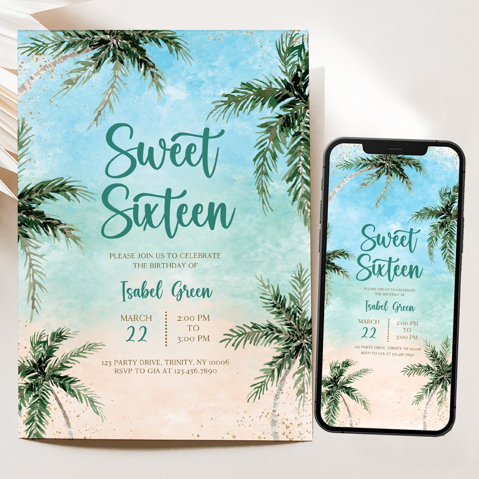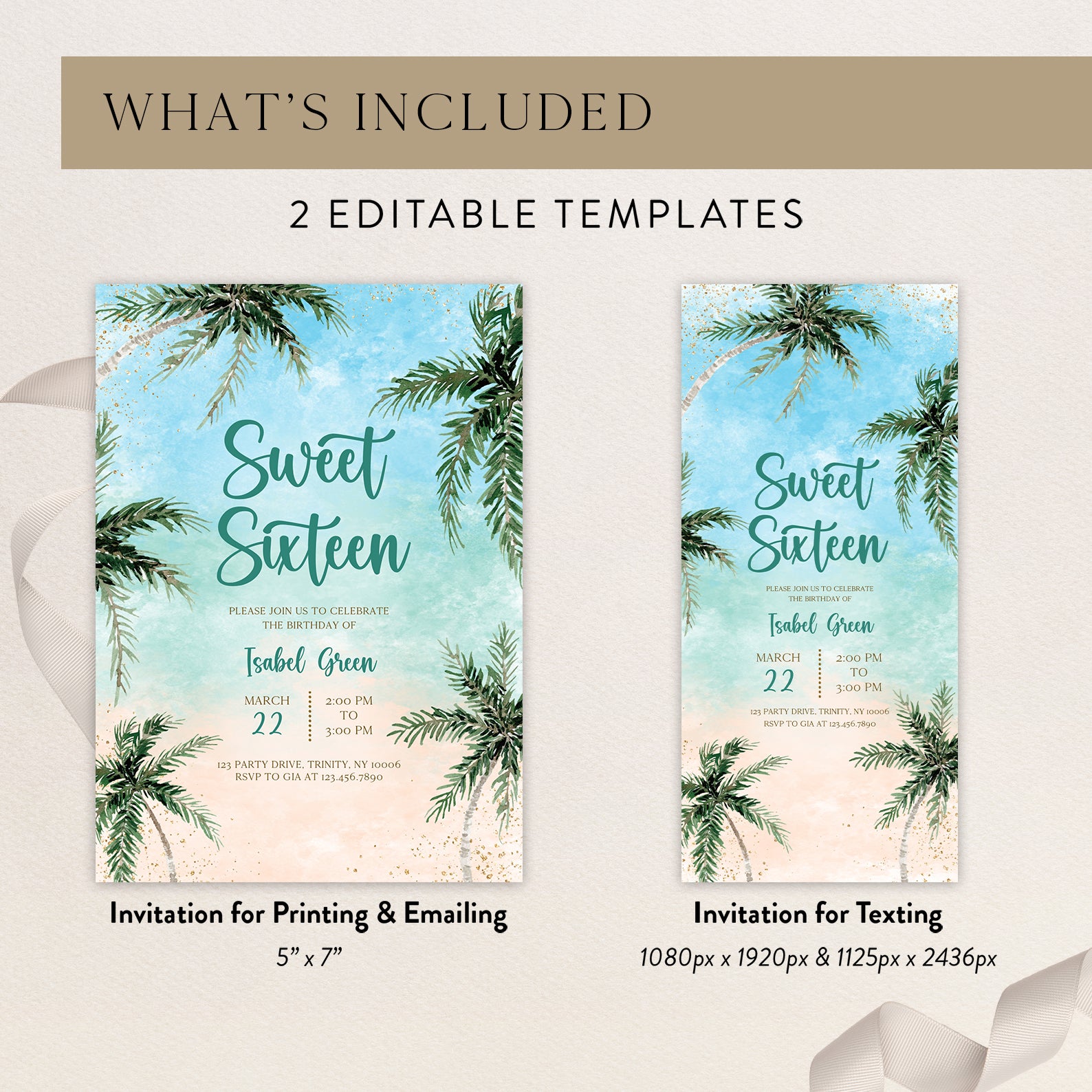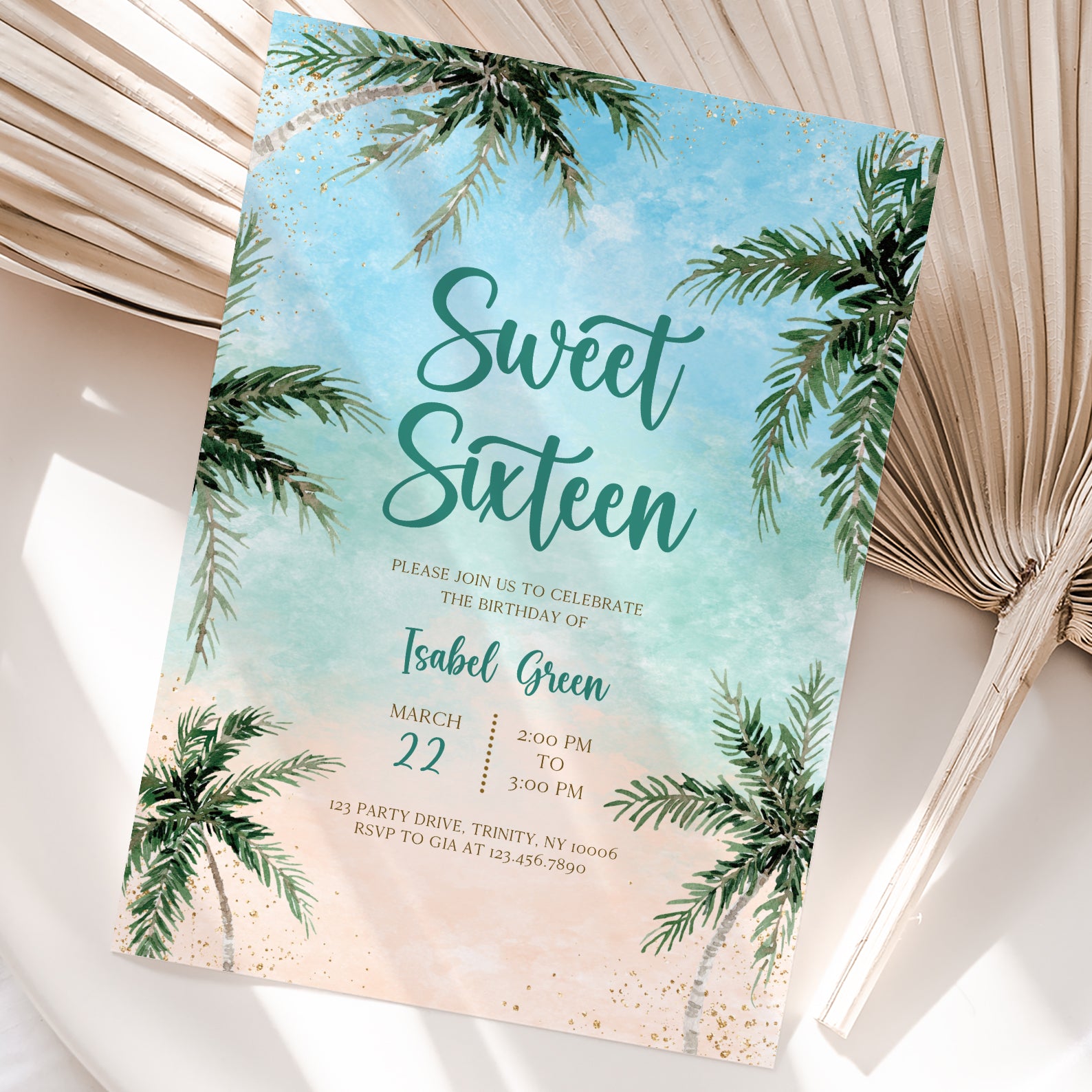 - Purchase this Sweet 16 Summer Birthday Digital Invitation Palm Trees & Gold template