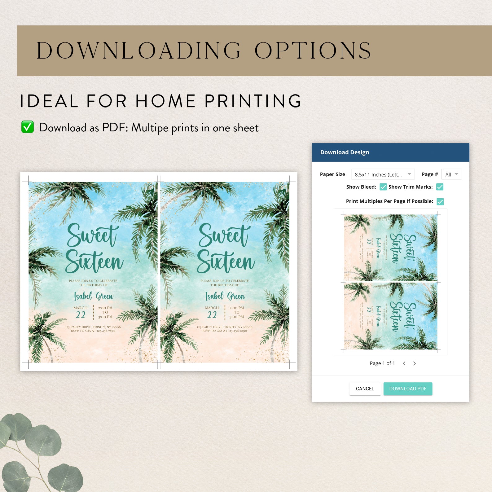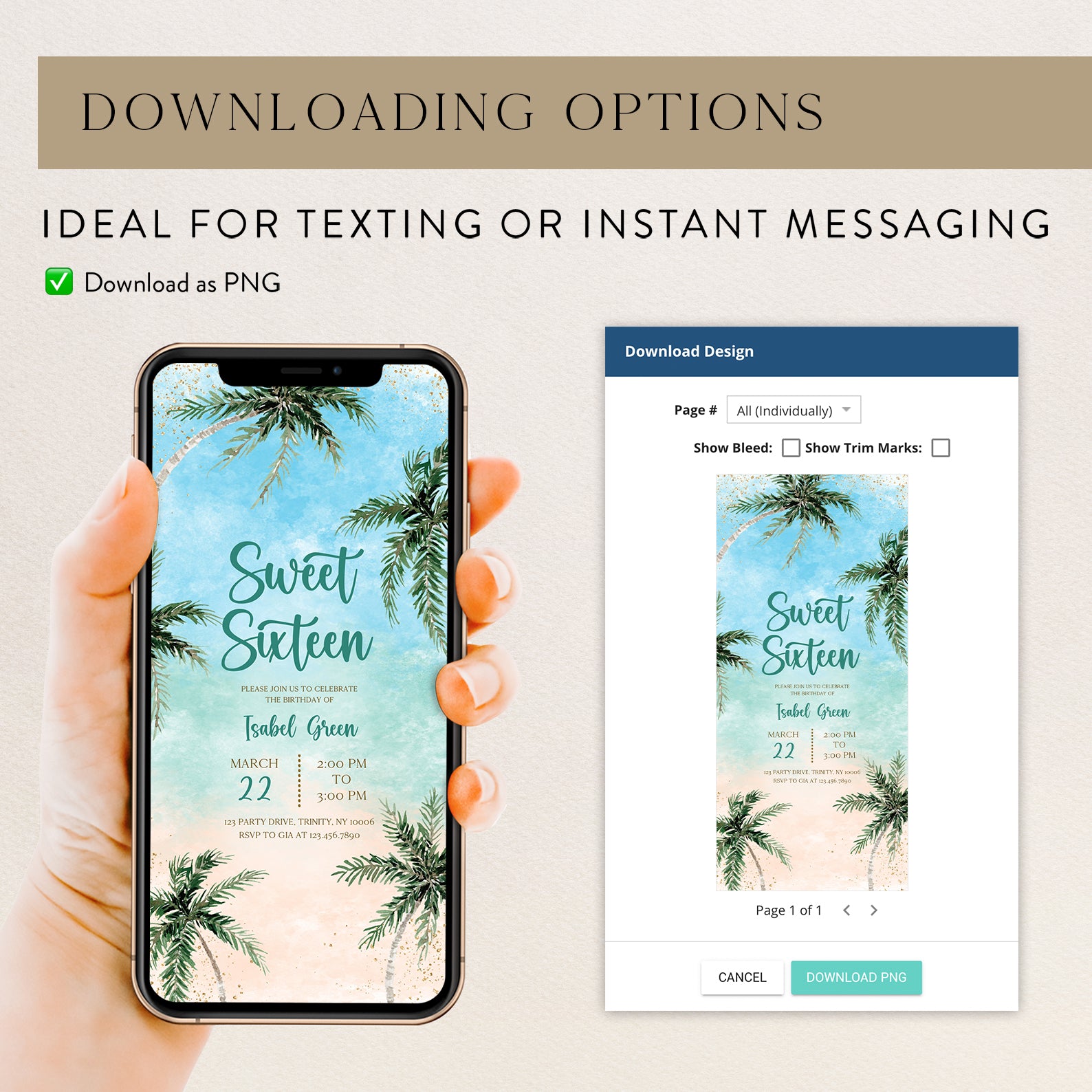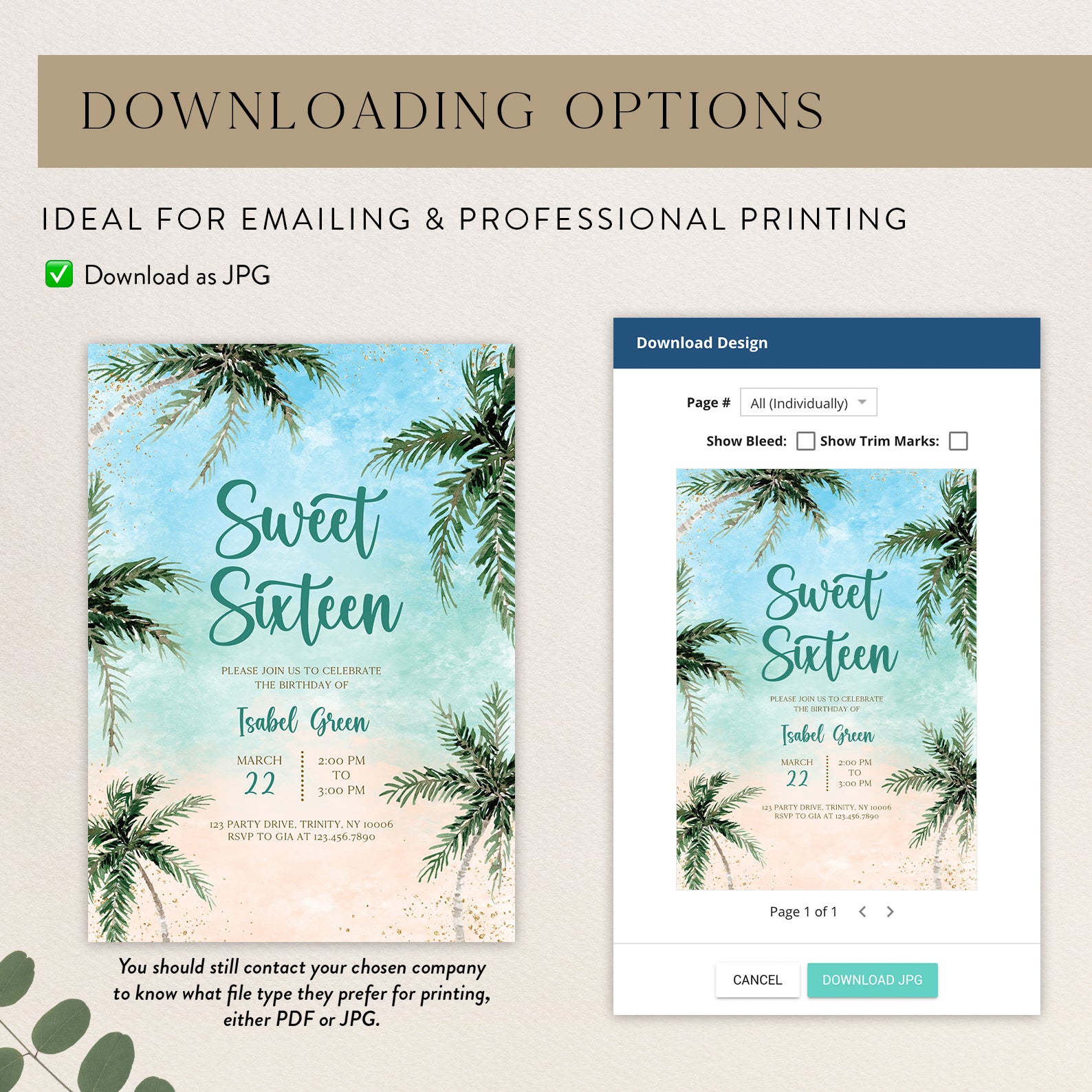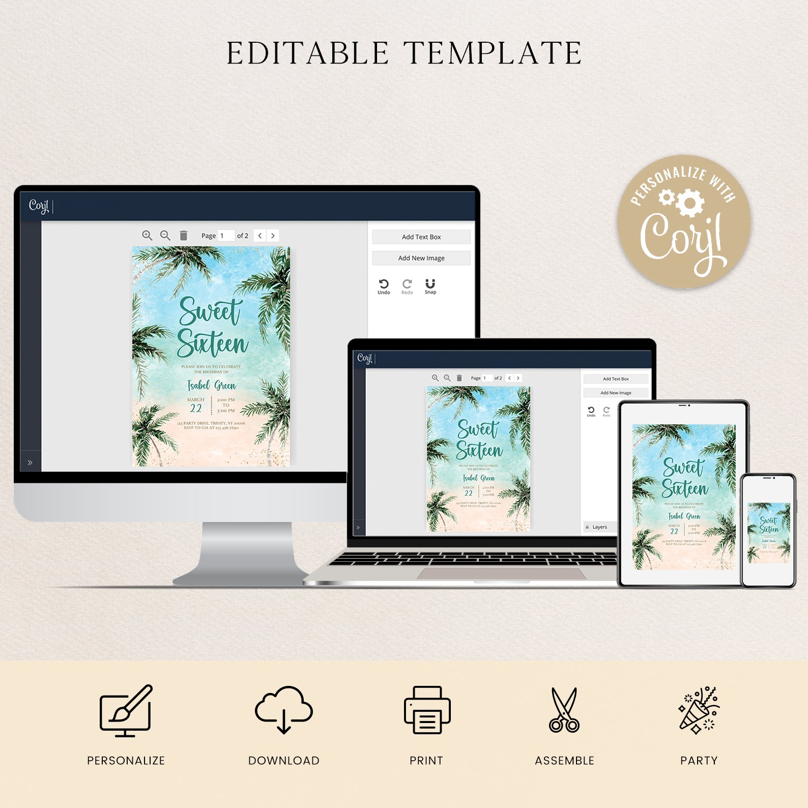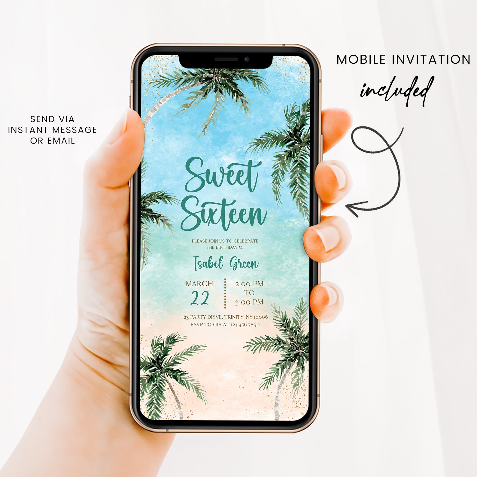 - Purchase this Sweet 16 Summer Birthday Digital Invitation Palm Trees & Gold template