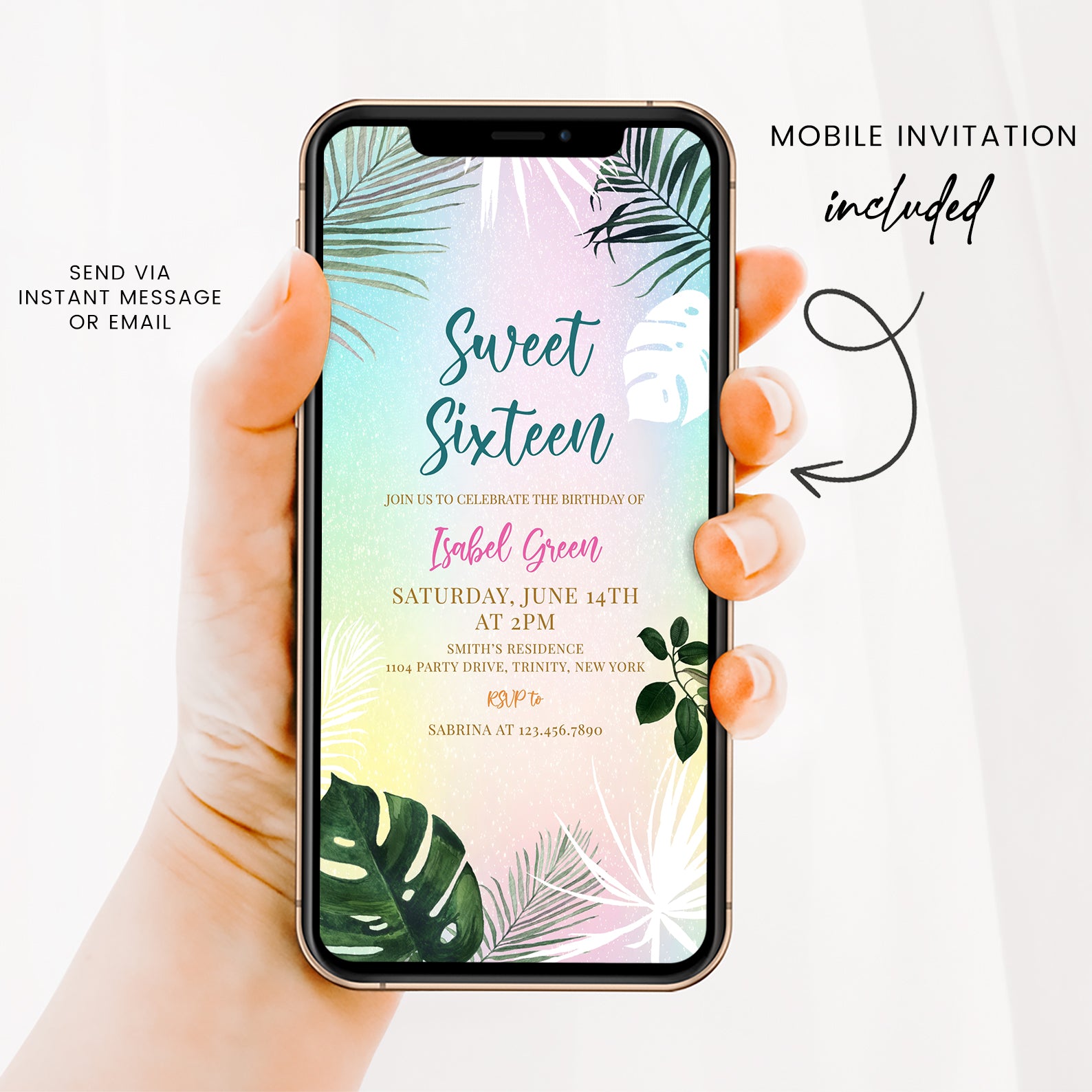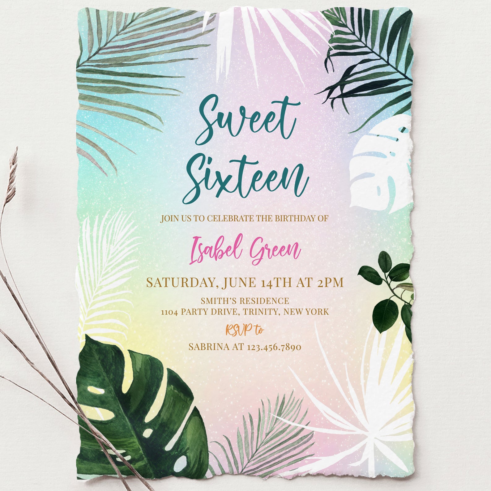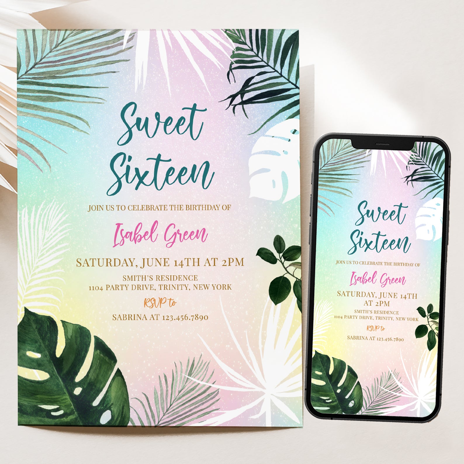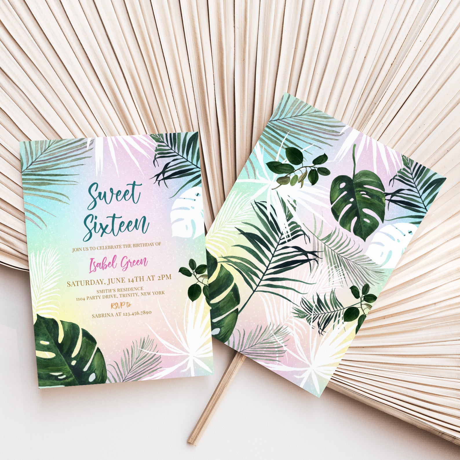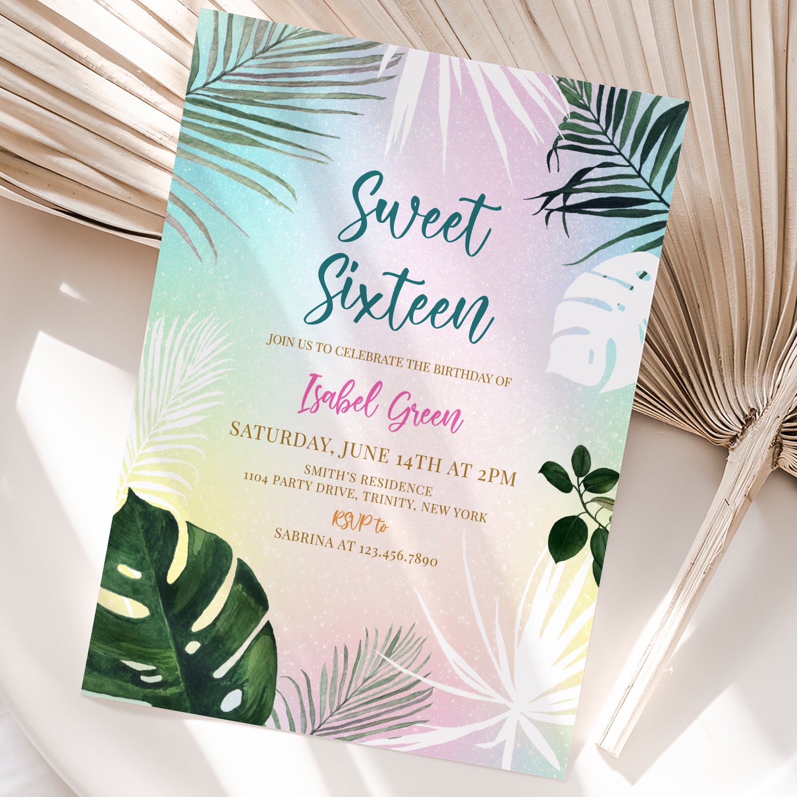 - Purchase this Sweet 16 Summer Party Invitation with Palm Leaves & Pastels template
