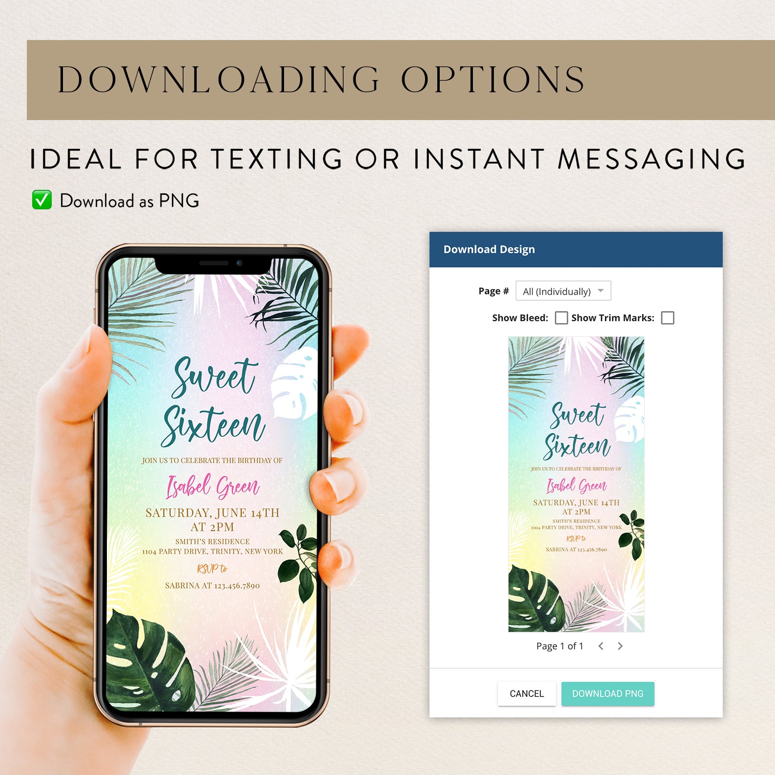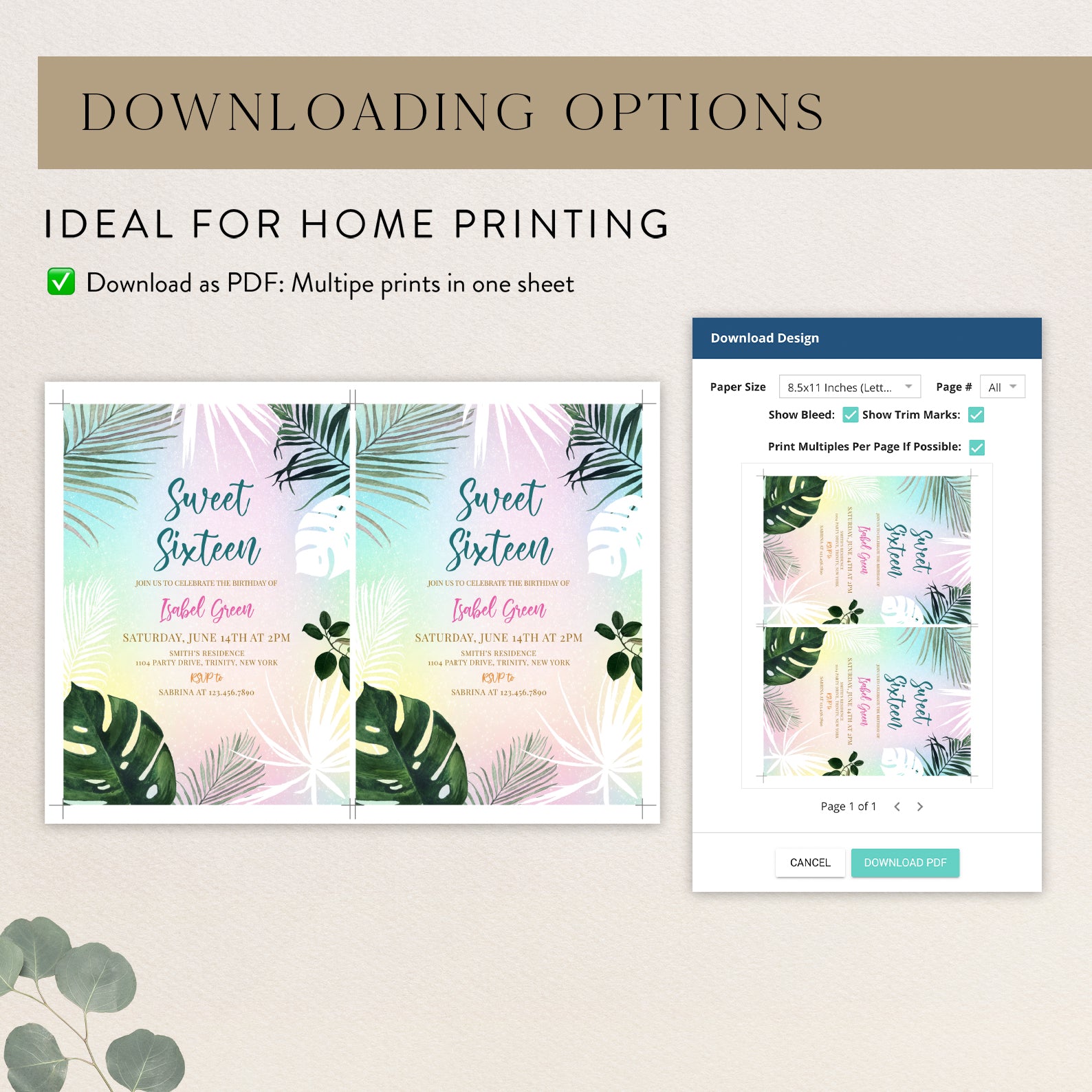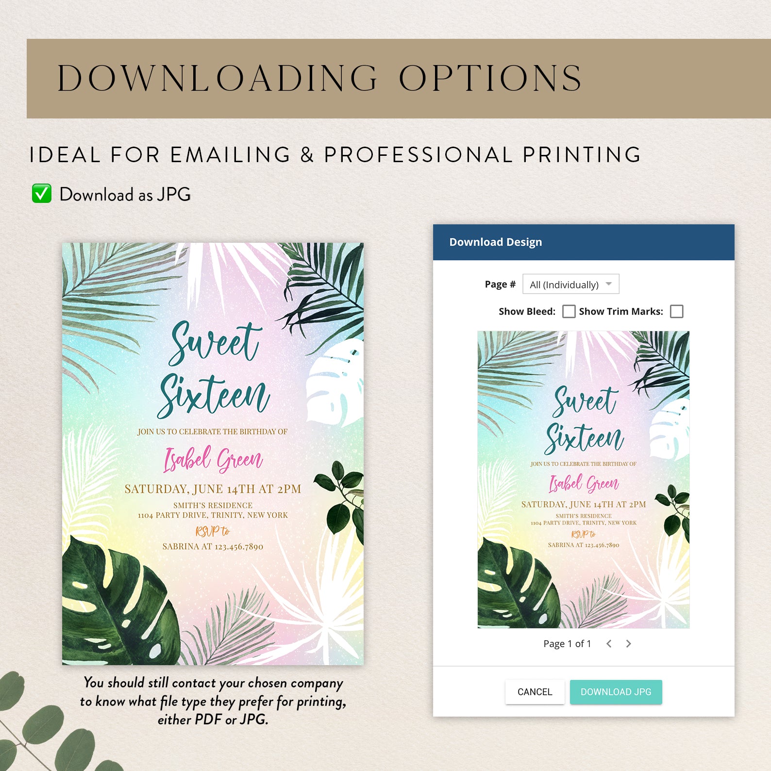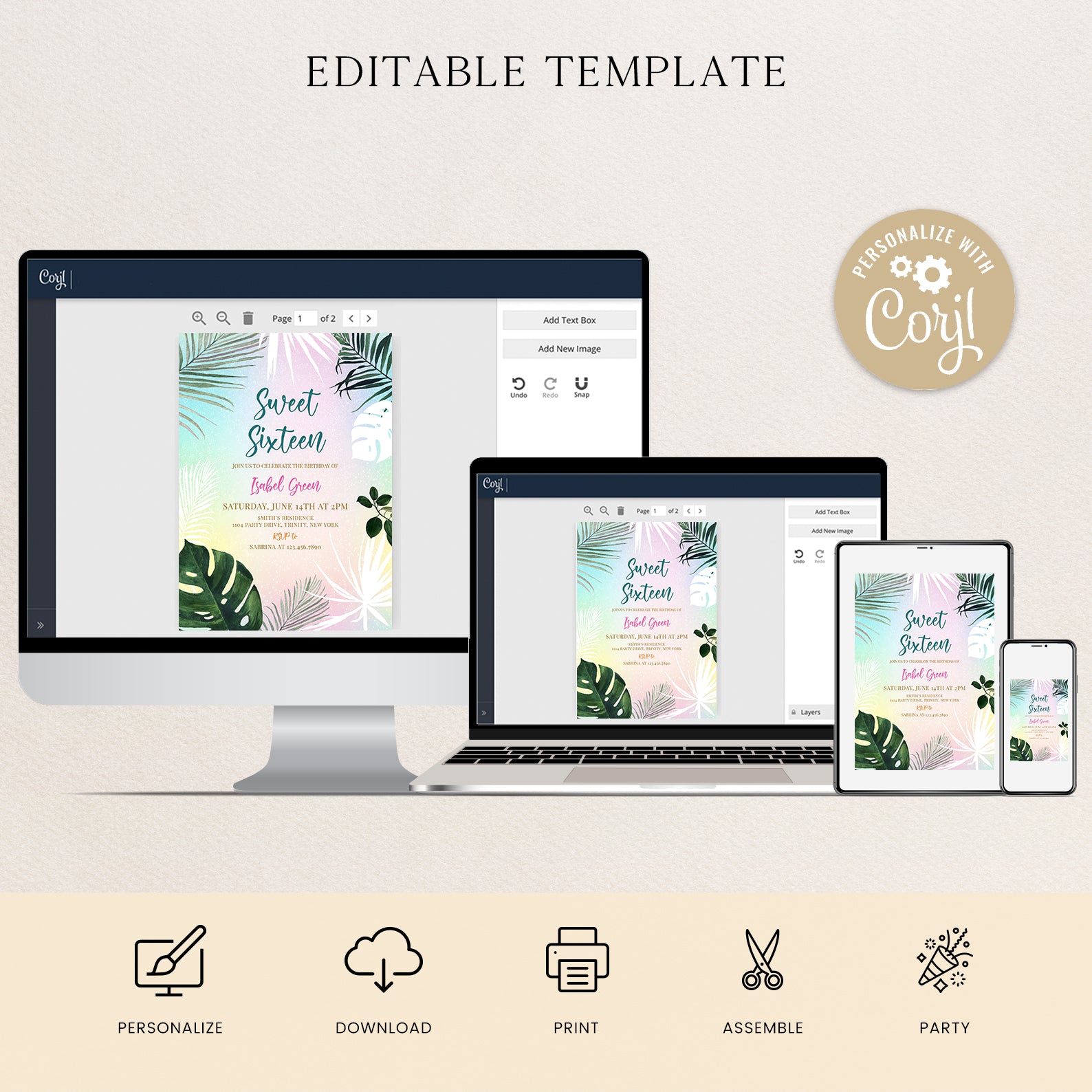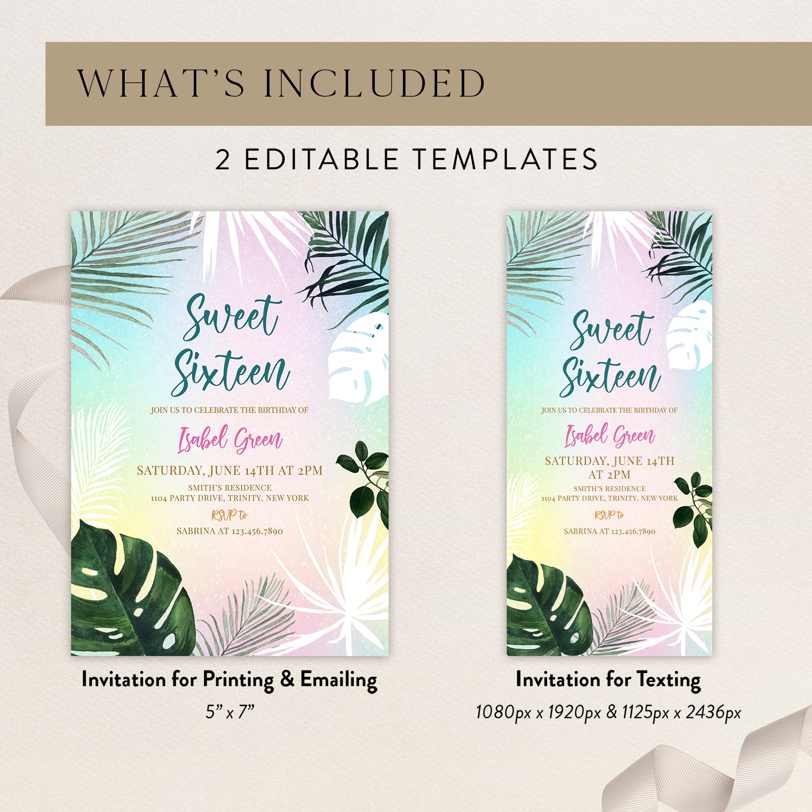 - Purchase this Sweet 16 Summer Party Invitation with Palm Leaves & Pastels template