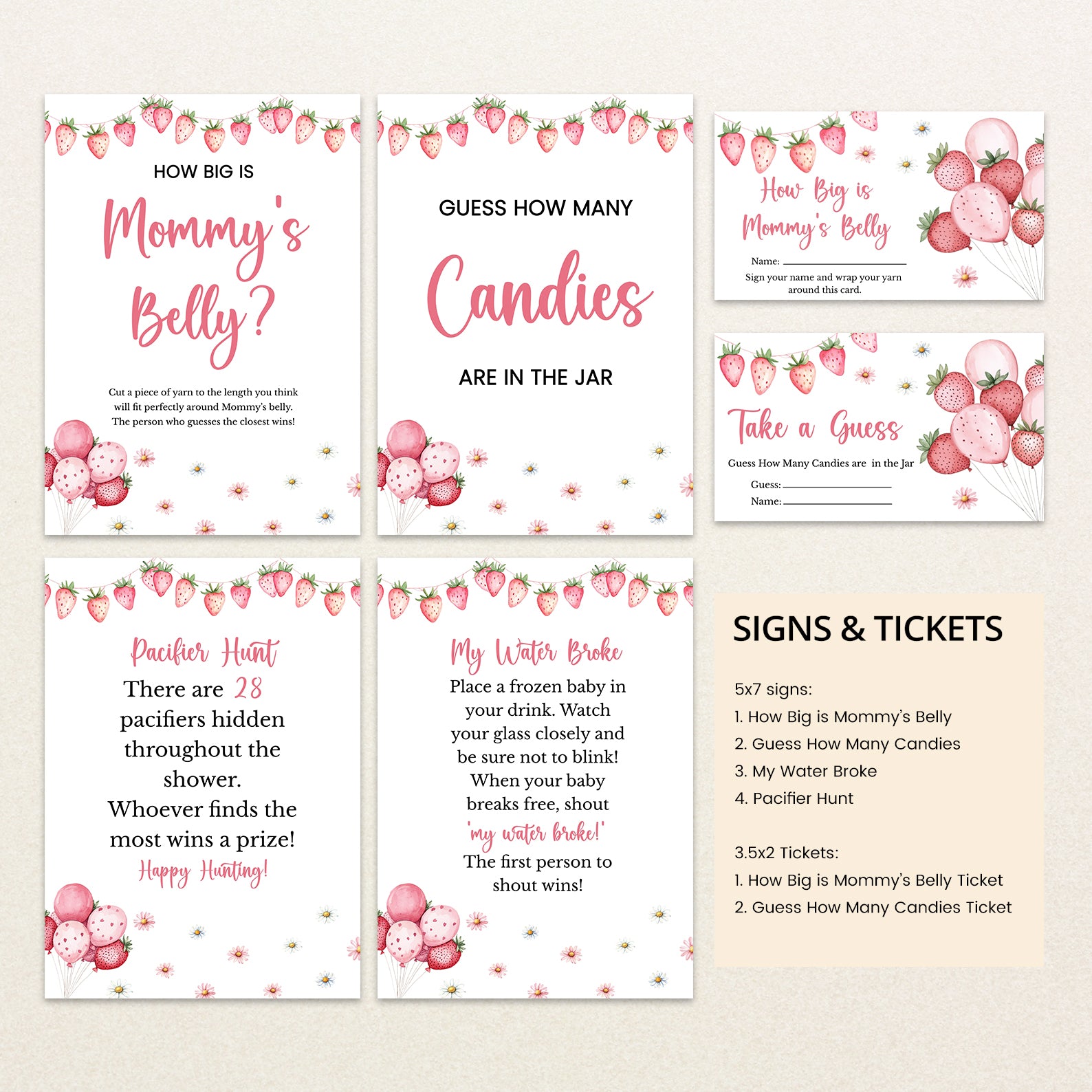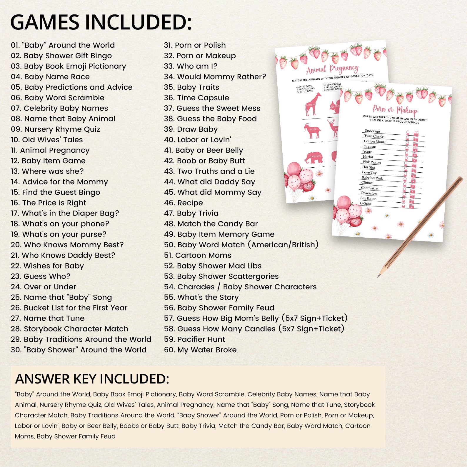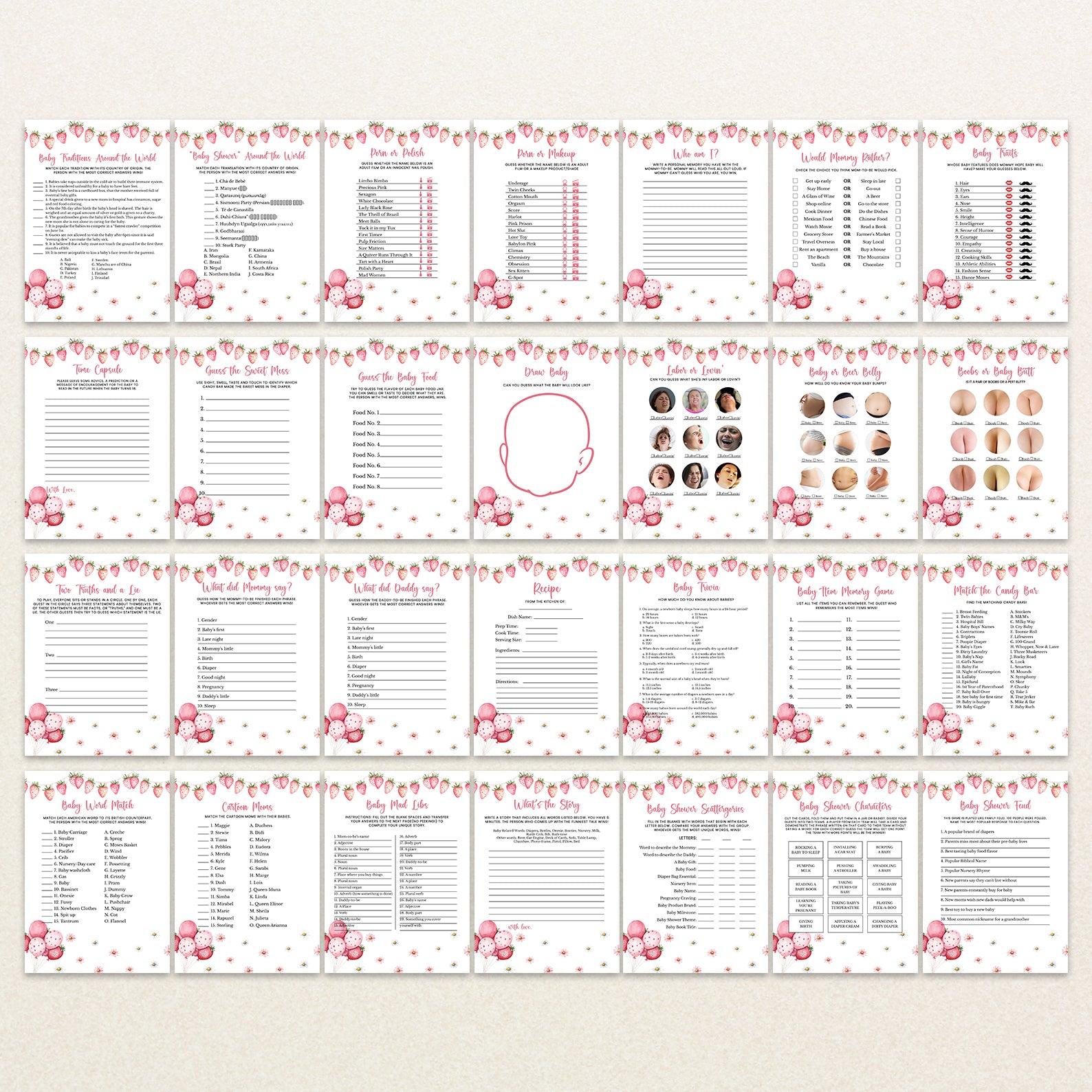 Celebrate the arrival of your little one with our charming summer baby shower game bundle, featuring a delightful pink strawberry theme! This bundle consists of 60 fun and engaging baby shower games, each beautifully designed to complement your berry sweet celebration. Adorned with playful pink balloons, strawberry-shaped accents, and cascading daisy flowers, this game bundle is perfect for keeping your guests entertained and creating lasting memories. Set the tone for a joyful gathering filled with laughter and love!