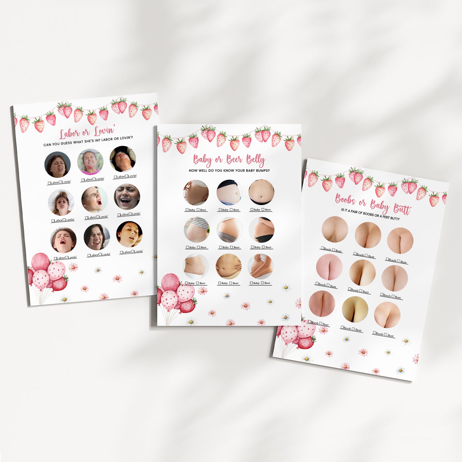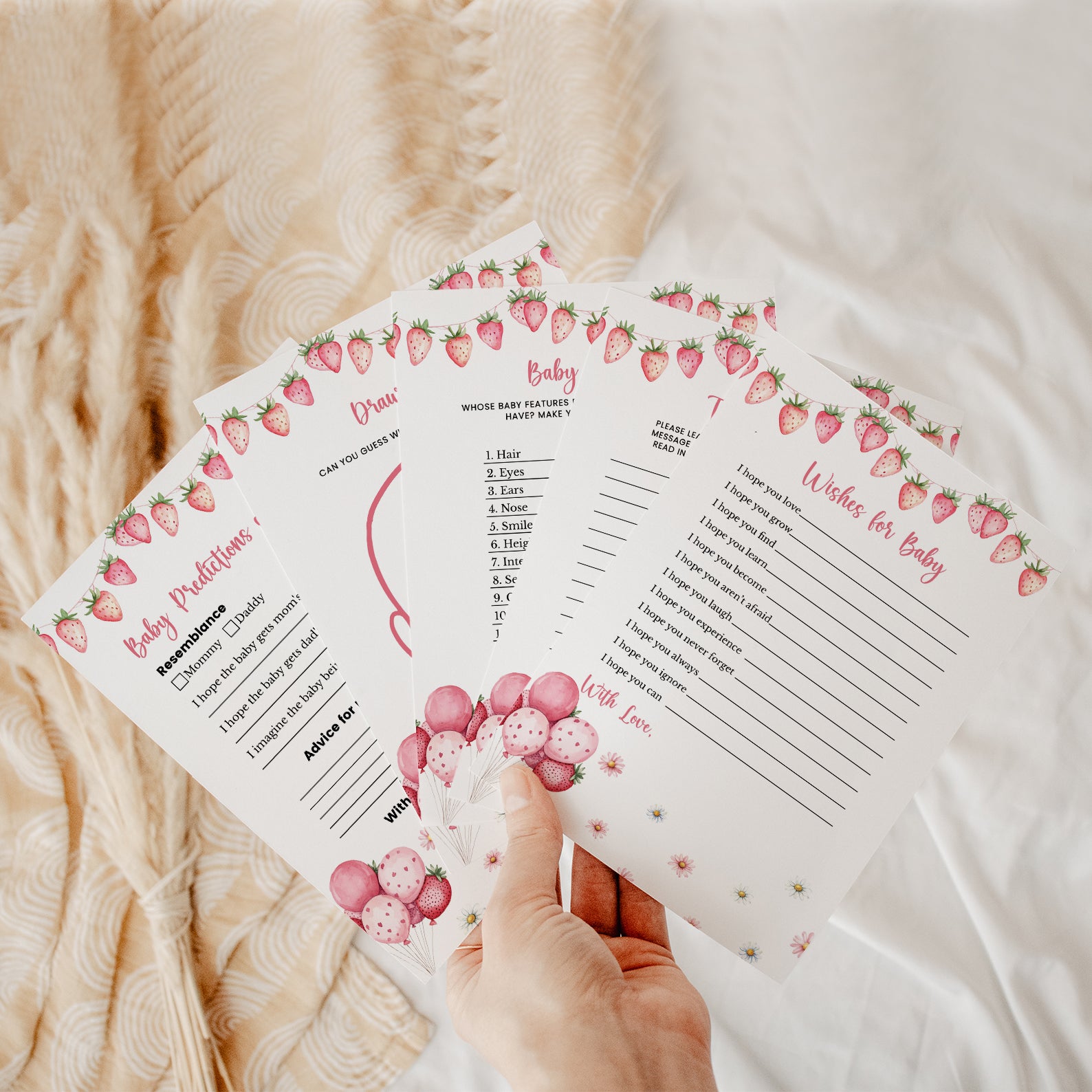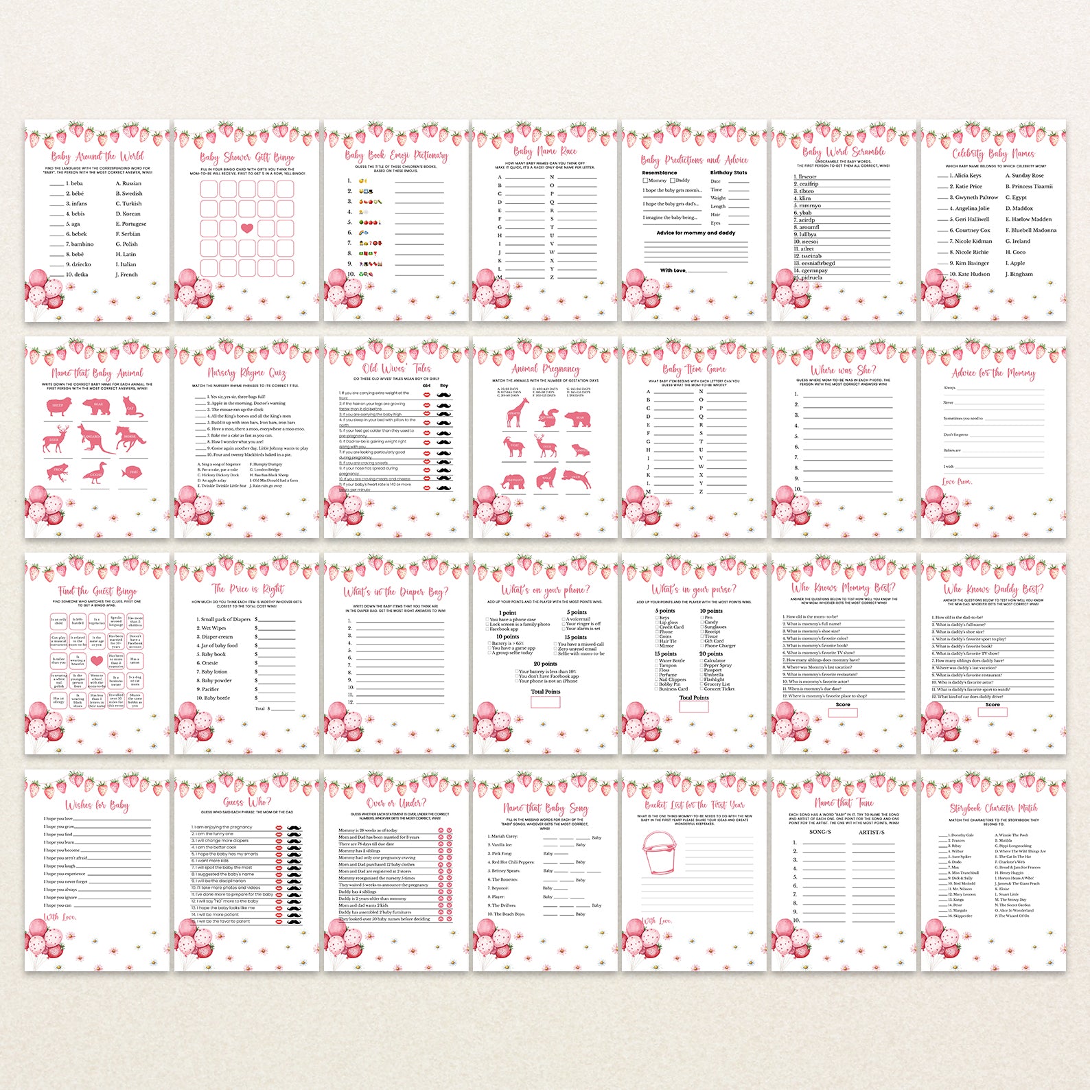 Celebrate the arrival of your little one with our charming summer baby shower game bundle, featuring a delightful pink strawberry theme! This bundle consists of 60 fun and engaging baby shower games, each beautifully designed to complement your berry sweet celebration. Adorned with playful pink balloons, strawberry-shaped accents, and cascading daisy flowers, this game bundle is perfect for keeping your guests entertained and creating lasting memories. Set the tone for a joyful gathering filled with laughter and love!