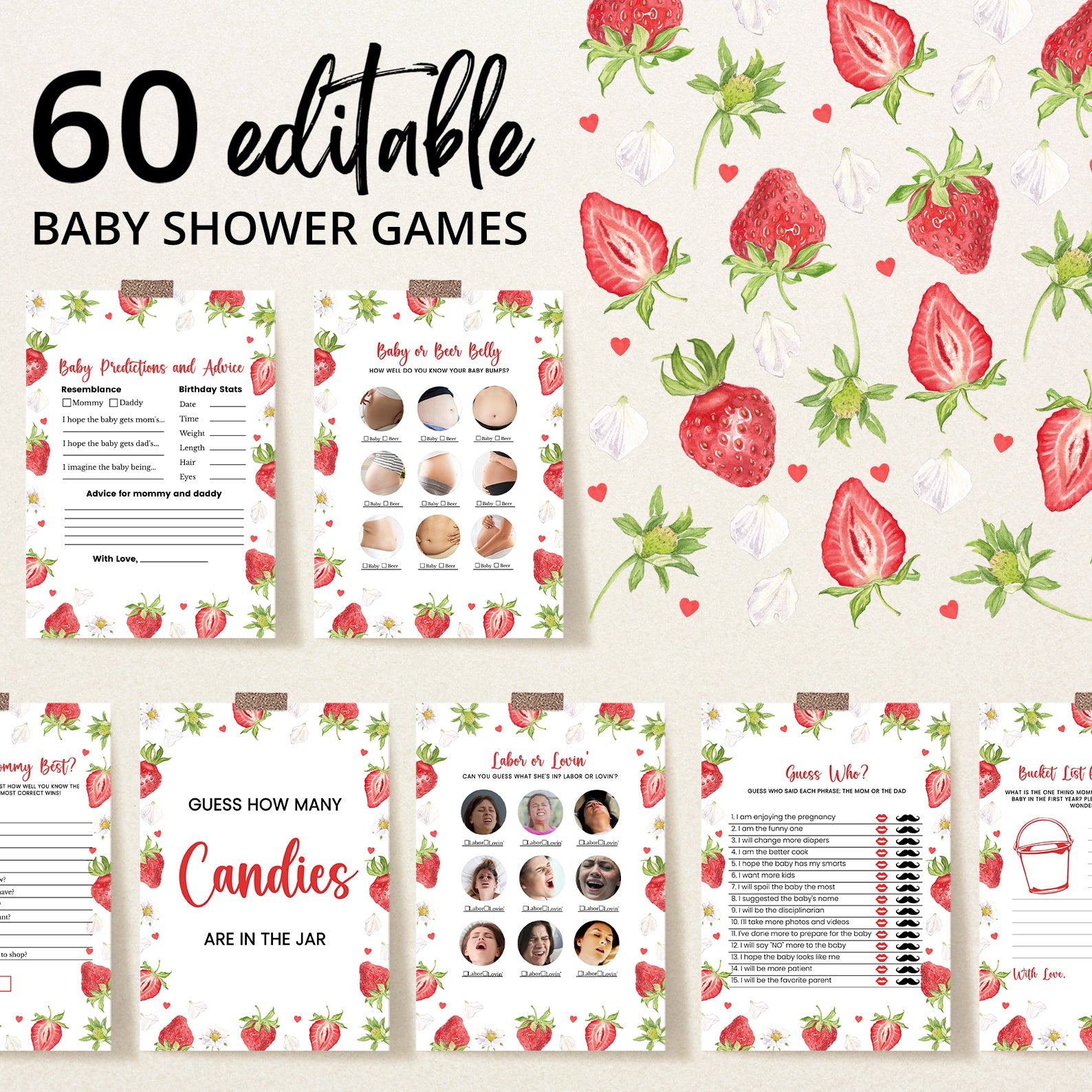 Add a berry sweet touch to your celebration with this delightful bundle of 60 editable baby shower games, perfectly designed to complement your strawberry-themed invitation. Featuring playful hearts, fresh strawberries, and vibrant floral accents, this collection brings a fun and cheerful vibe to your gathering. Fully customizable, each game is easy to personalize, ensuring your guests have a delightful time. Whether you're enjoying a cozy afternoon or a lively celebration, this bundle will add a touch of sweetness to your baby shower and make it a memorable event.