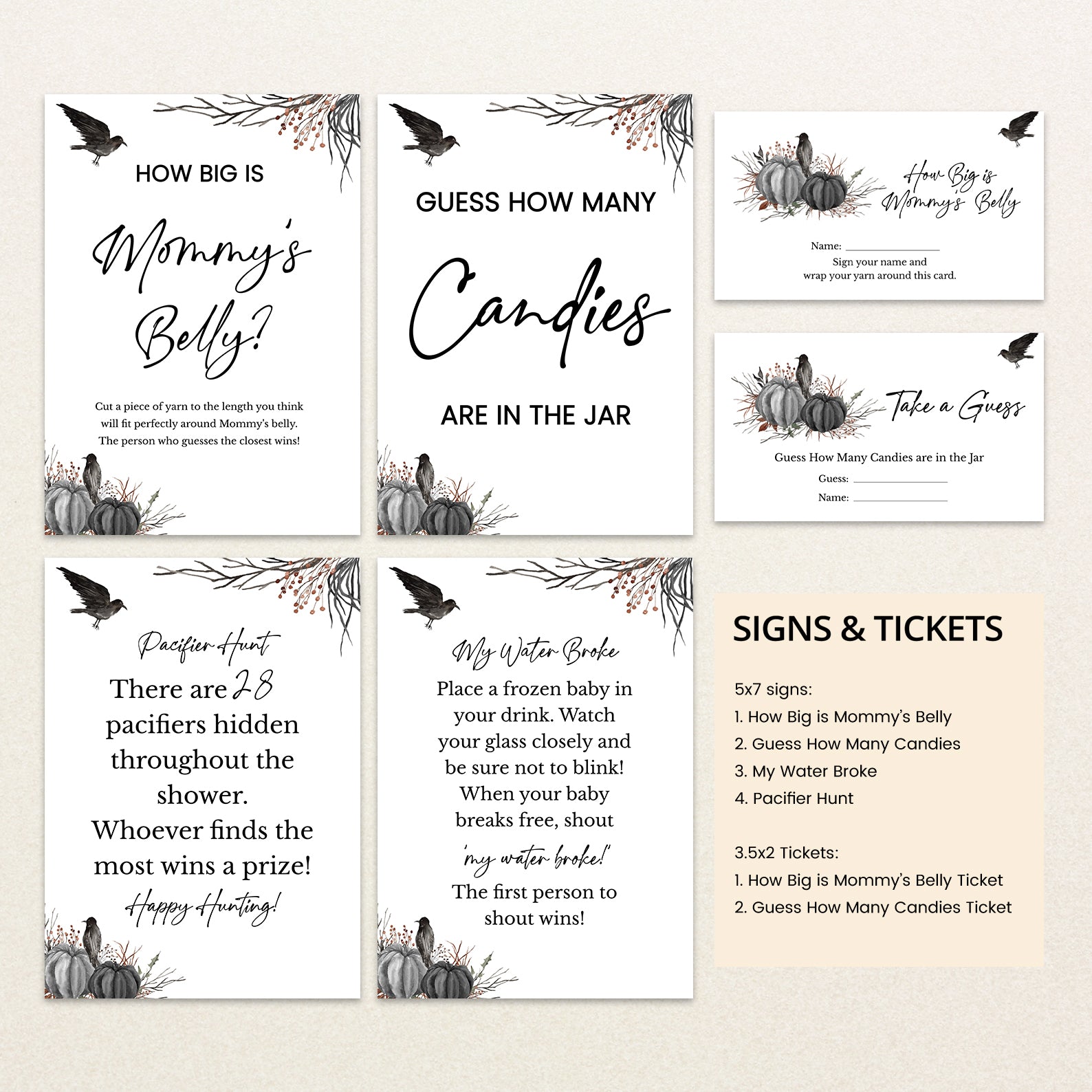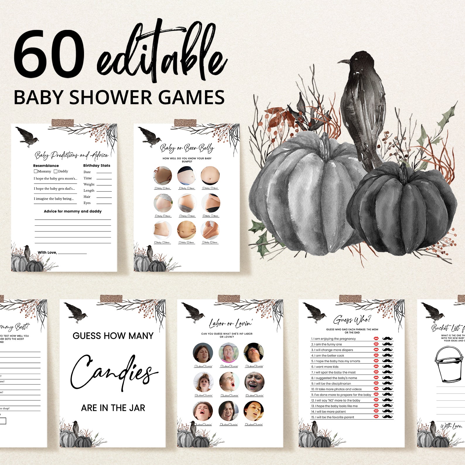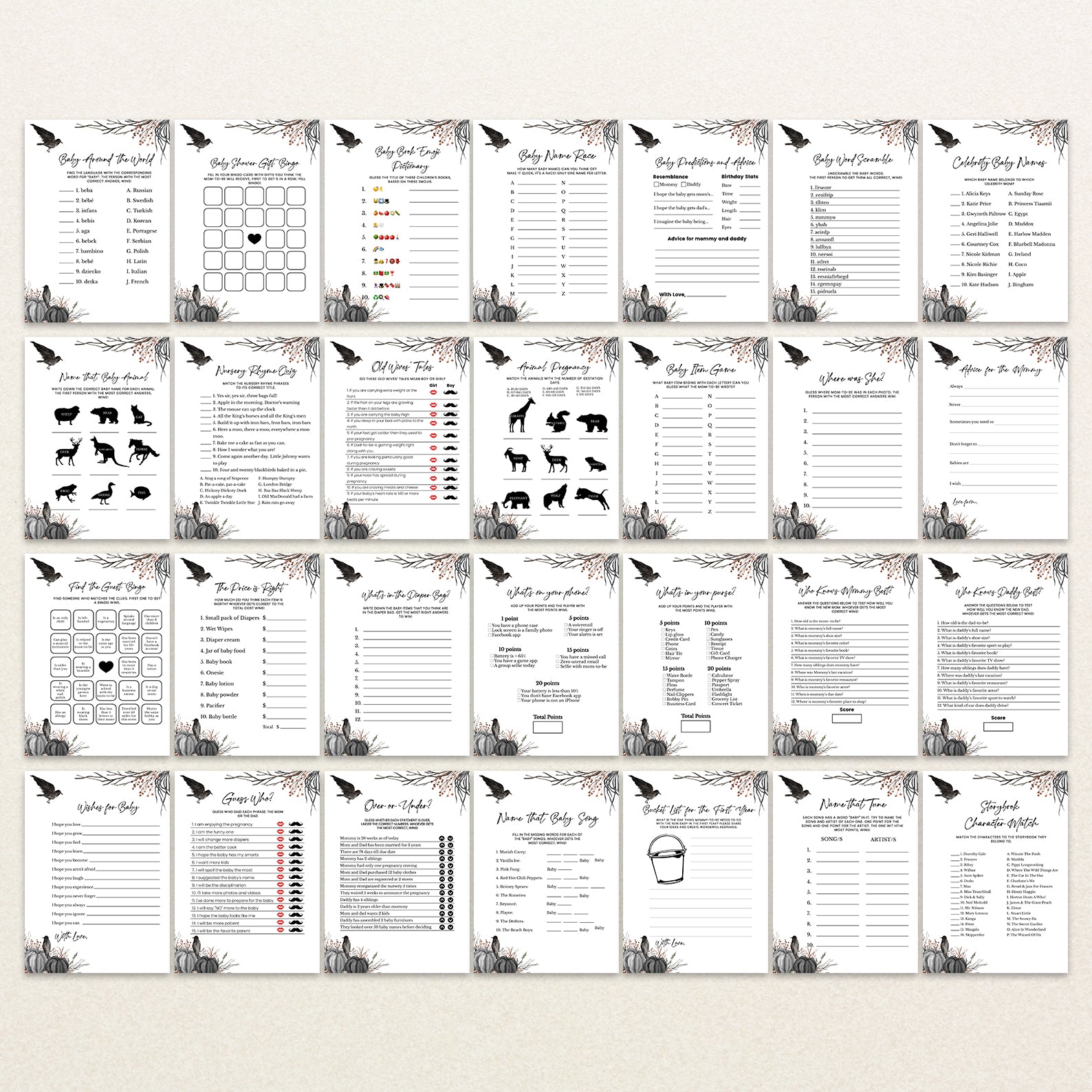 Bring a touch of autumn magic to your baby shower with our Halloween Baby Shower Game Bundle! This set includes editable games, designed to keep your guests entertained and add a festive flair to your celebration. Featuring themes of autumn leaves, black pumpkins, and a crow, these games perfectly complement your Halloween-inspired event.