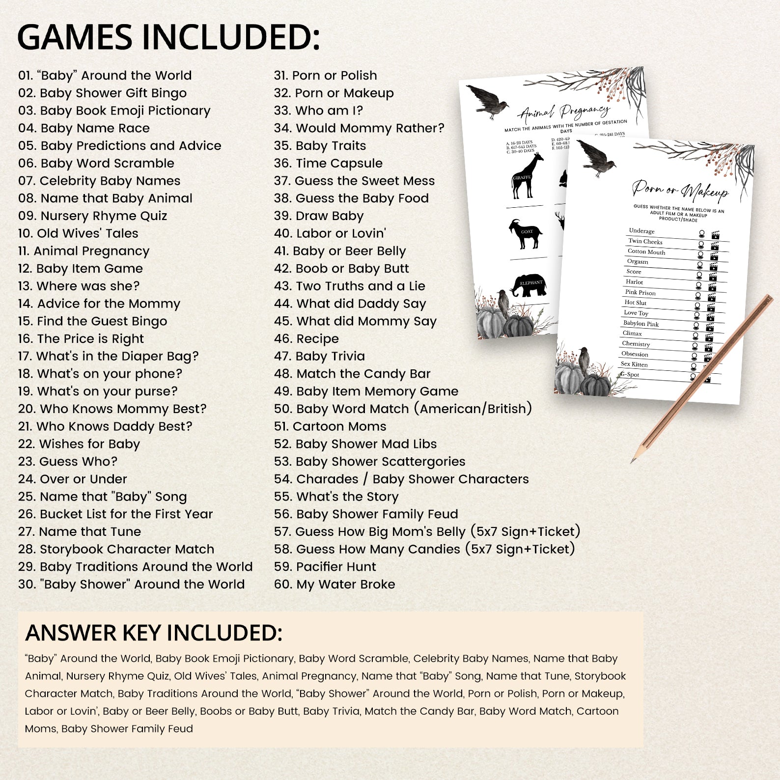 Customize each game to fit your unique style and create a memorable experience for everyone. Whether you’re celebrating a little one on the way or just love the season, our game bundle is your key to a fun and stylish baby shower. Celebrate with seasonal elegance and unforgettable fun using our Halloween game bundle!