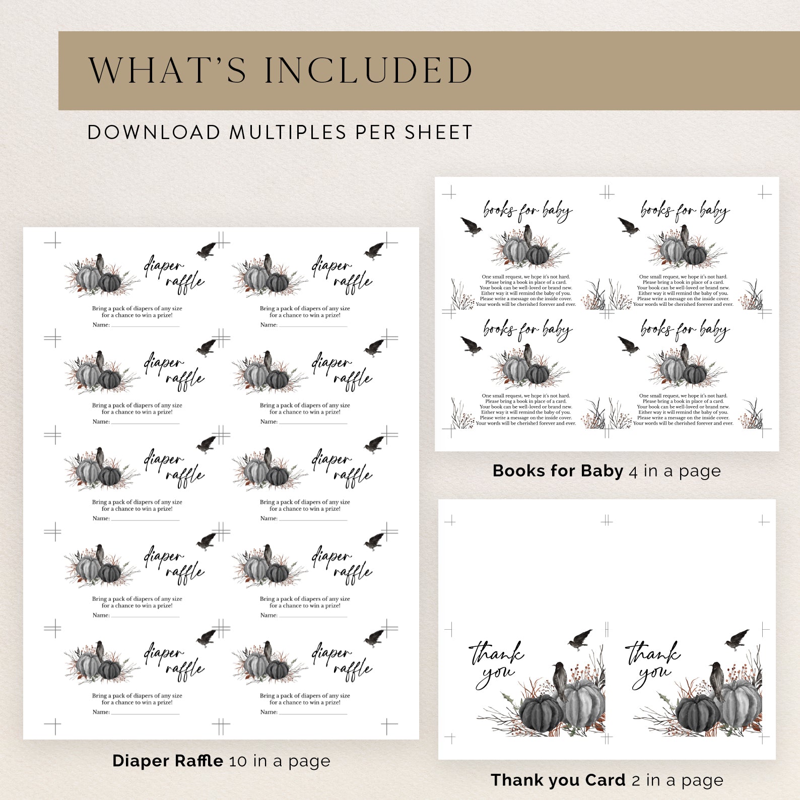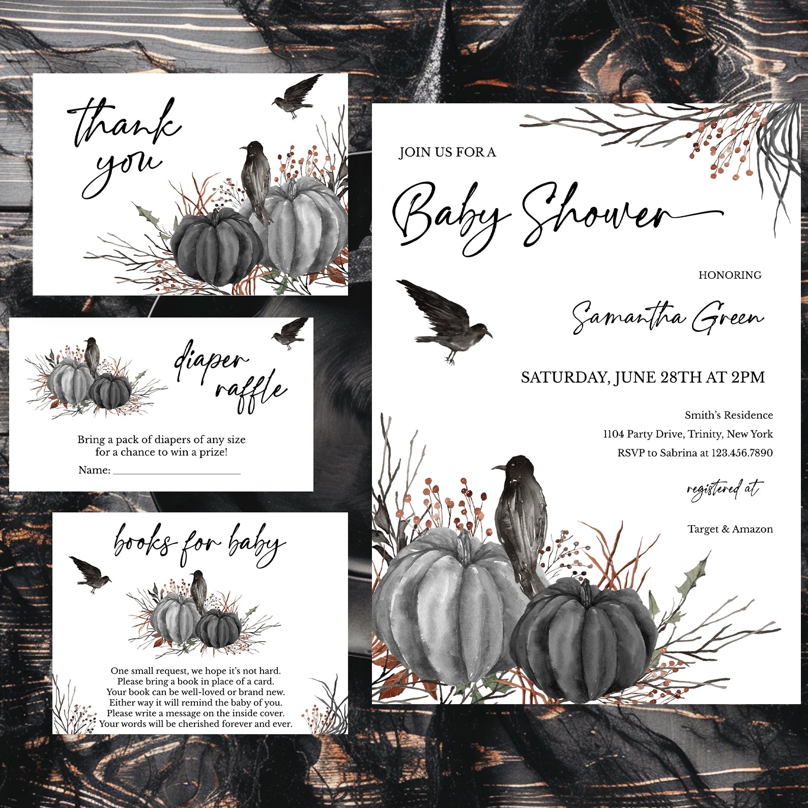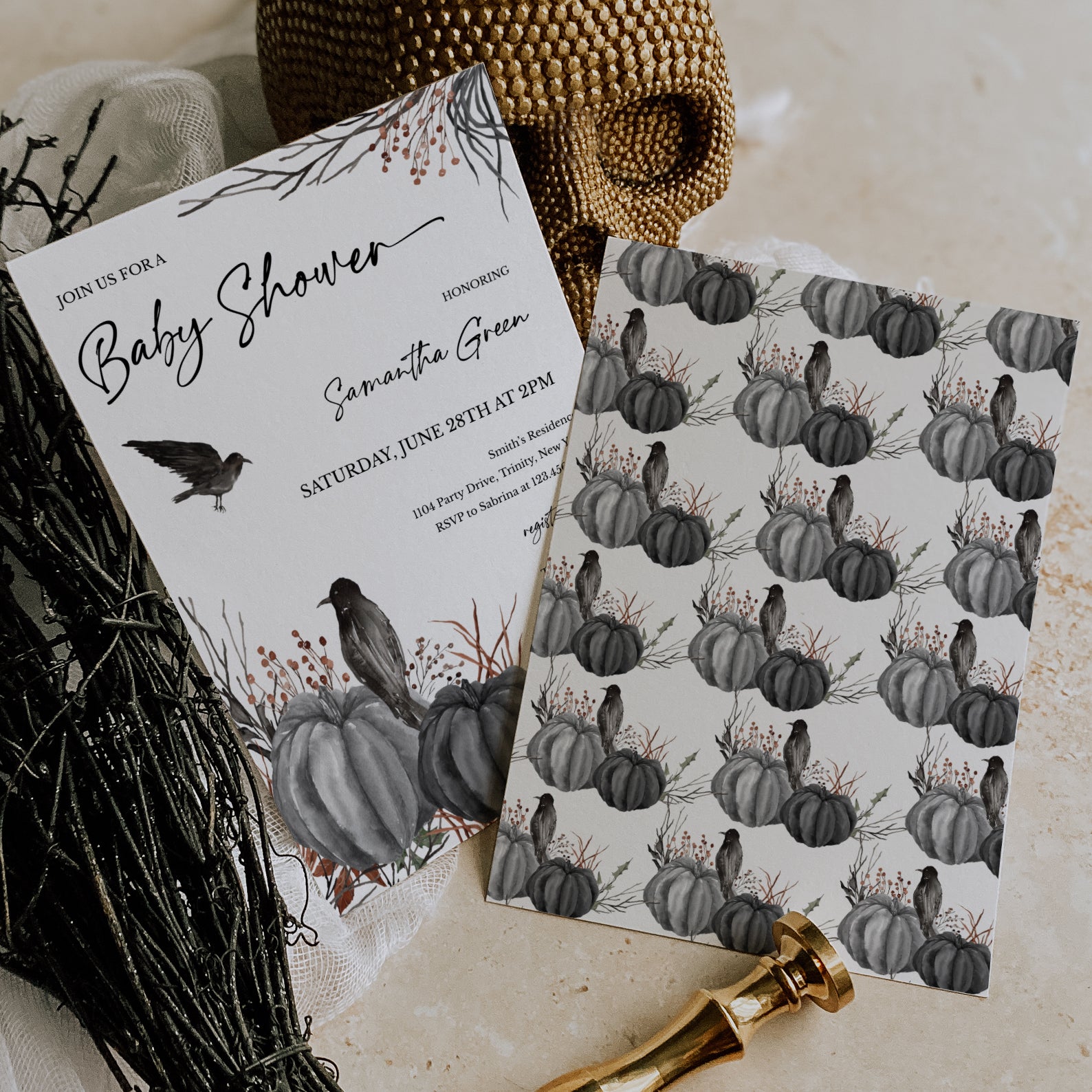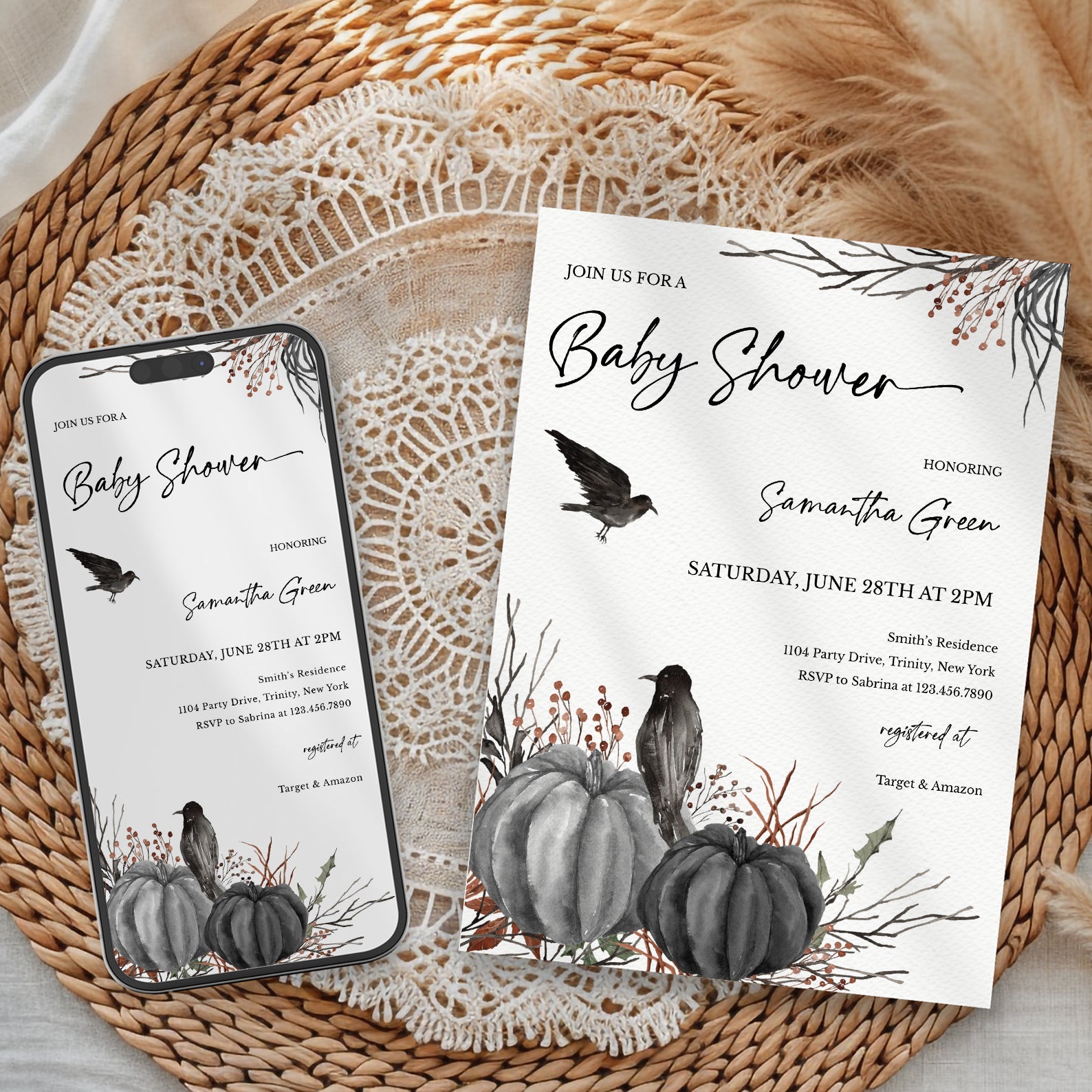 Minimal Halloween Digital Baby Shower Invite Bundle: Crow & Pumpkin