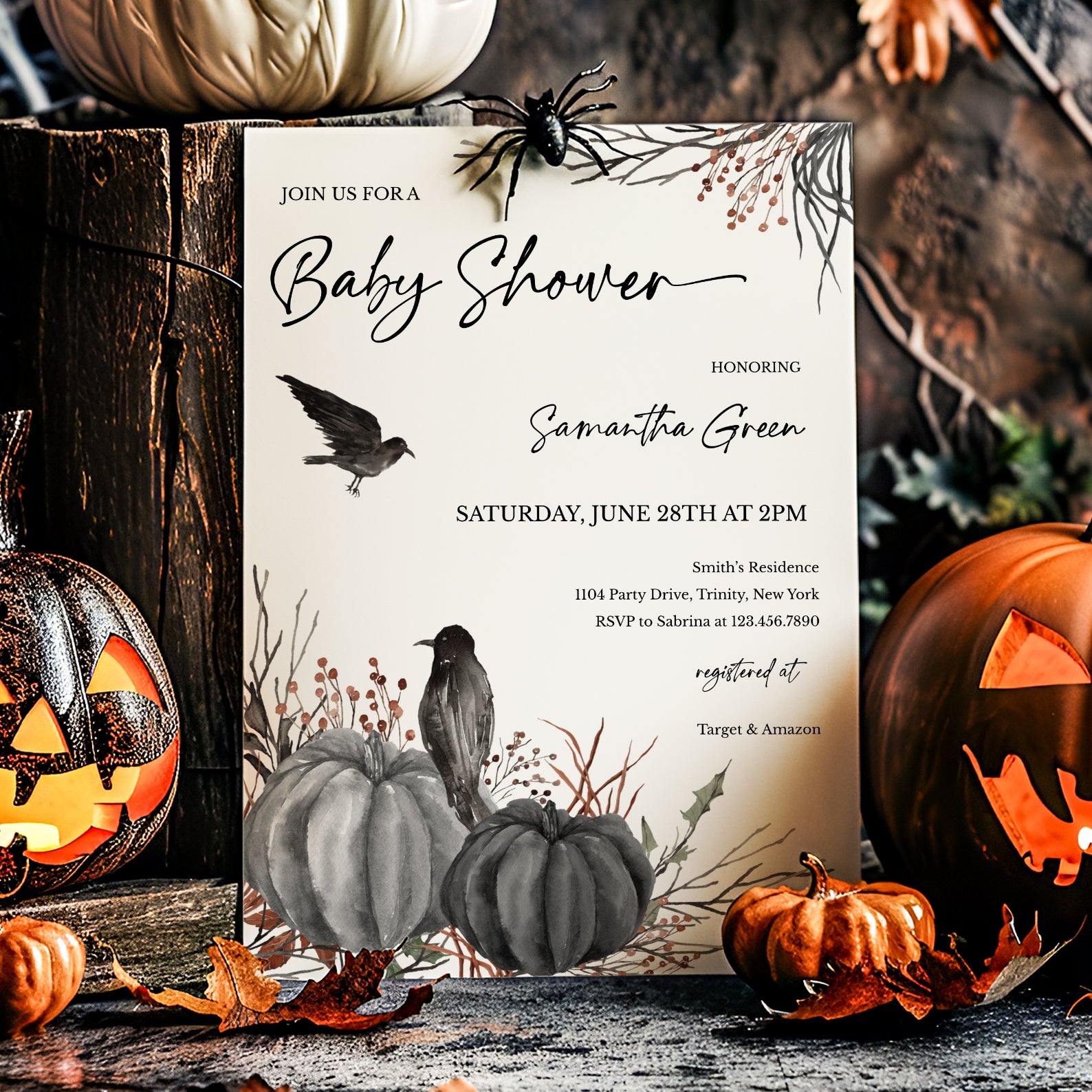 Invitation: Our contemporary design features autumn leaves, whimsical black pumpkins, and a playful crow, setting a cozy and inviting tone for your Halloween-themed baby shower. It combines a modern aesthetic with a hint of spooky fun, perfect for your little one’s big debut.