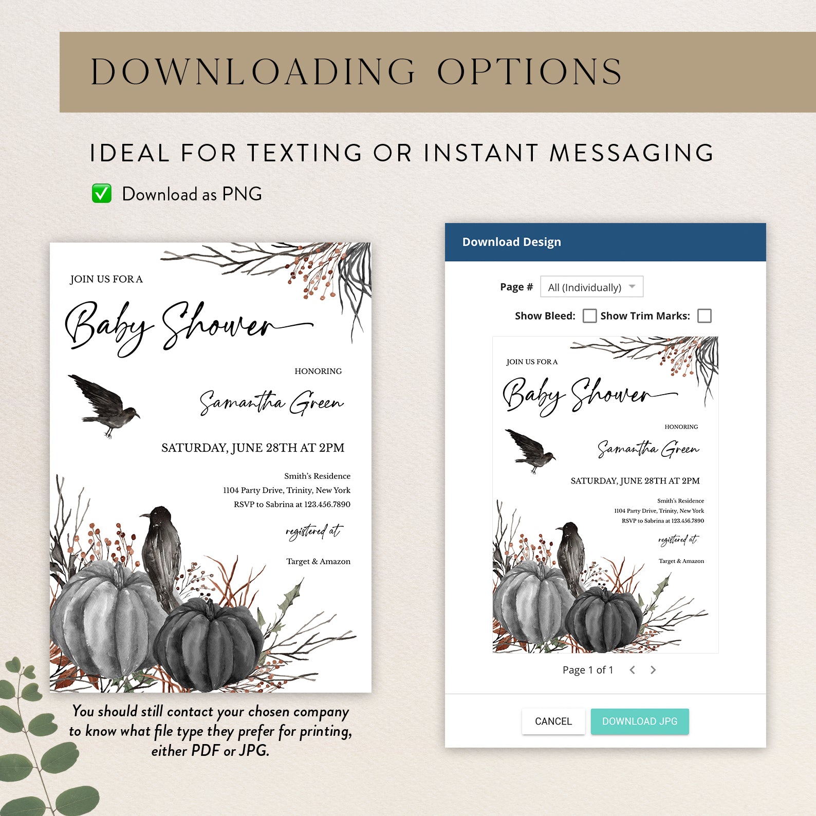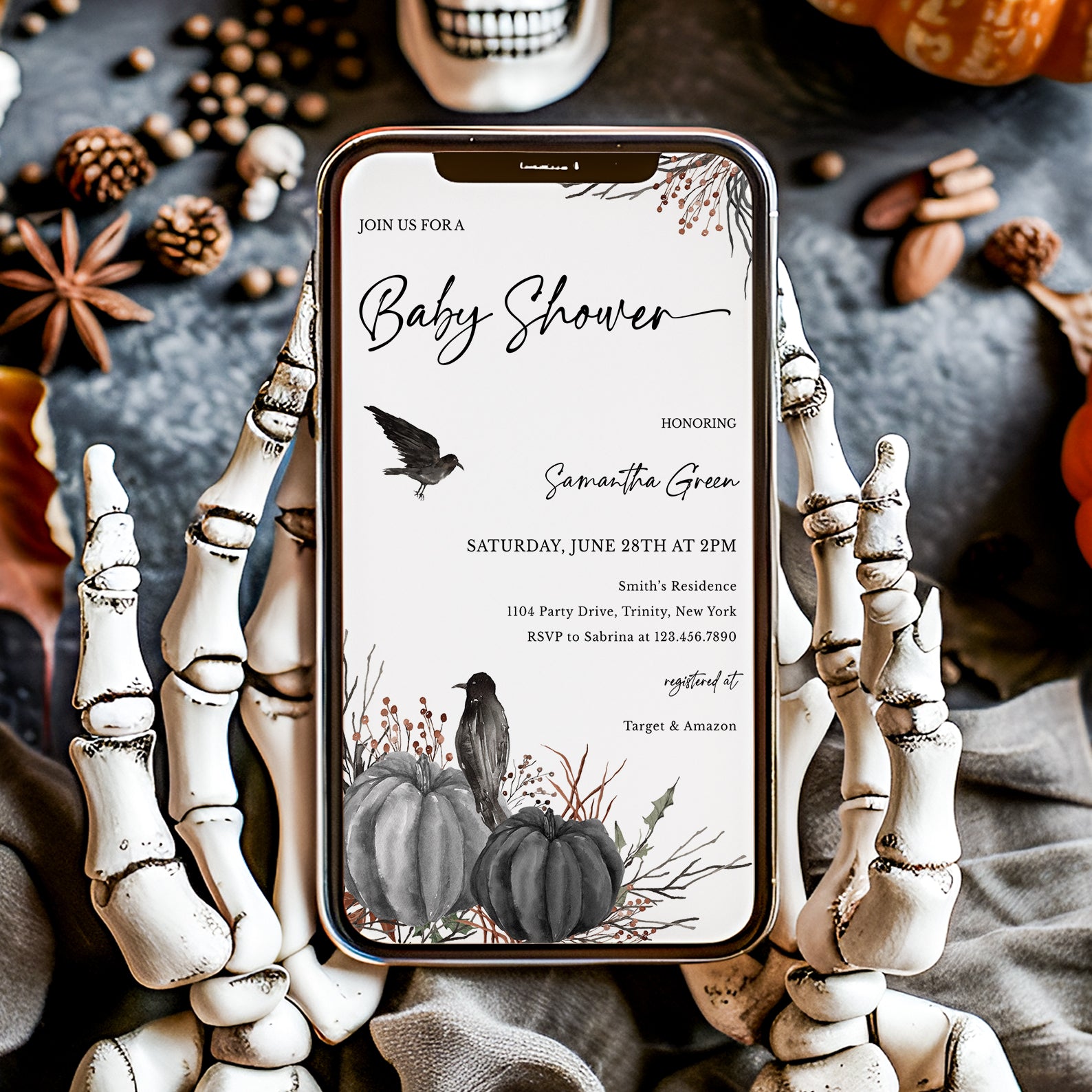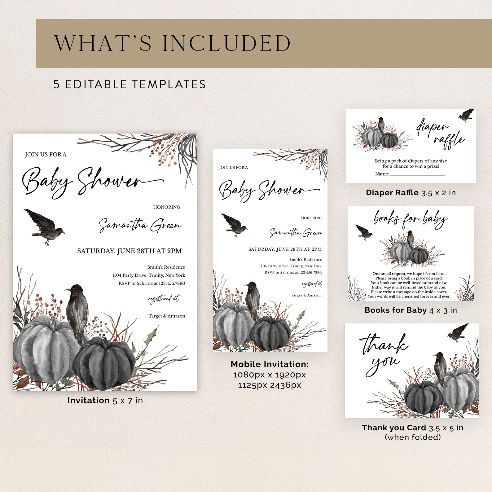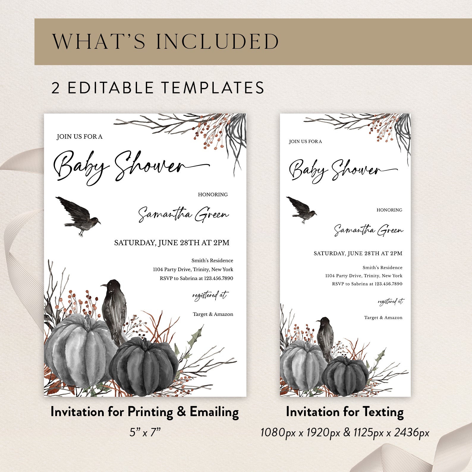 1. Purchase this Minimal Halloween Digital Baby Shower Invite Bundle: Crow & Pumpkin template