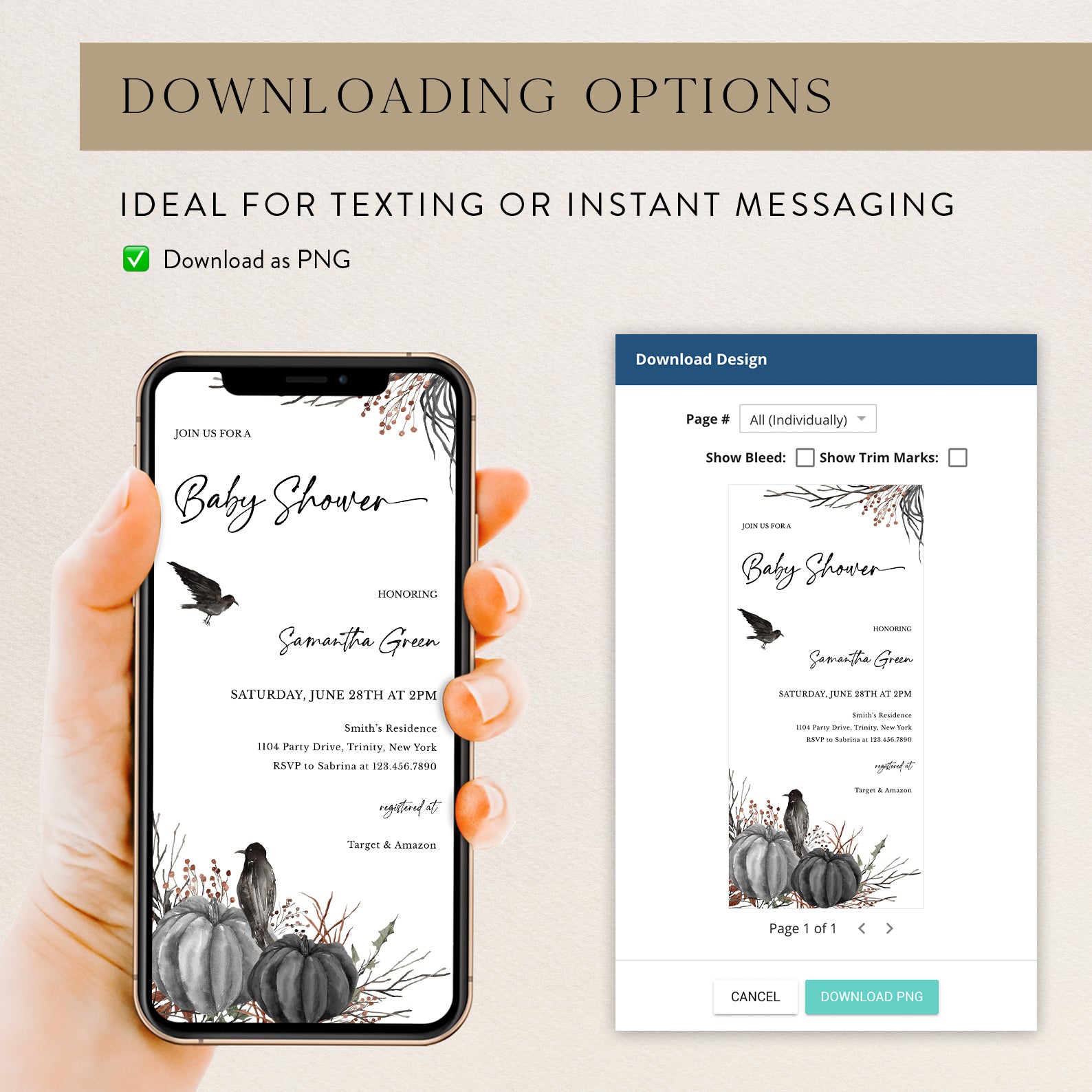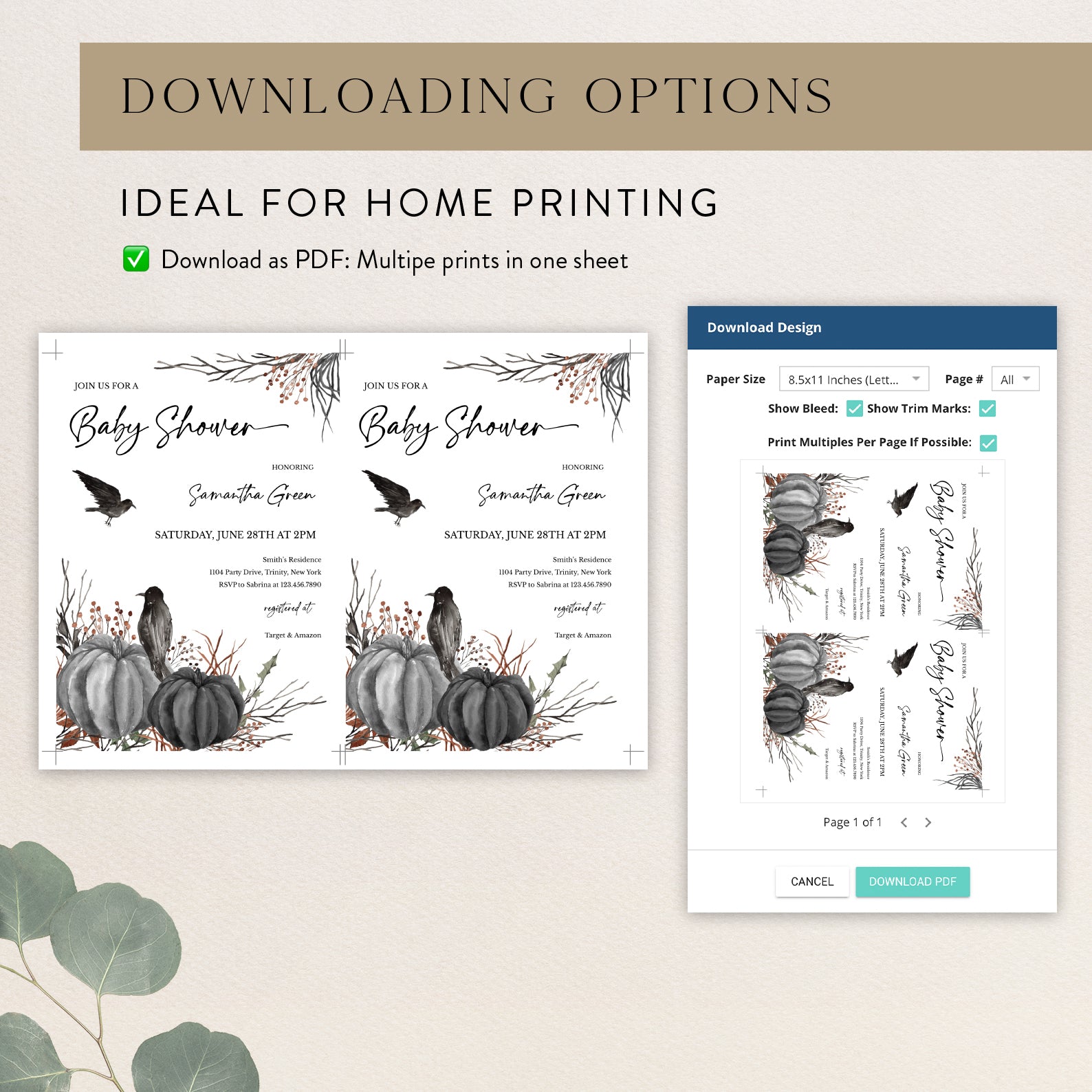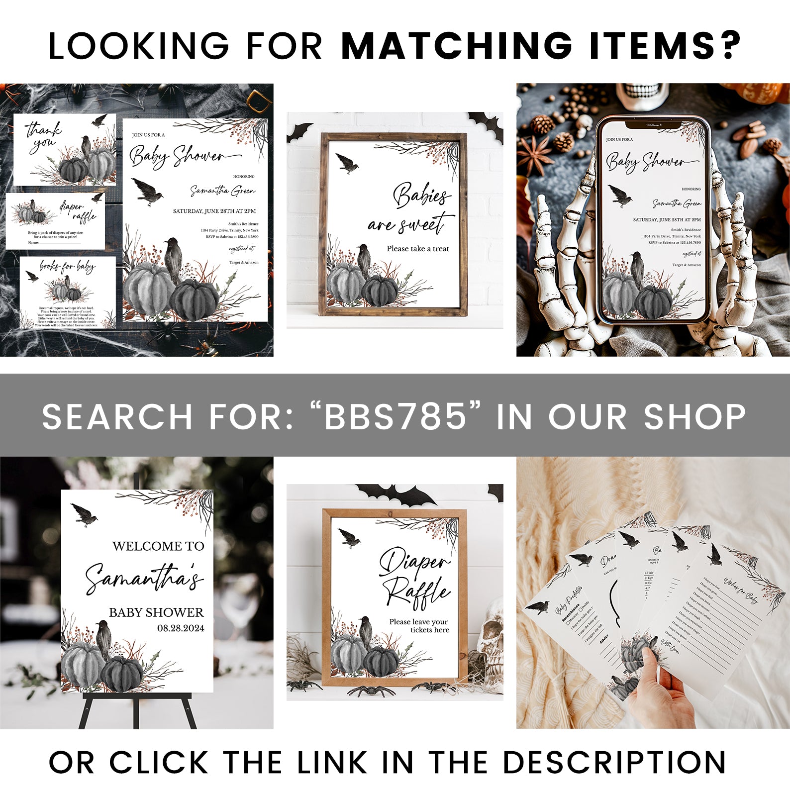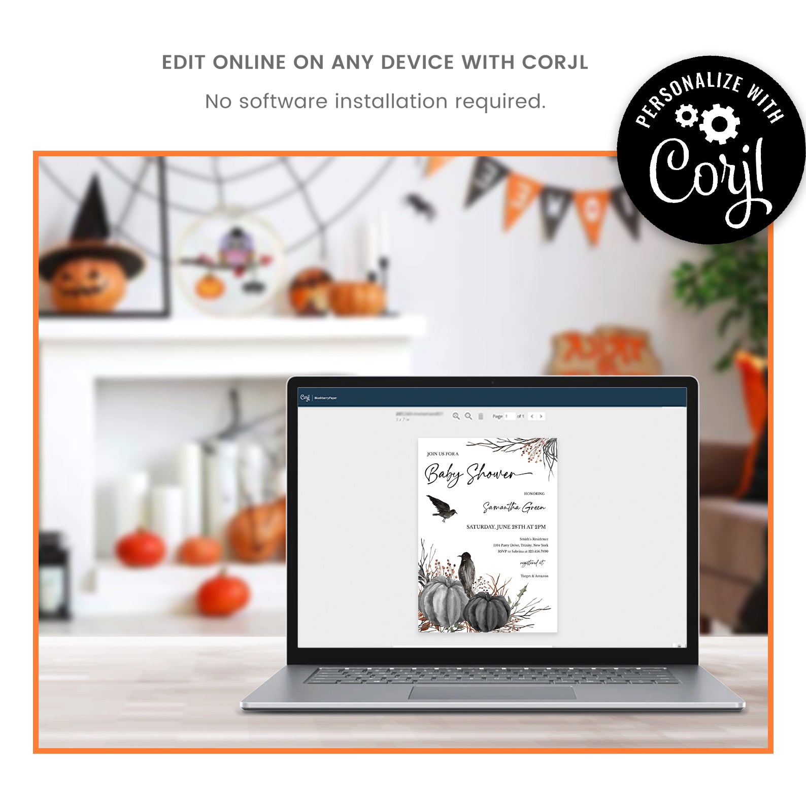 1. Purchase this Minimal Halloween Digital Baby Shower Invite Bundle: Crow & Pumpkin template