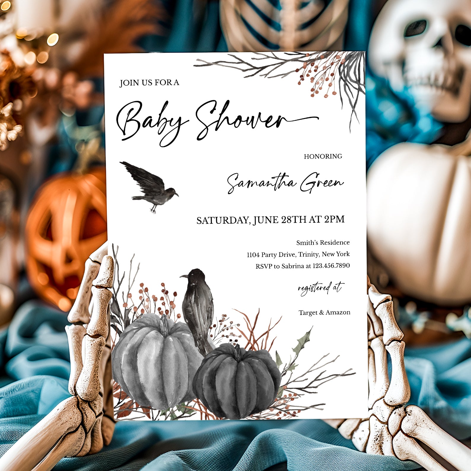 Minimal Halloween Digital Baby Shower Invite: Crow & Pumpkin
