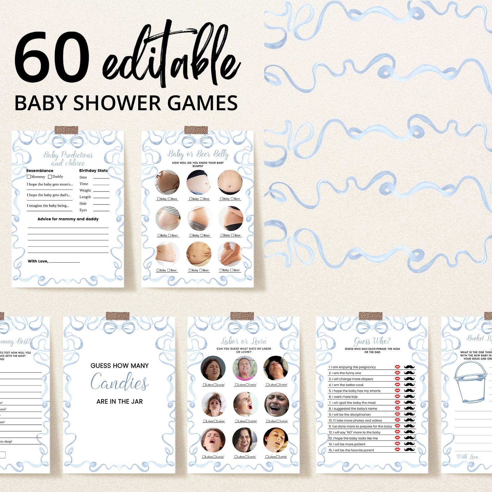 - Purchase this Blue Baby Shower Game Bundle with Wavy Border & Ribbon Top template