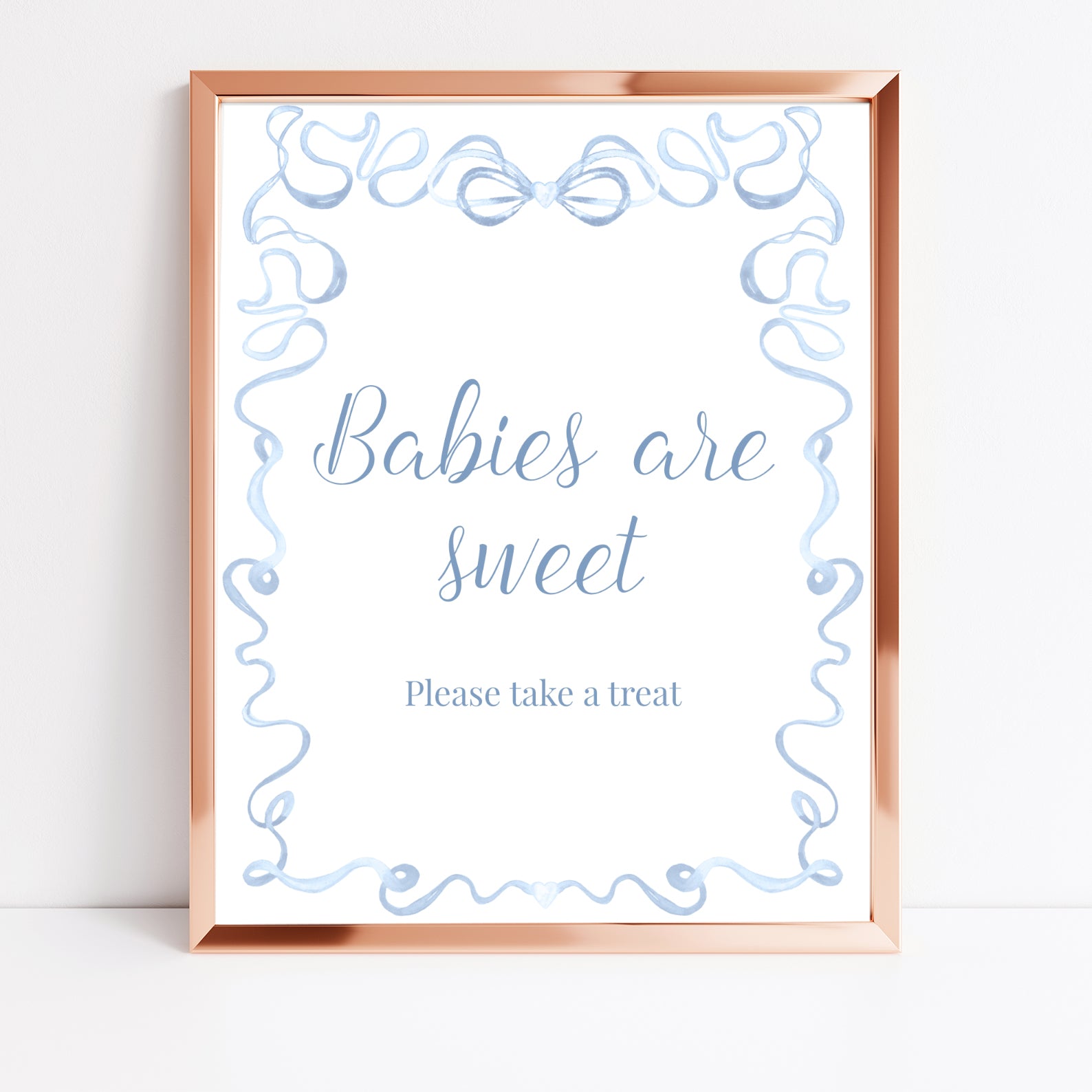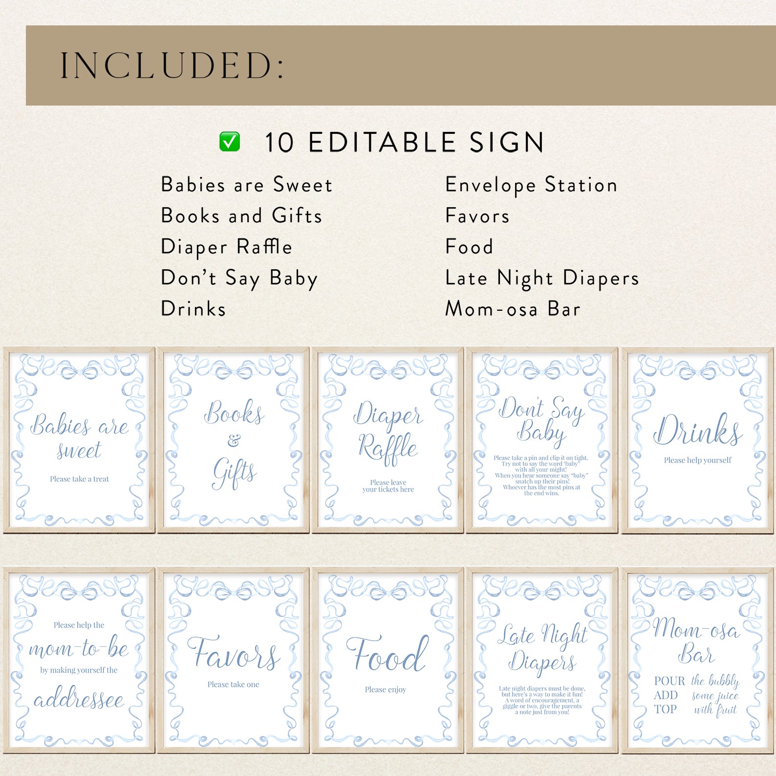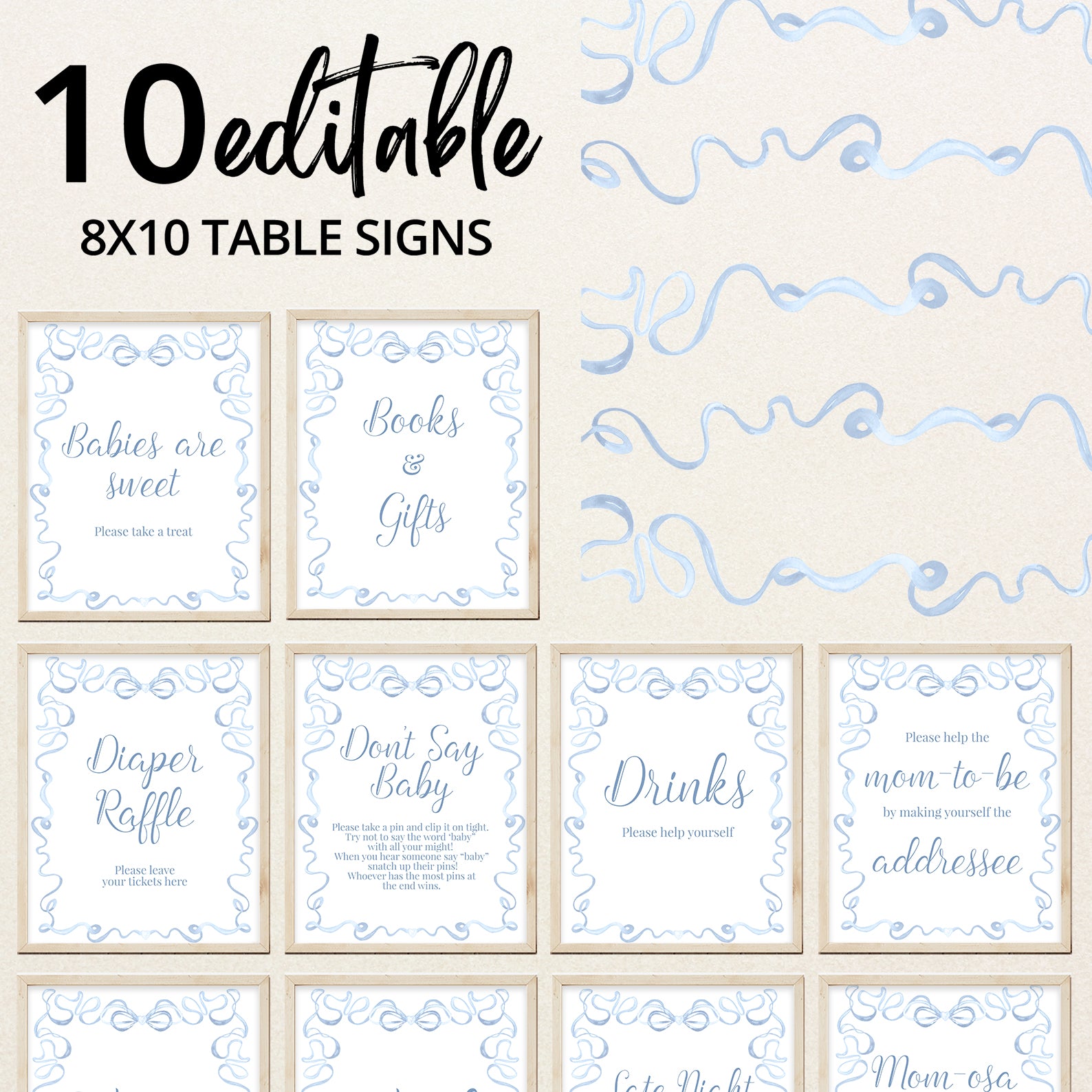 Add a charming touch to your baby shower with our blue-themed table signs, featuring a delightful wavy border and elegant ribbon detail. This set includes ten editable signs: Babies Are Sweet, Books and Gifts, Diaper Raffle, Don't Say Baby, Drinks, Envelope Station, Favors, Food, Late Night Diapers, and Mom-osa Bar—perfect for organizing your celebration in style!