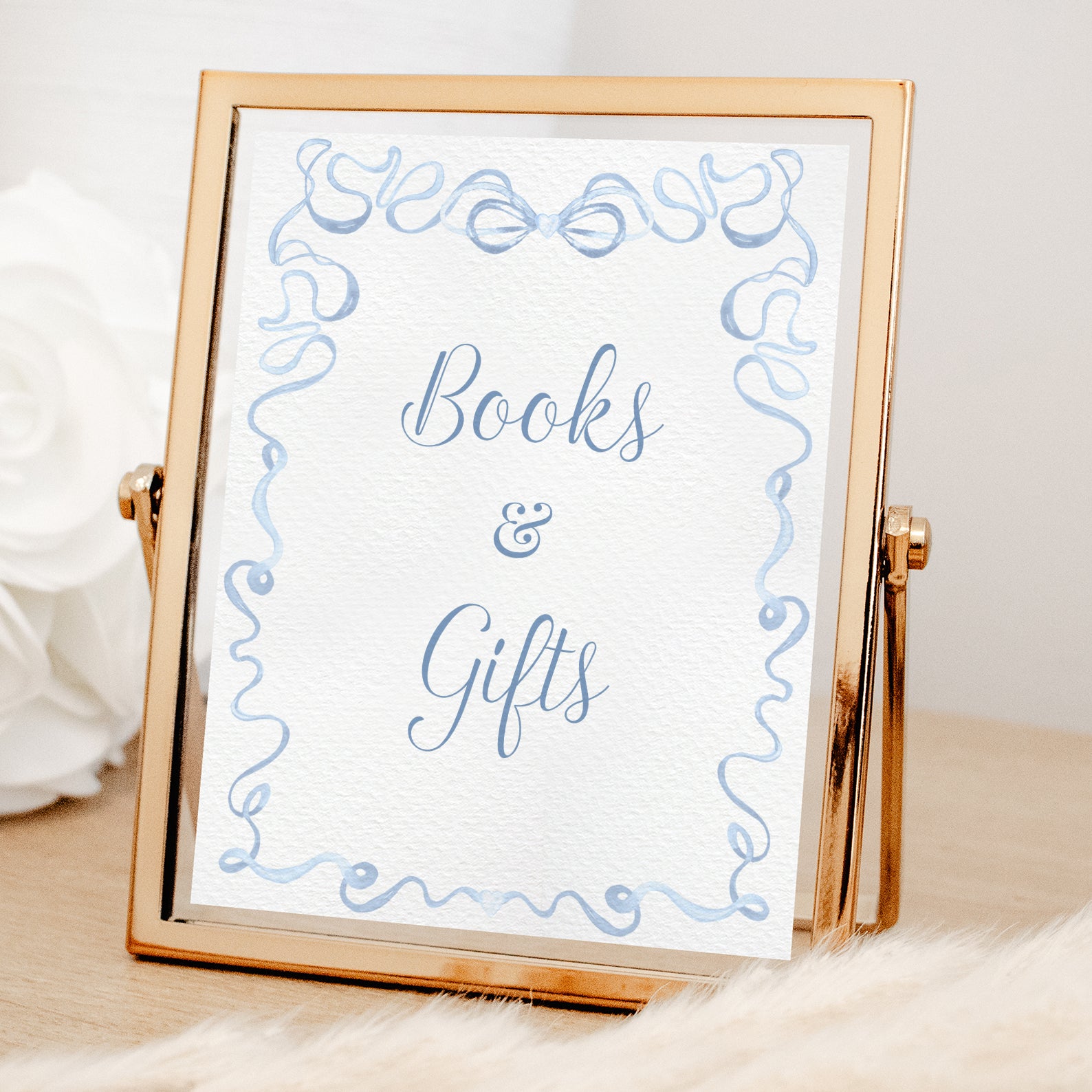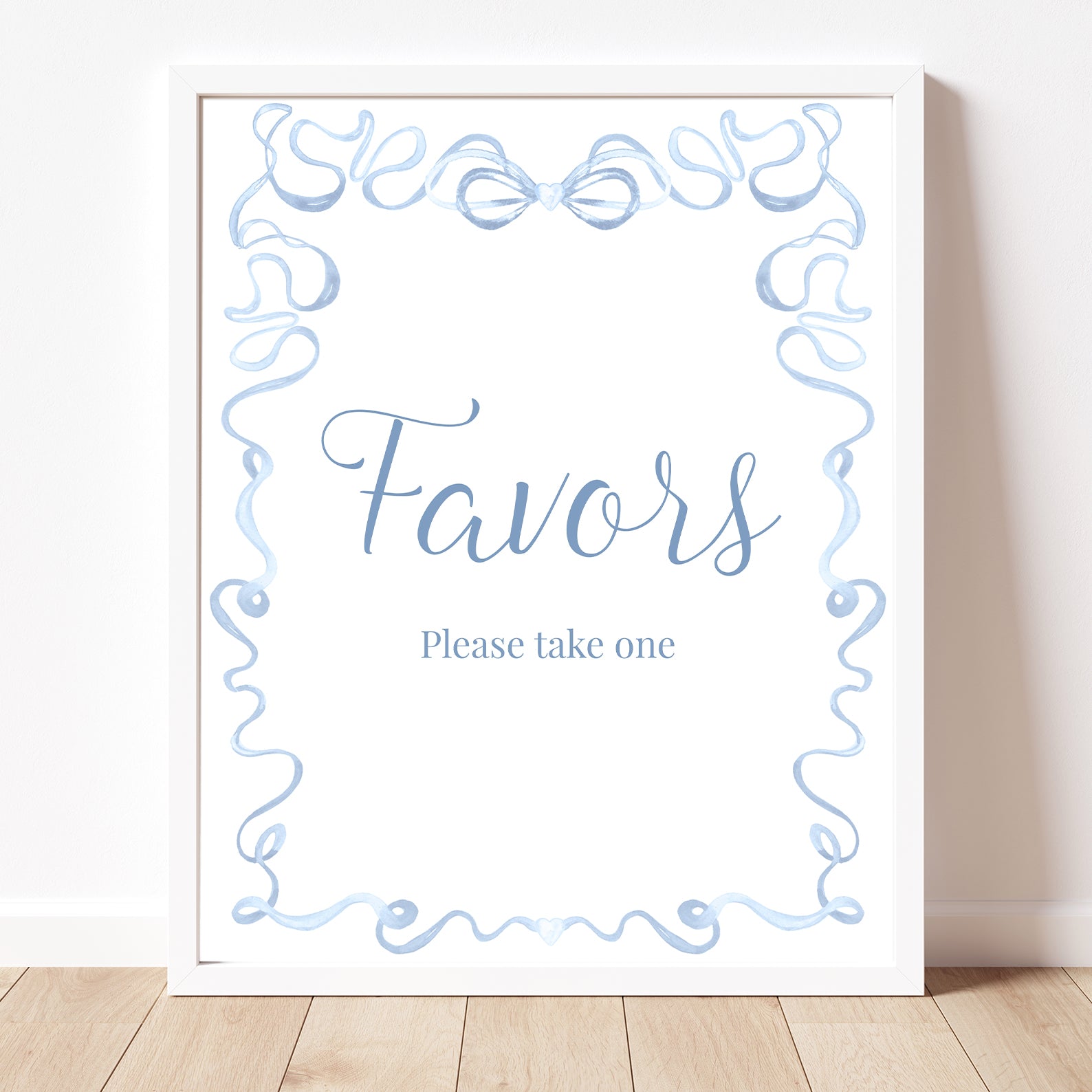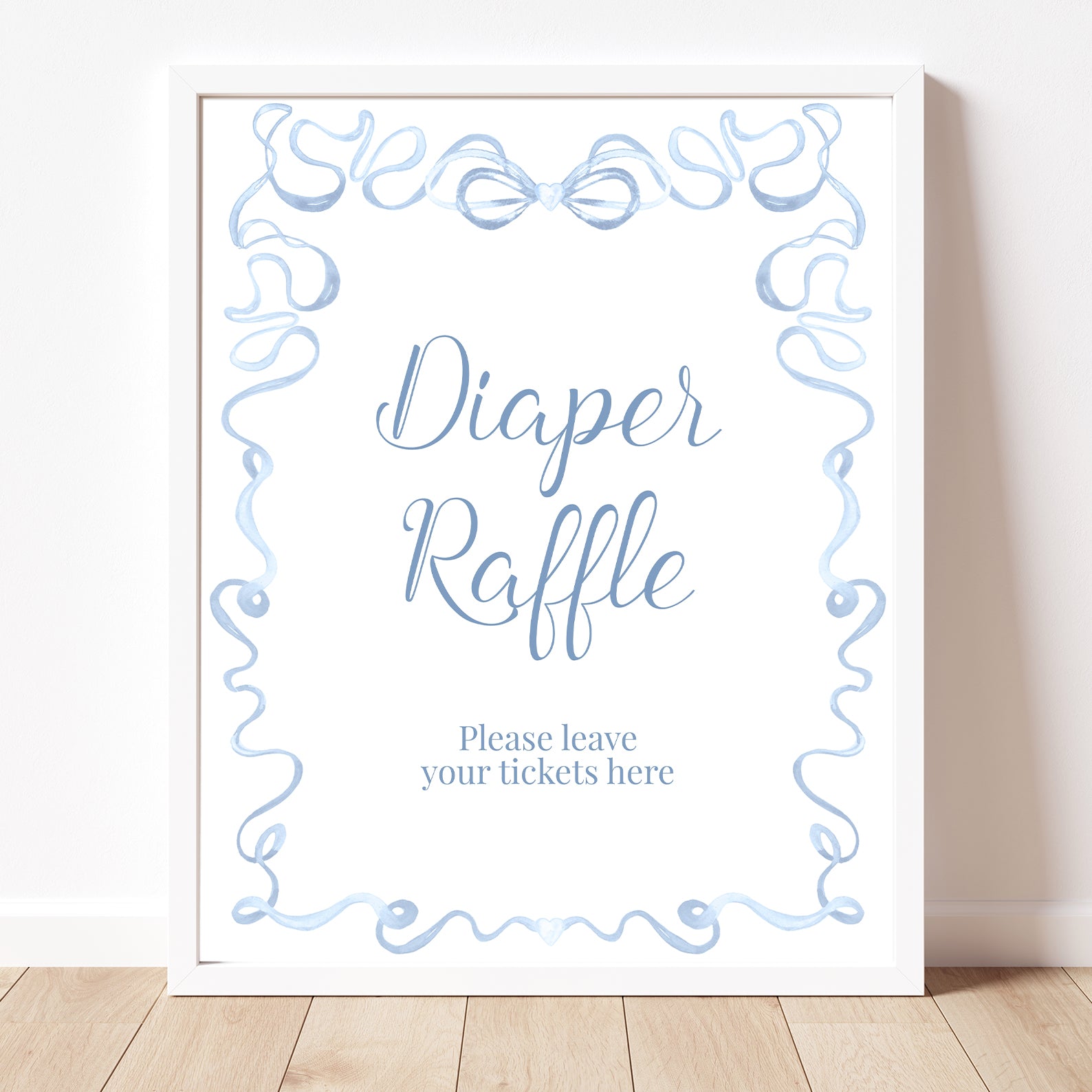 Add a charming touch to your baby shower with our blue-themed table signs, featuring a delightful wavy border and elegant ribbon detail. This set includes ten editable signs: Babies Are Sweet, Books and Gifts, Diaper Raffle, Don't Say Baby, Drinks, Envelope Station, Favors, Food, Late Night Diapers, and Mom-osa Bar—perfect for organizing your celebration in style!