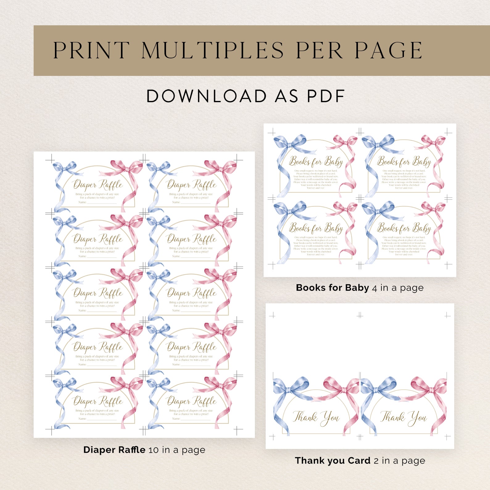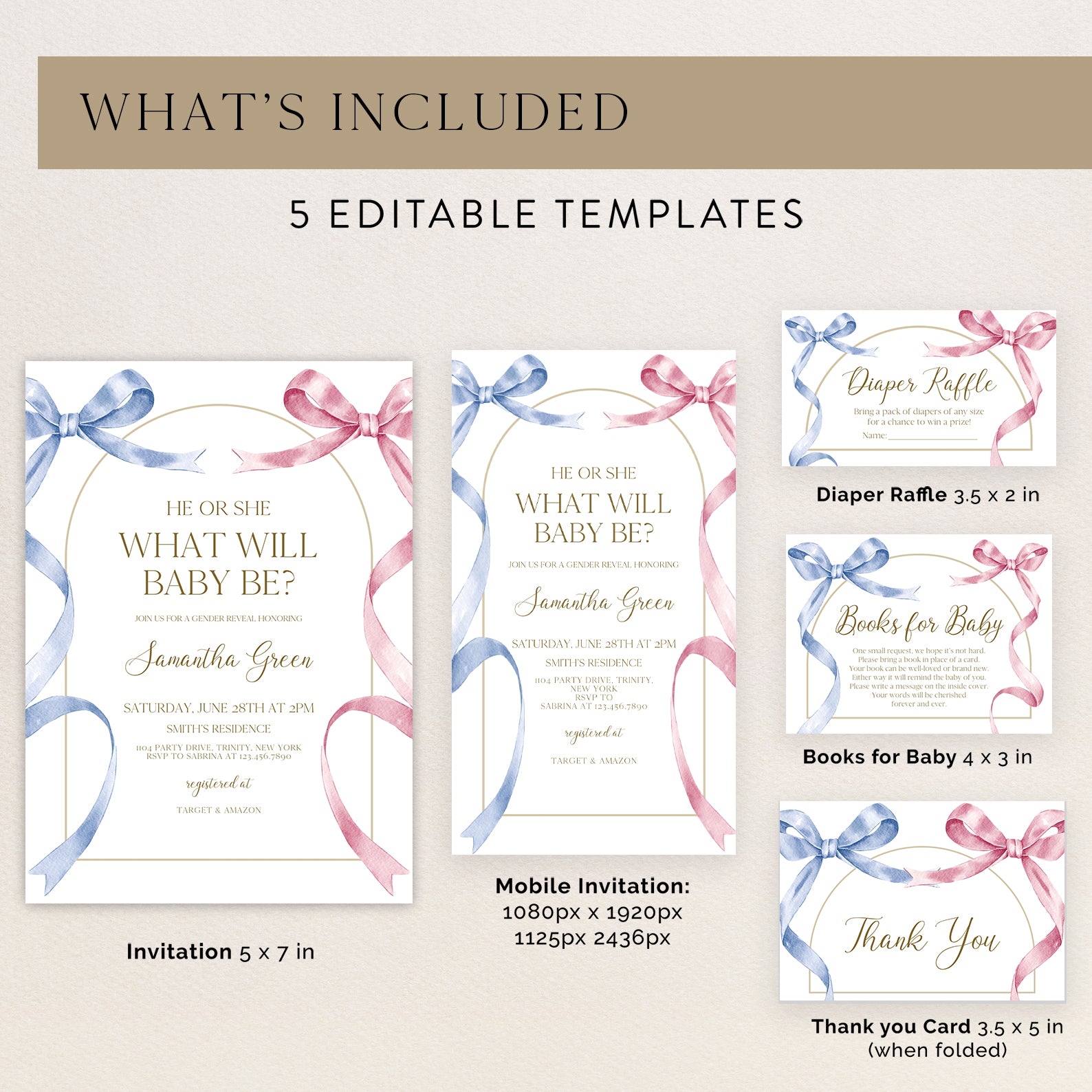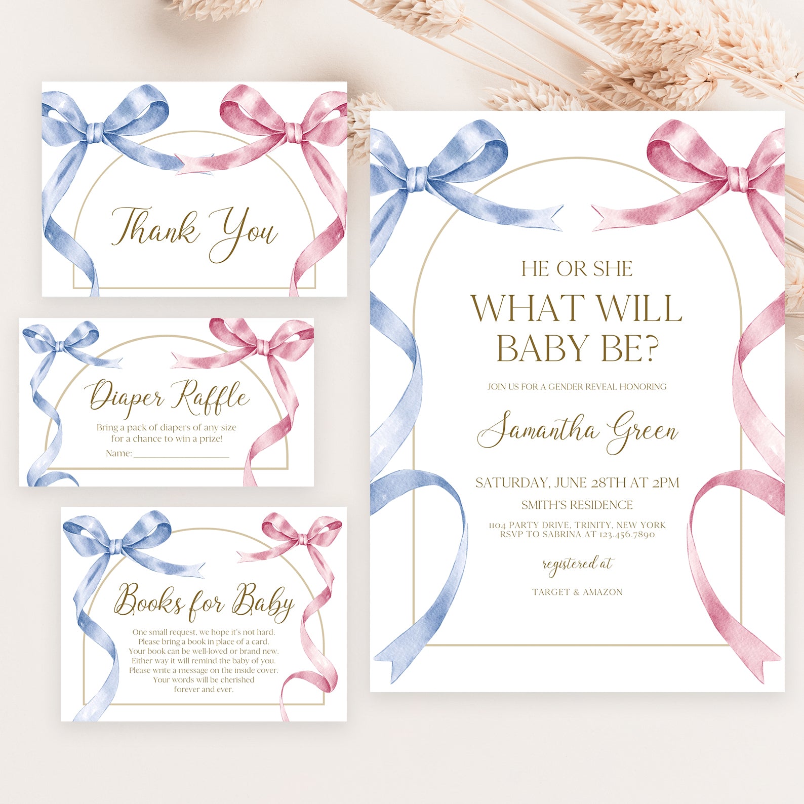 Celebrate the excitement of your gender reveal with this evergreen digital invitation bundle! Featuring a stylish gold arch with playful blue and pink ribbons, this set includes an invitation, mobile invite, diaper raffle, books for baby card, and thank you card. Perfect for sharing the joy and creating lasting memories with your loved ones.