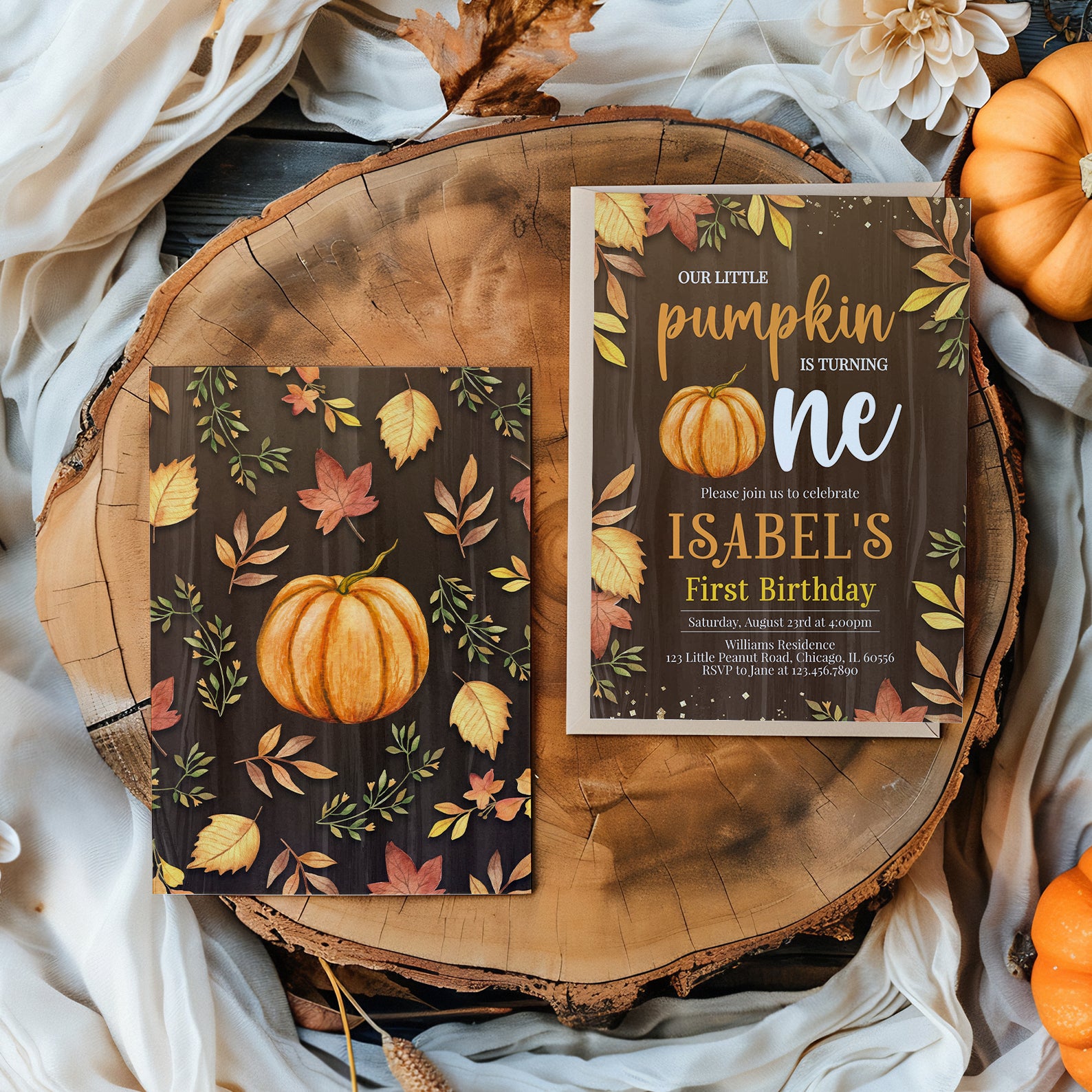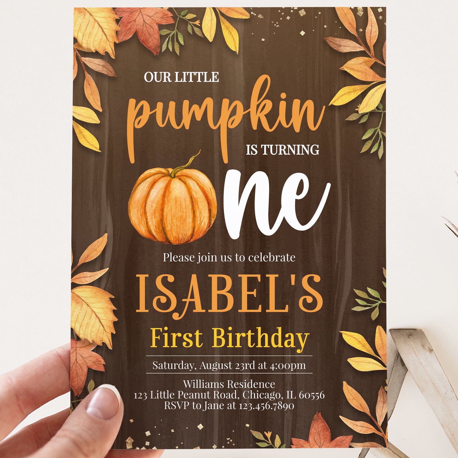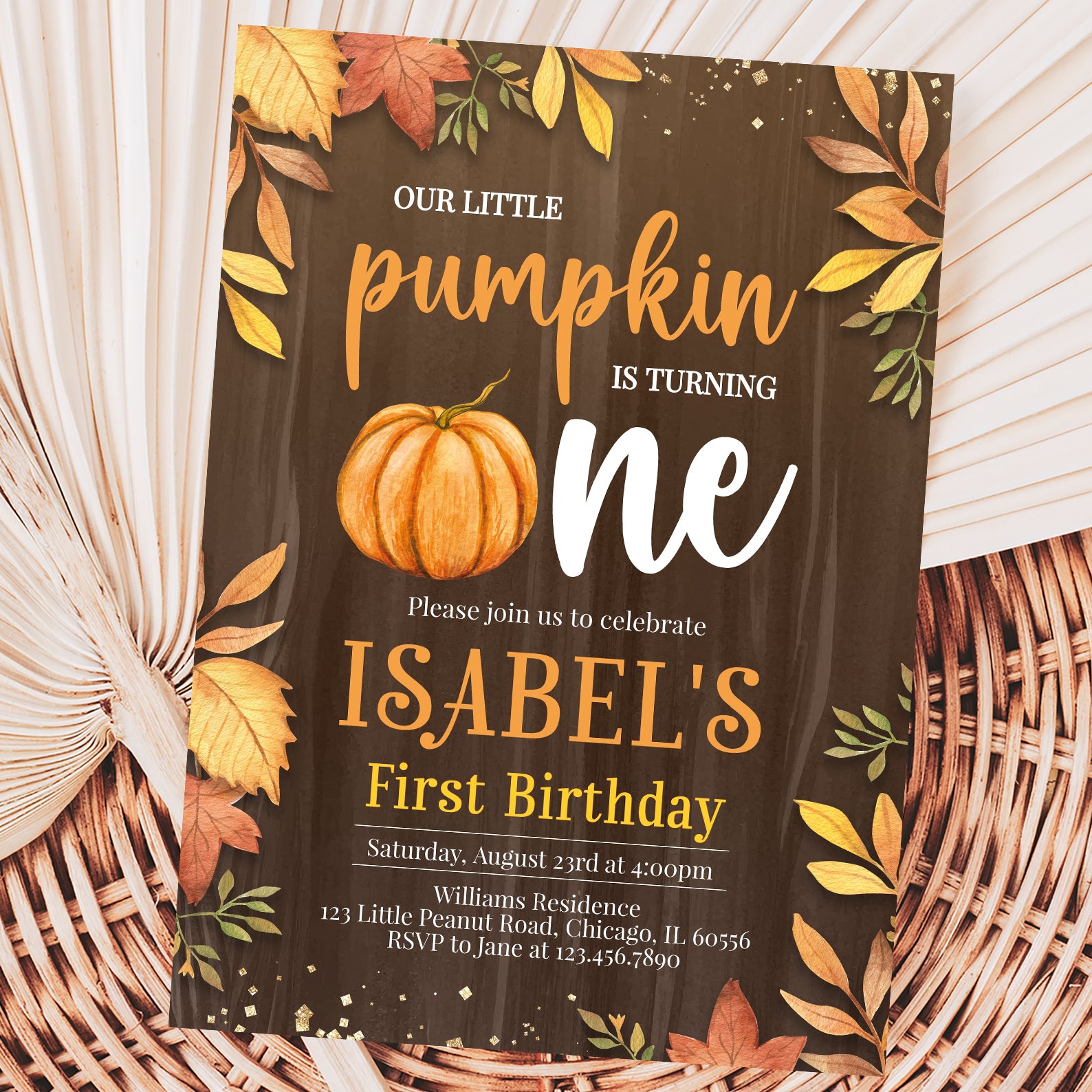 - Purchase this Little Pumpkin Turns One Fall Invite with Leaves & Gold template