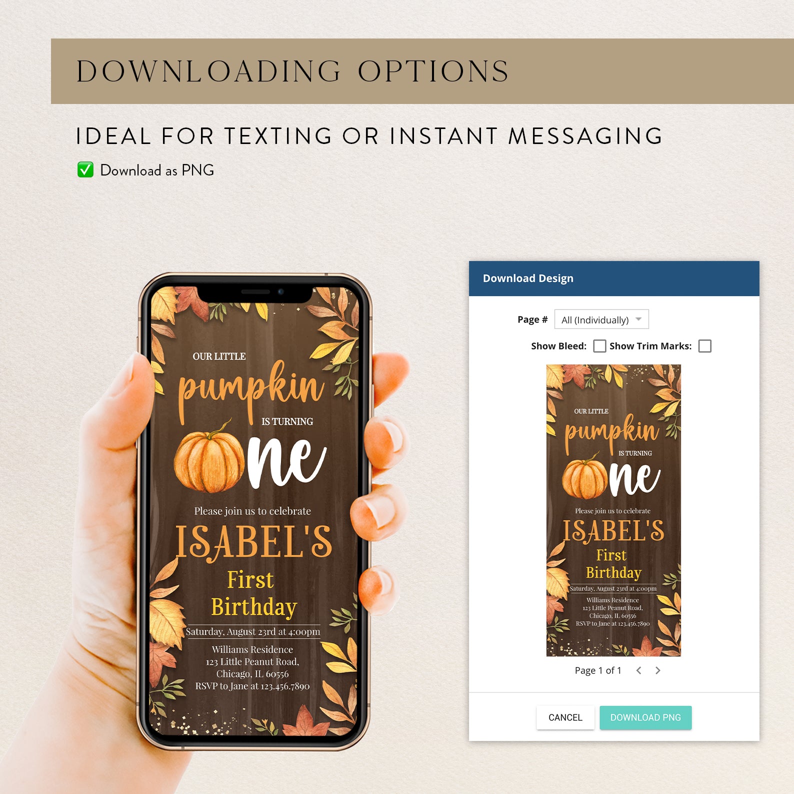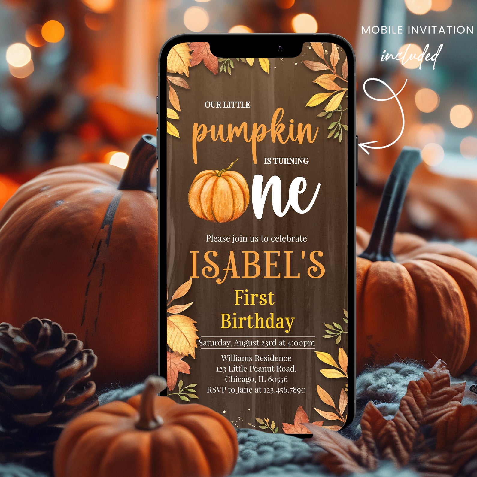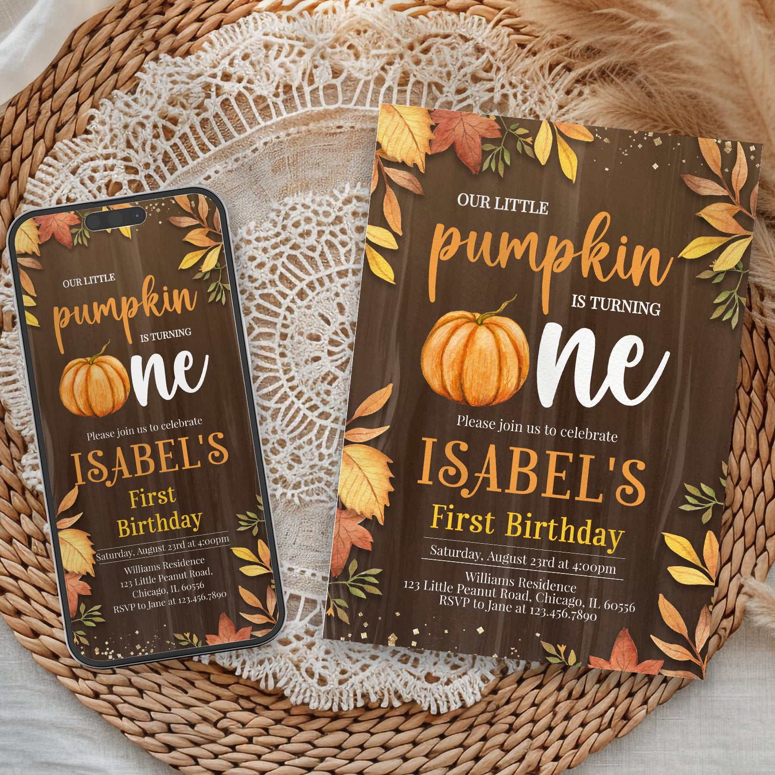 Celebrate your little pumpkin's first birthday with our charming fall-themed digital invitation! Designed on a warm brown background adorned with vibrant fall leaves and elegant gold accents, this invitation captures the essence of autumn festivities. The playful orange pumpkin cleverly replaces the "o" in "one," adding a delightful touch that will enchant your guests. Perfect for a cozy gathering, this invitation sets the tone for a memorable celebration filled with love and laughter. Make your child's milestone unforgettable with this unique and inviting design!