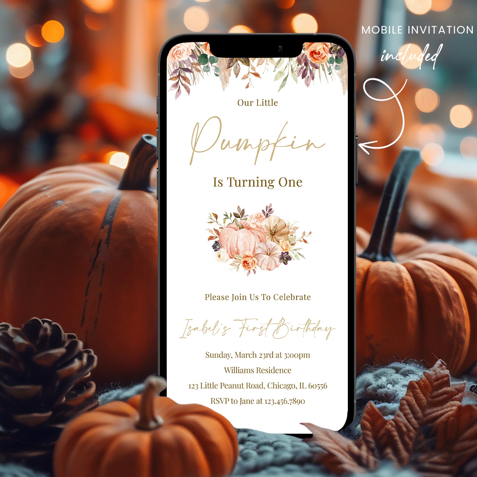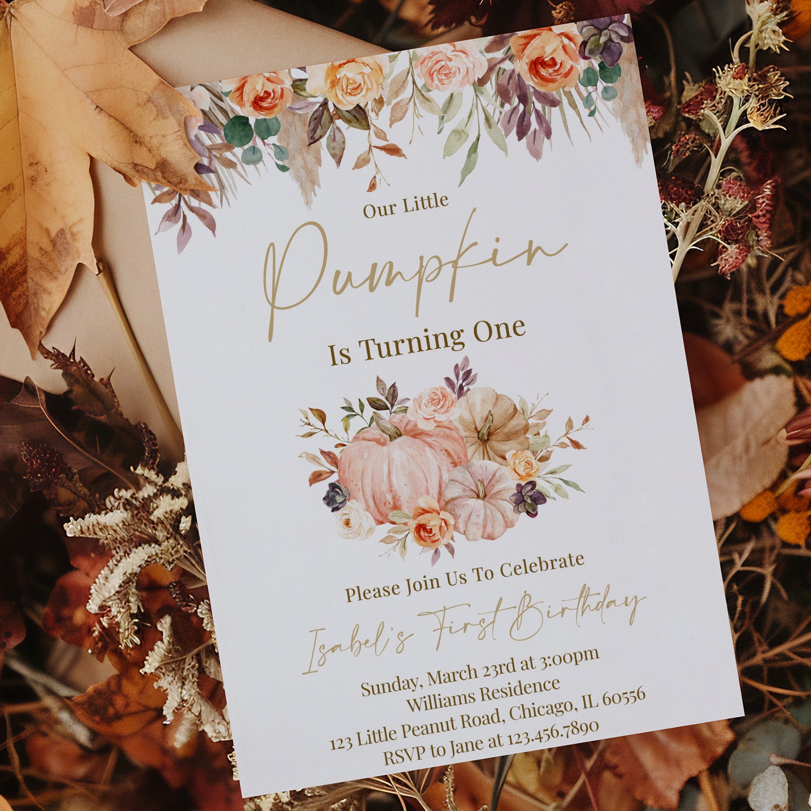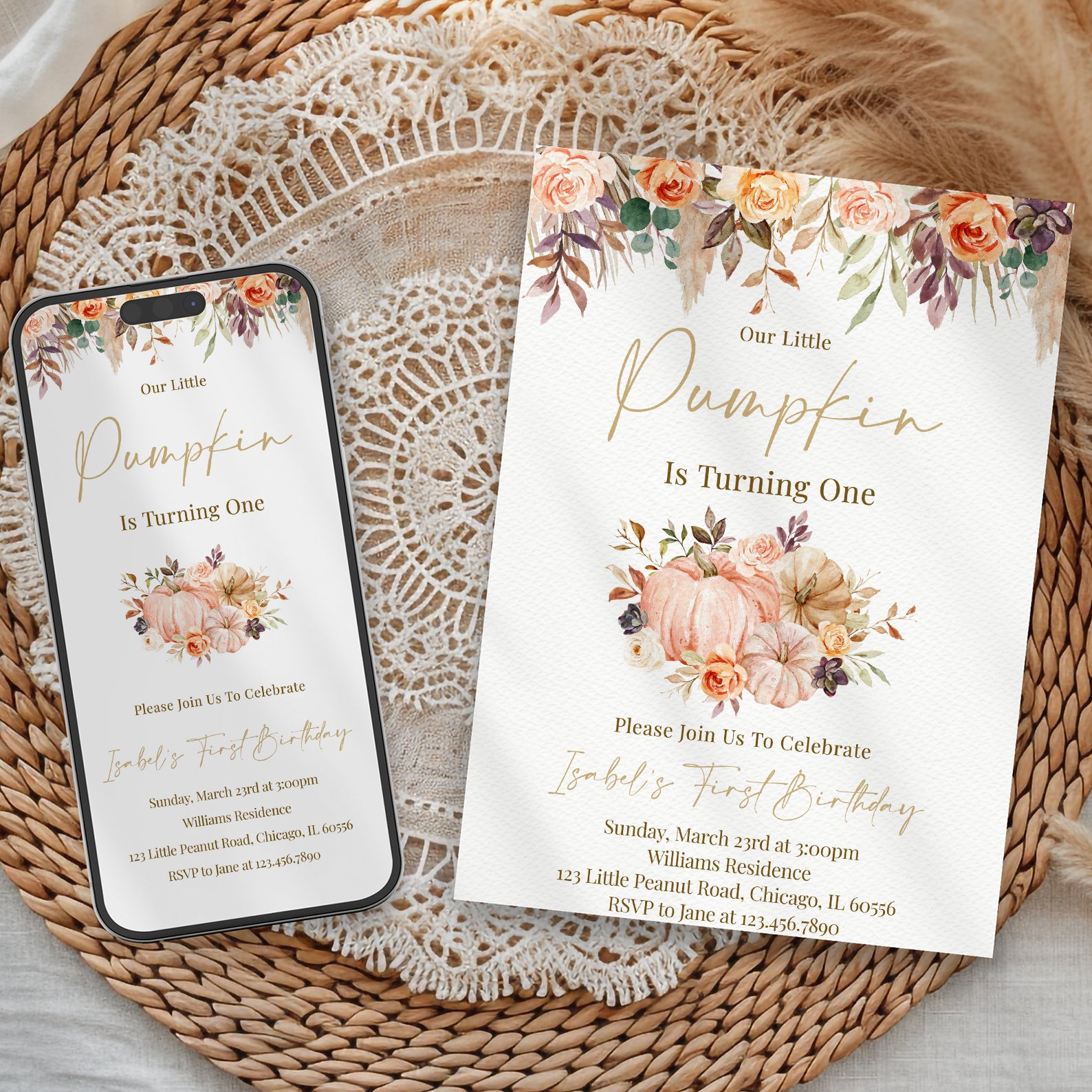Celebrate your little pumpkin's first birthday with our enchanting fall birthday digital invitation! Adorned with delicate pink and orange roses, vibrant fall leaves, and soft pampas grass, this invitation captures the essence of autumn. At the heart of the design, you'll find charming watercolor pumpkins in shades of pink, peach, and brown, beautifully complemented by a bouquet of pink, white, and orange roses. Perfect for setting the tone for a cozy and festive celebration, this invitation is sure to delight your guests and make your child's special day unforgettable!