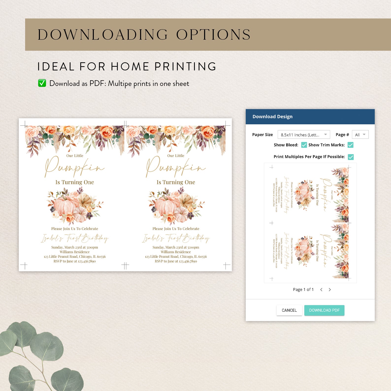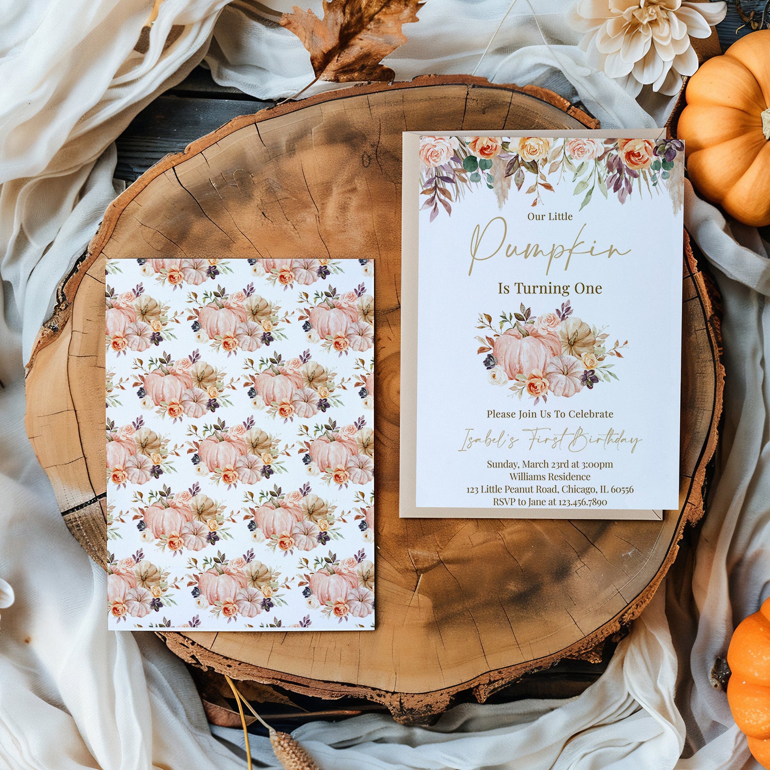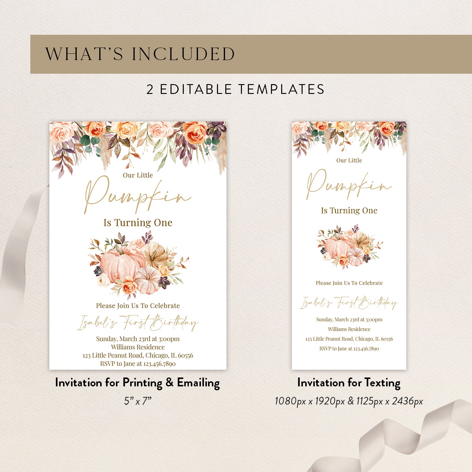 - Purchase this Little Pumpkin 1st Birthday Invite with Fall Florals template