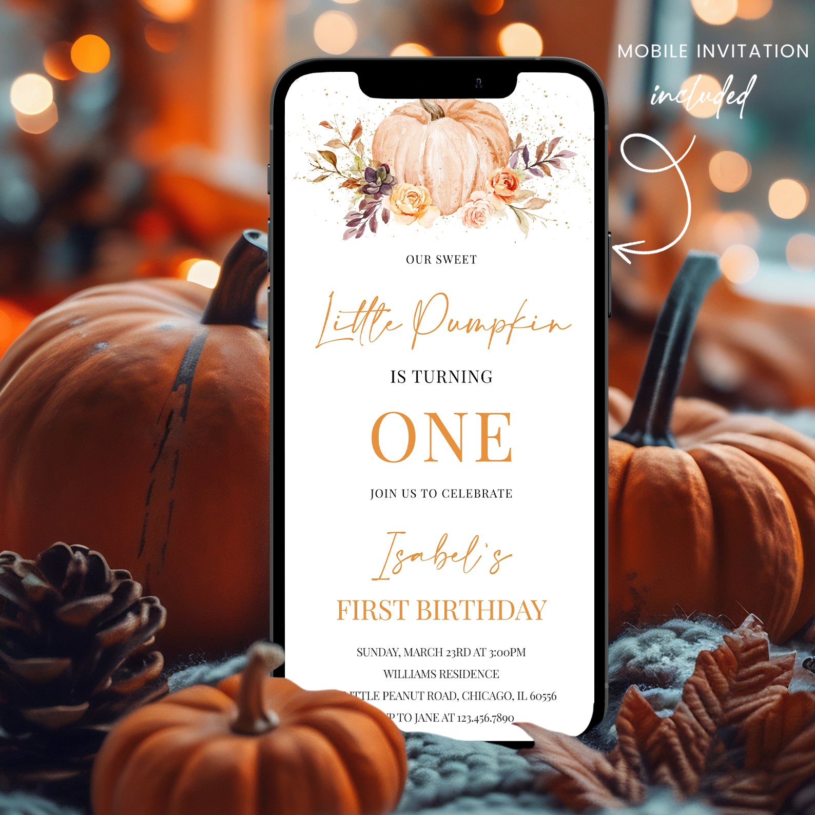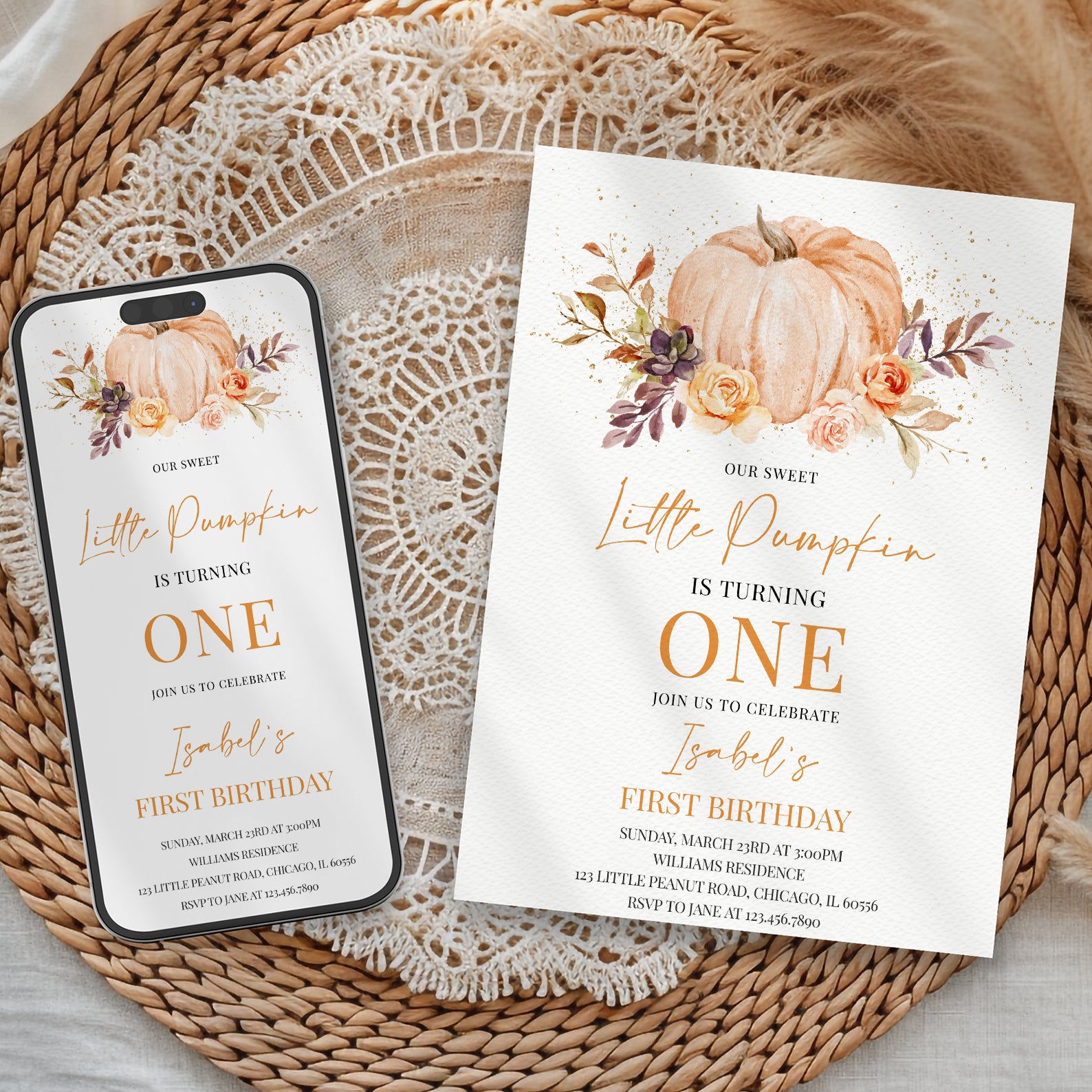 Celebrate your little pumpkin's first birthday with our charming fall-themed digital invitation! Featuring a delightful orange pumpkin adorned with beautiful roses, vibrant fall leaves, and elegant gold accents, this invitation sets the perfect tone for a cozy autumn gathering. Easy to customize and send, it’s the ideal way to invite friends and family to join in the festivities as you create unforgettable memories. Make your child's special day even sweeter with this enchanting design!