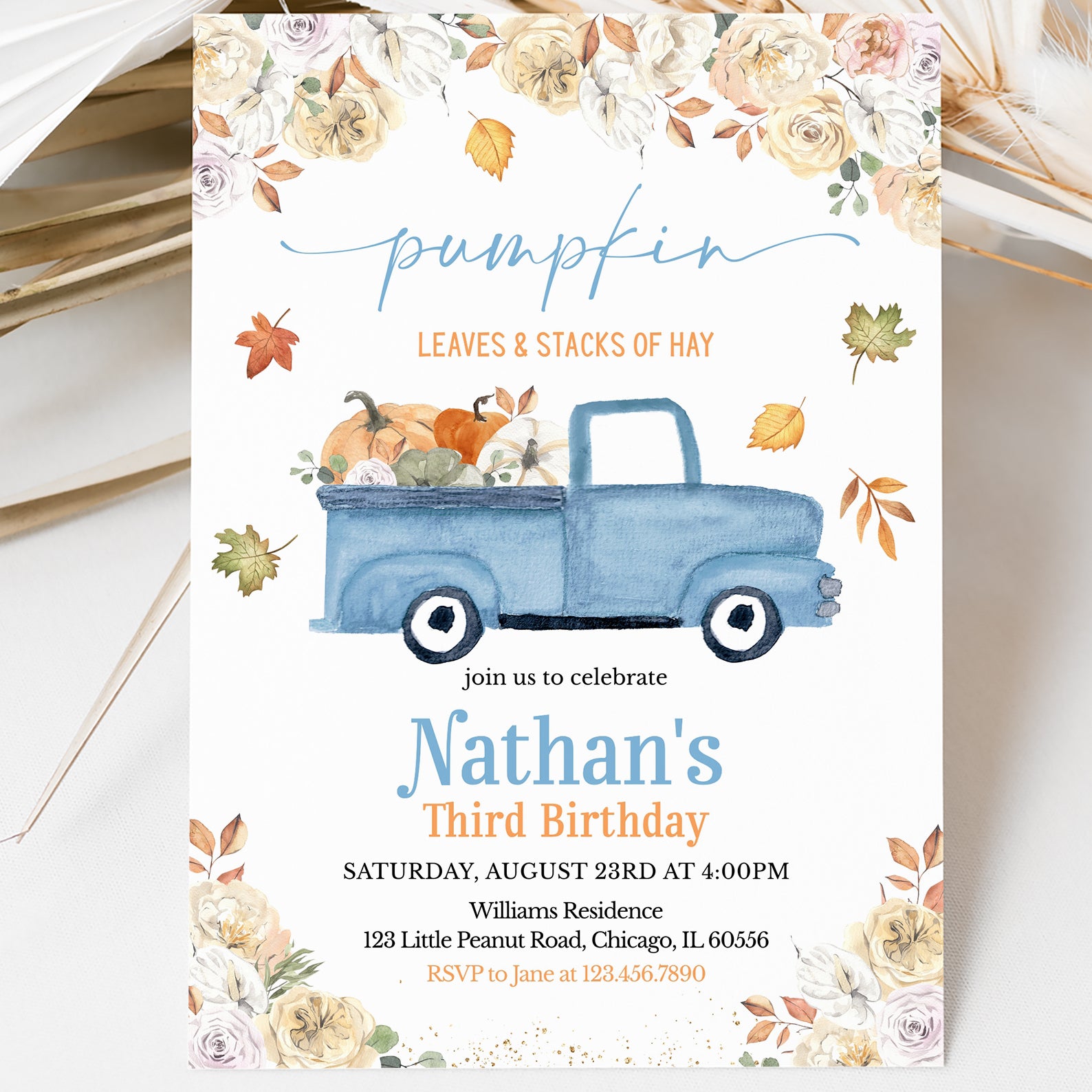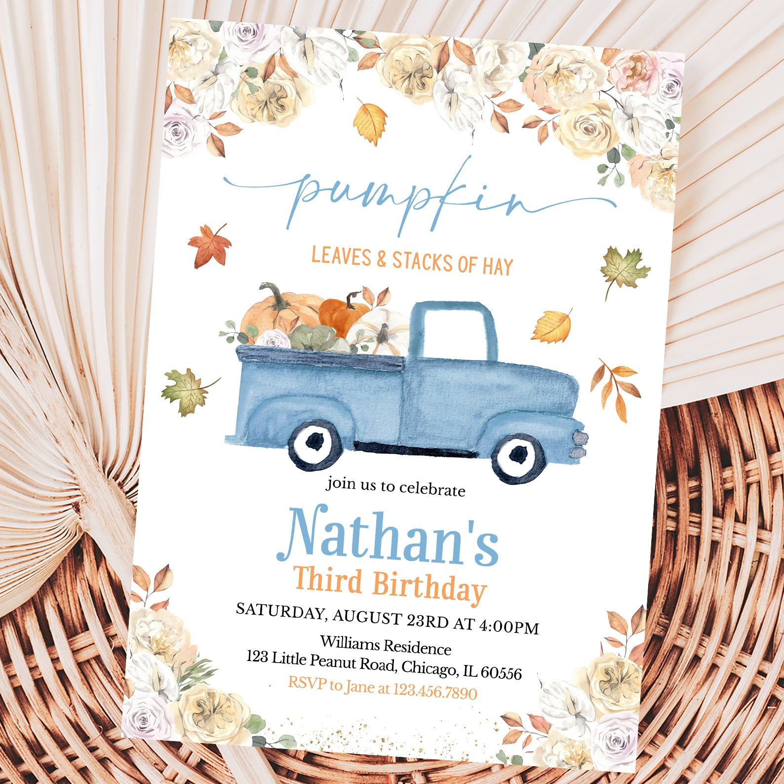 Pumpkins & Hay Fall 3rd Birthday Invite: Blue Truck Theme
