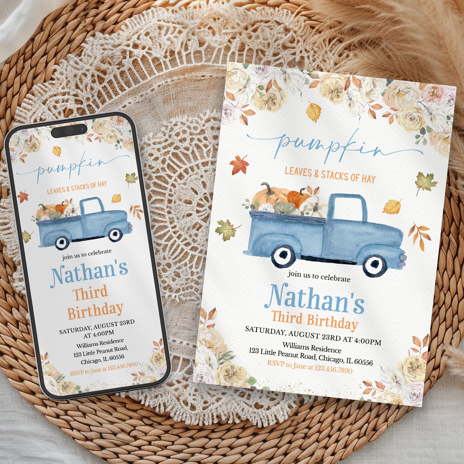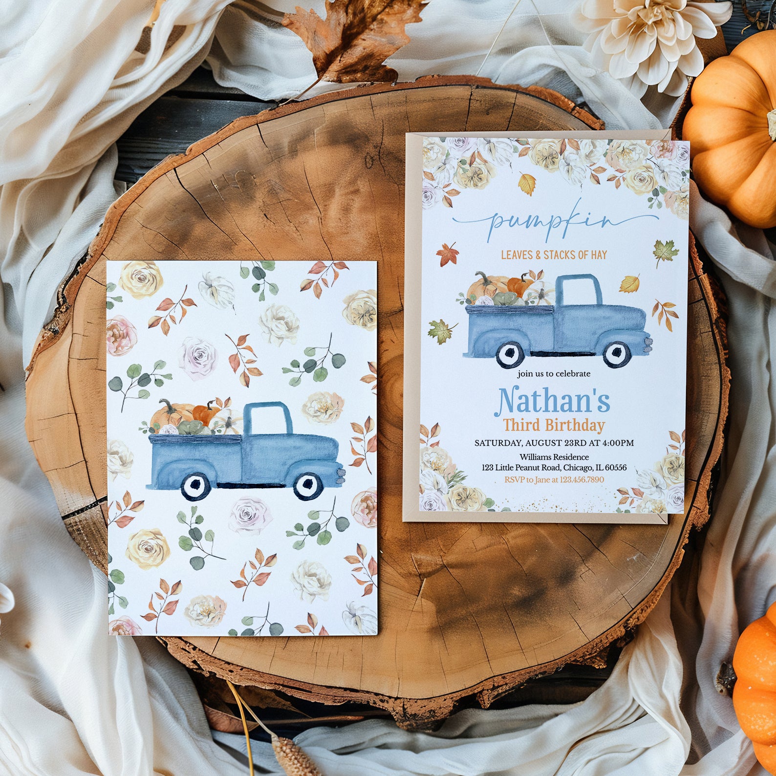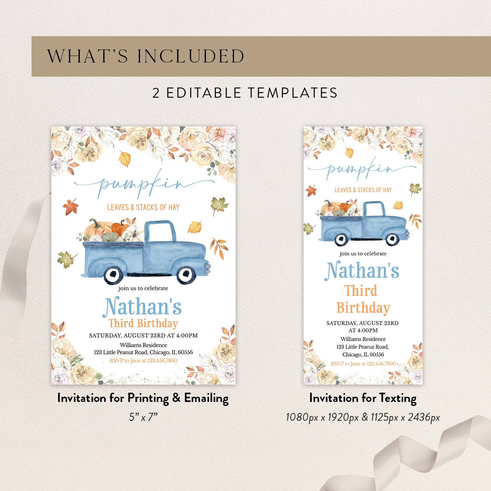 1. Purchase this Pumpkins & Hay Fall 3rd Birthday Invite: Blue Truck Theme template