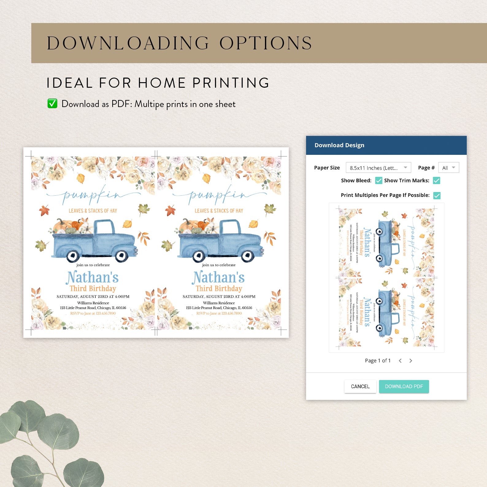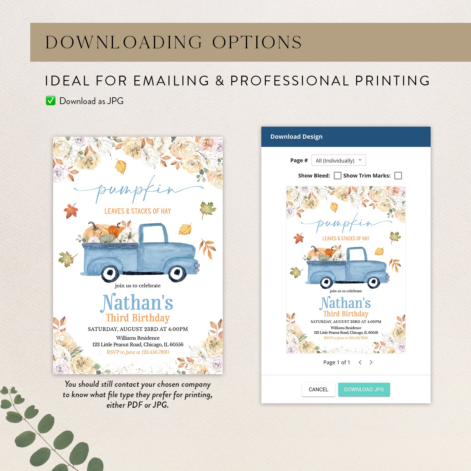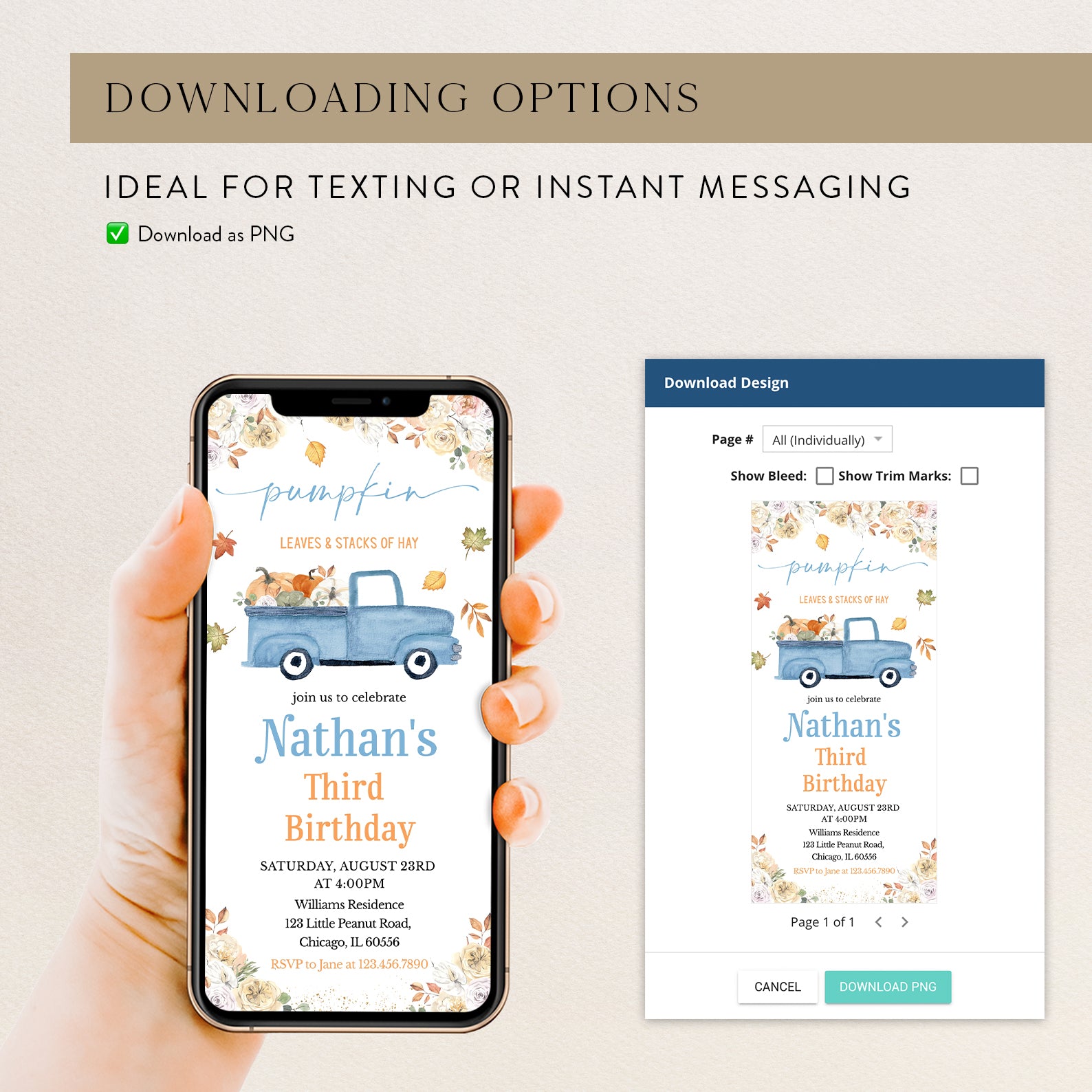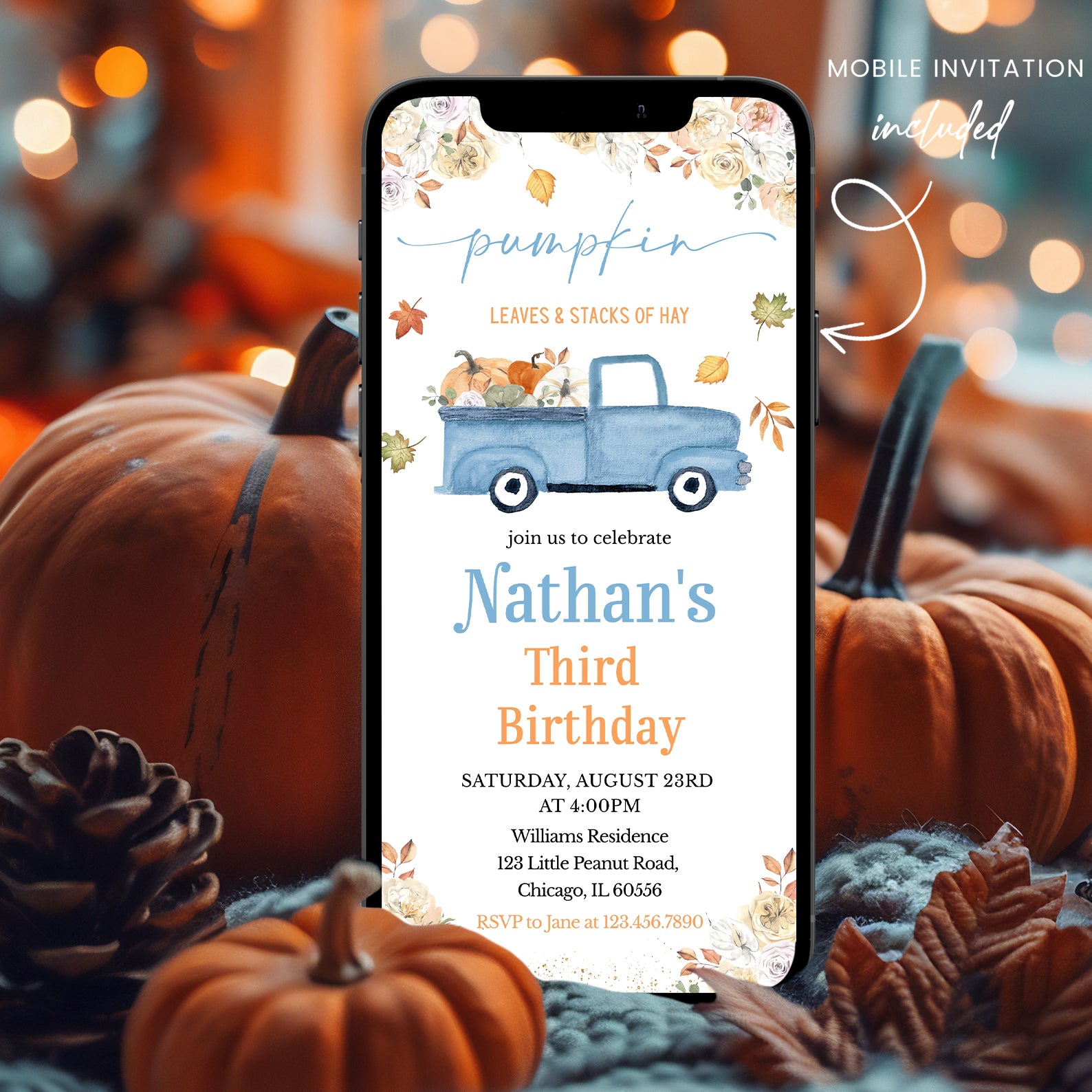 1. Purchase this Pumpkins & Hay Fall 3rd Birthday Invite: Blue Truck Theme template
