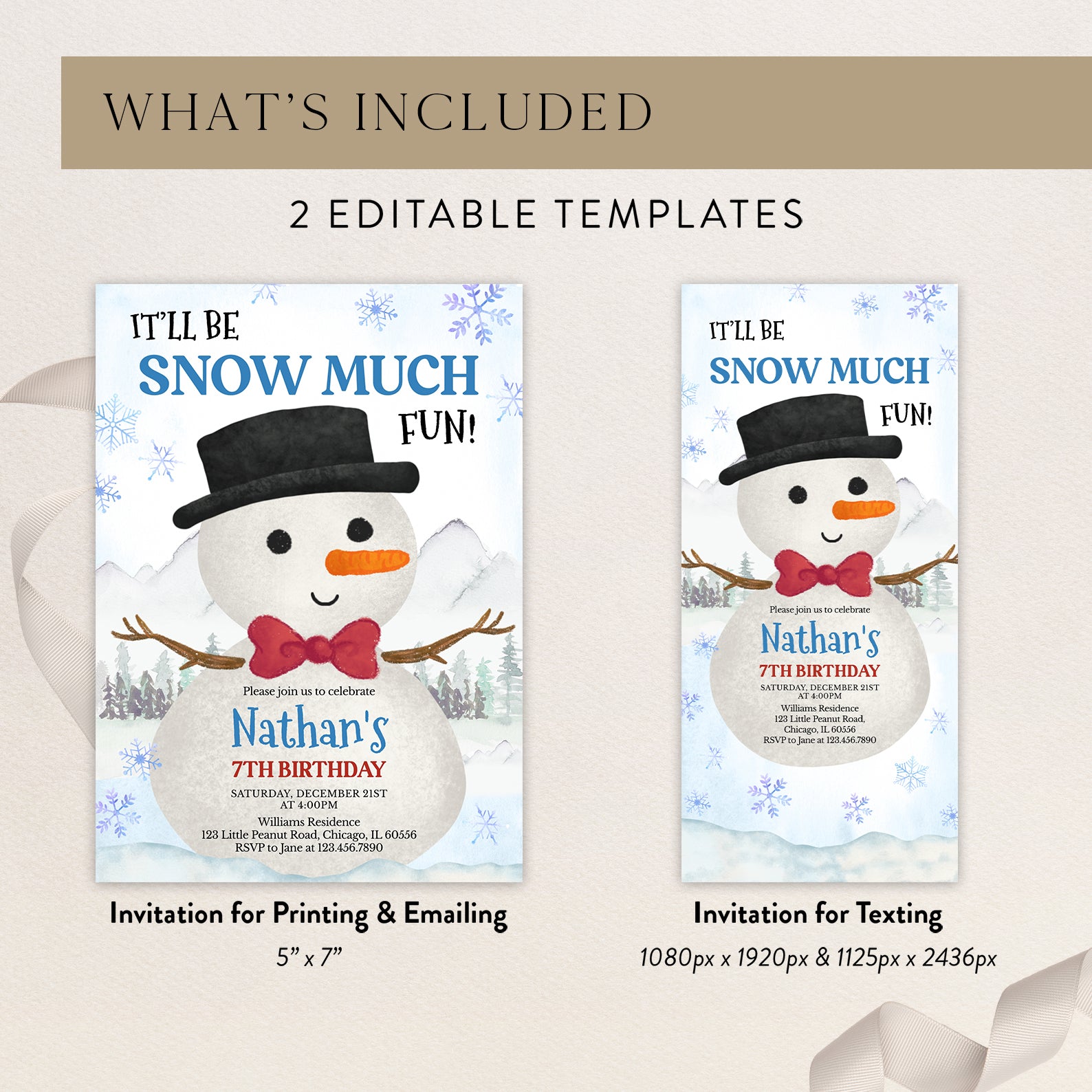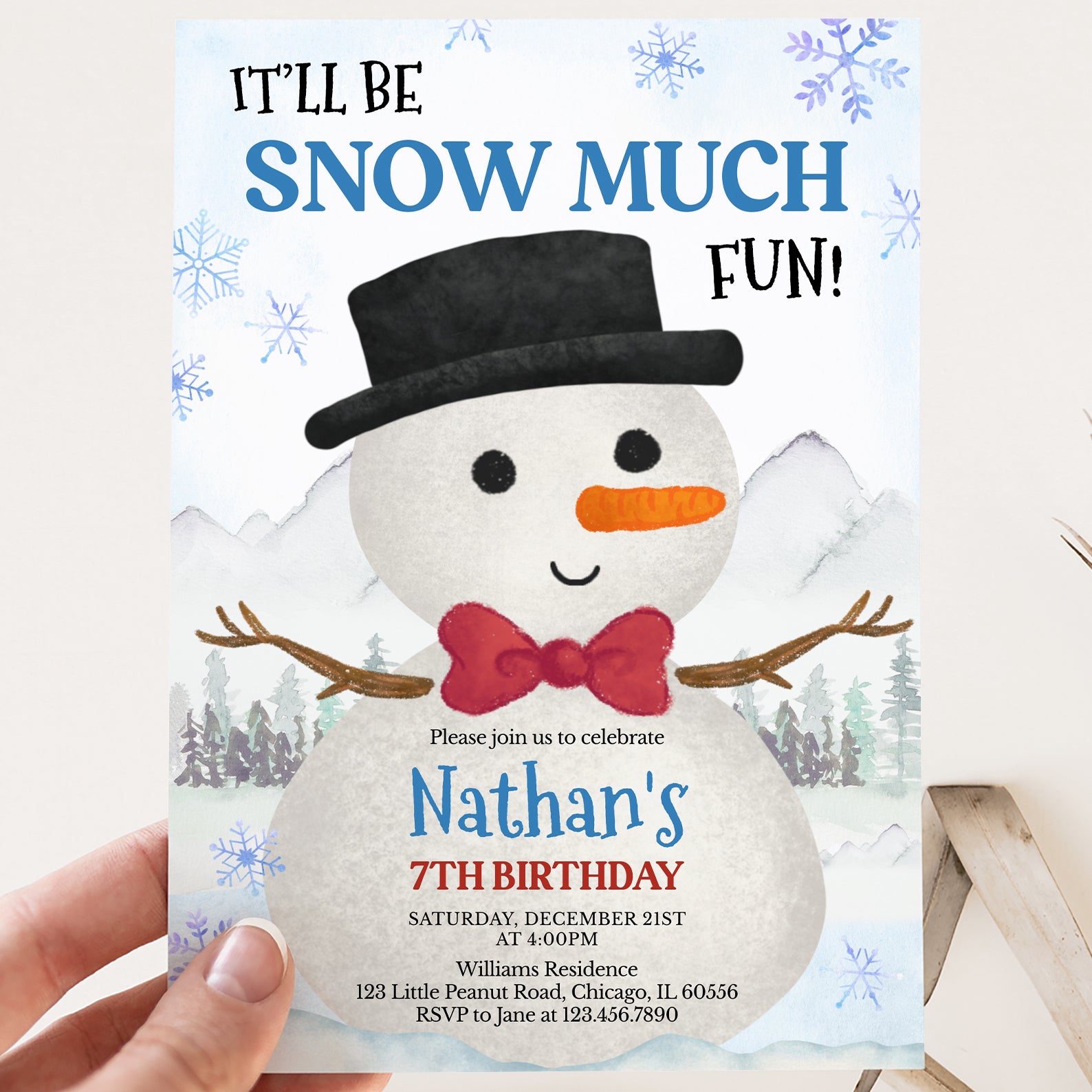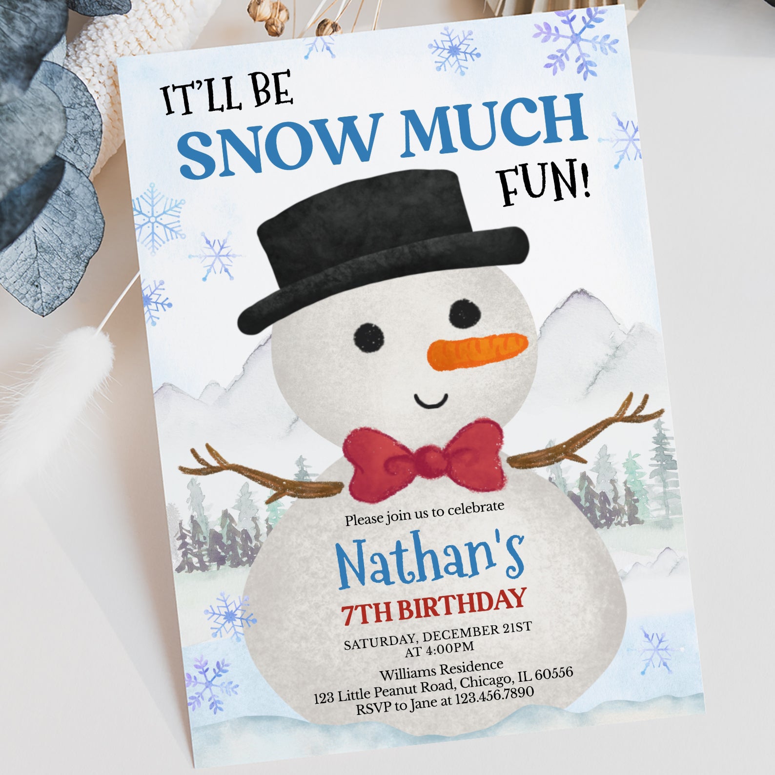 - Purchase this Snow Much Fun 7th Birthday Invite: Snowman Winter Scene template