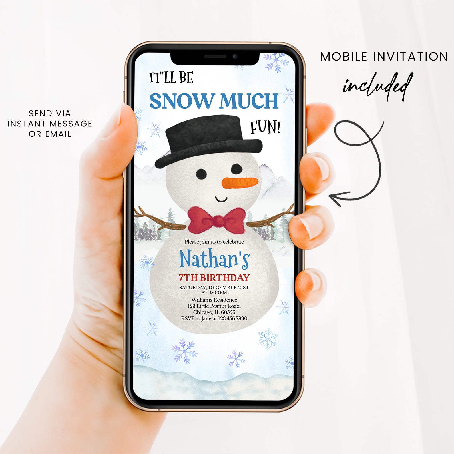 Celebrate your child's 7th birthday with our enchanting Winter Birthday Digital Invitation! Featuring an adorable snowman adorned with a classic black hat, a cheerful pointed orange nose, and a festive red bow, this invitation sets the perfect tone for a frosty celebration. The charming blue winter scene, complete with gently falling snowflakes and majestic mountains, creates a magical backdrop that will excite your guests. Make their special day unforgettable with this delightful invitation that promises "snow much fun!"