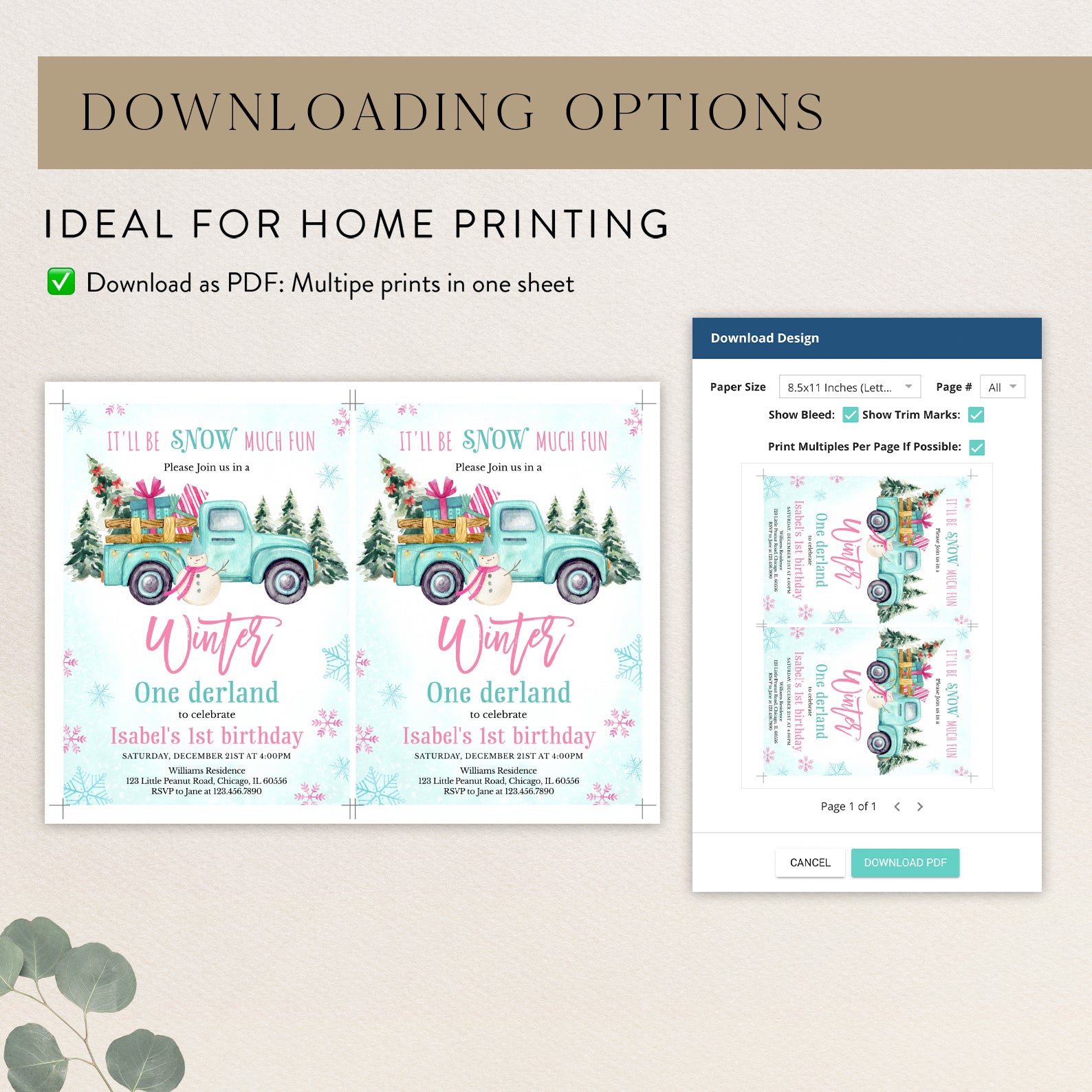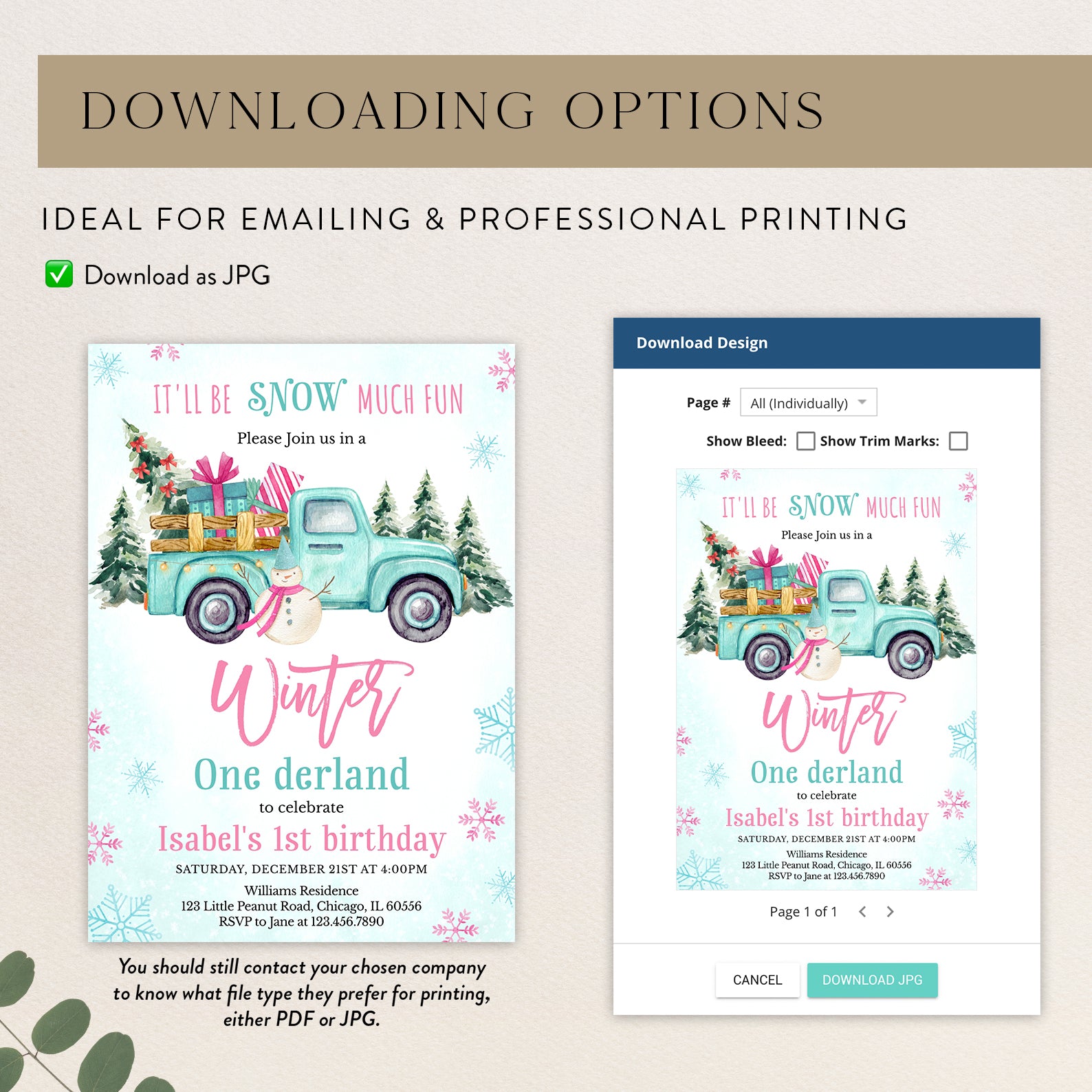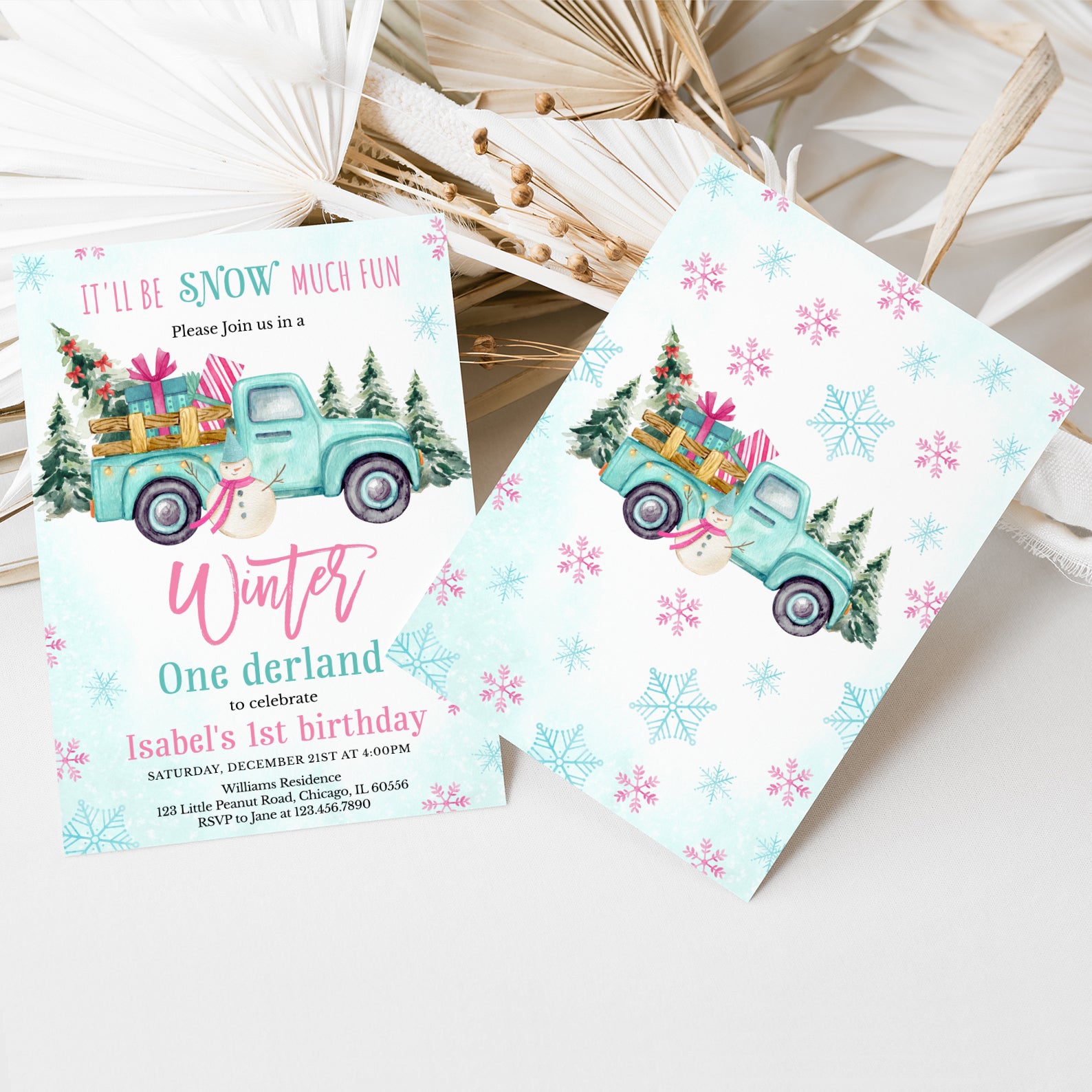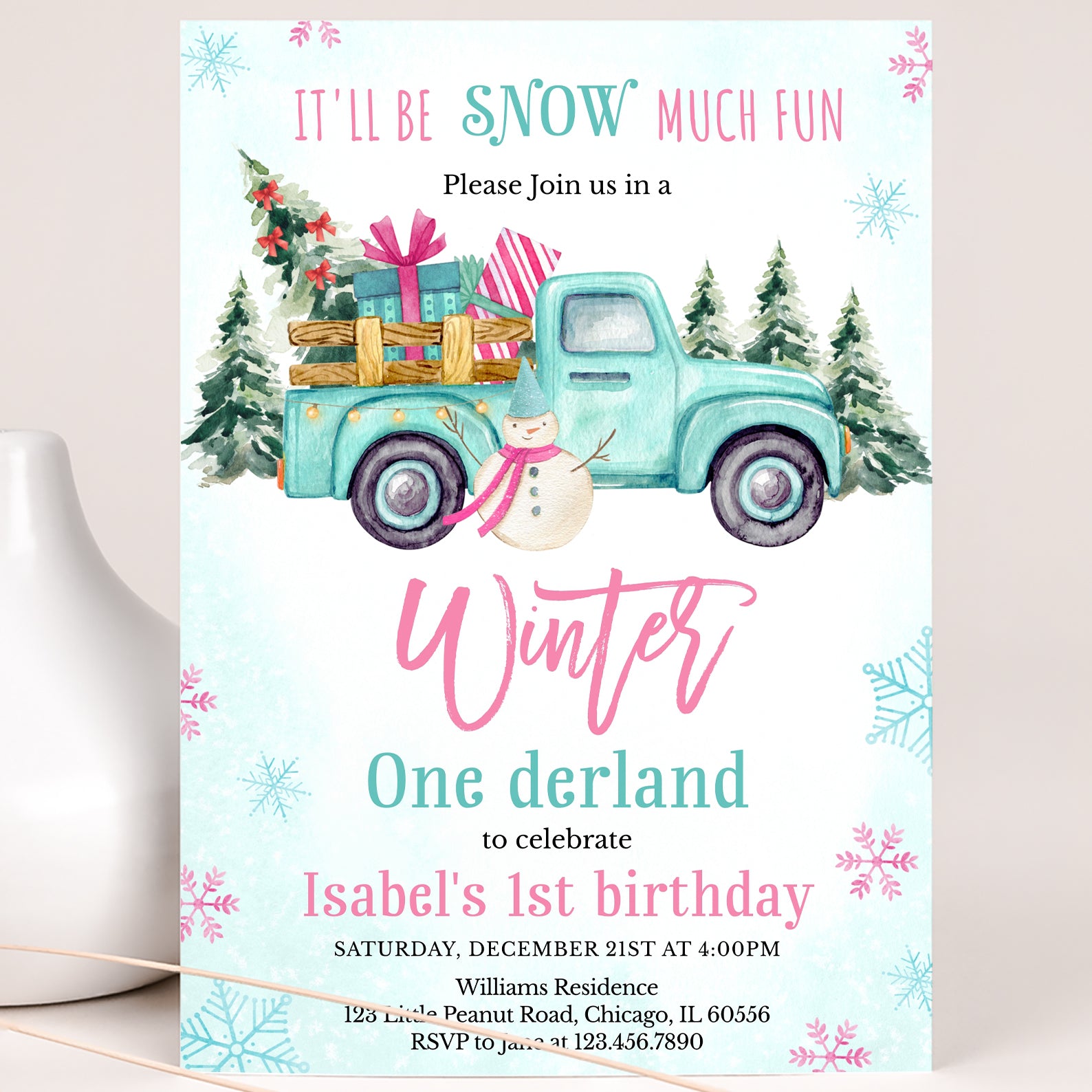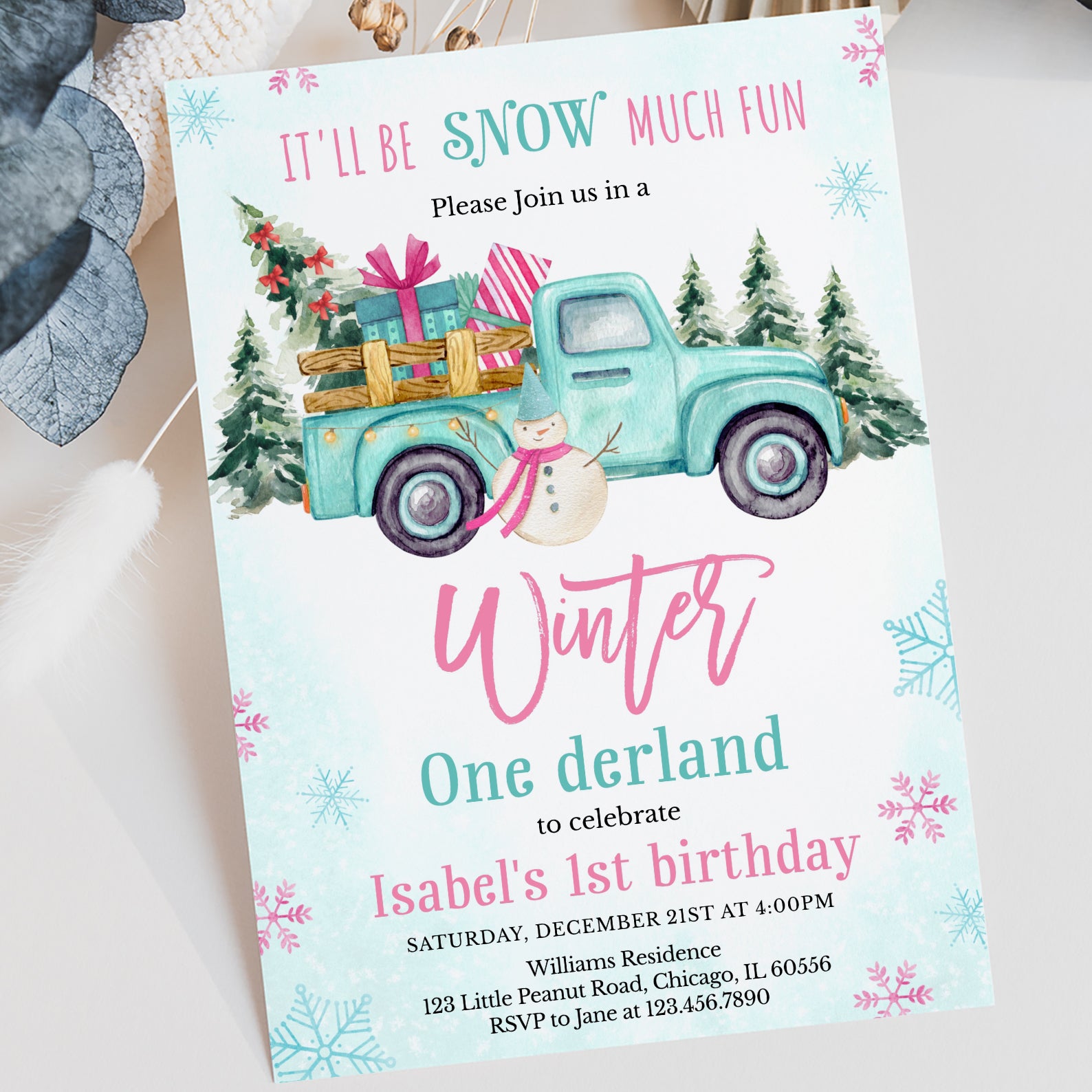 - Purchase this Winter Wonderland 1st Birthday Invite: Blue-green Truck & Snowman template
