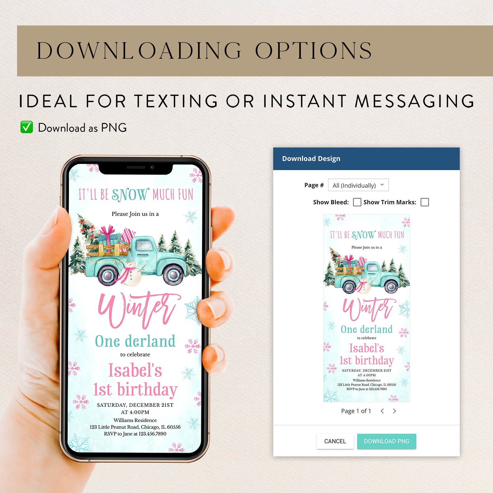 Celebrate your little one's first birthday with our enchanting Winter Wonderland Digital Invitation! Available in charming pink and blue-green themes, this delightful design features whimsical falling snowflakes, a sideview of a festive truck brimming with gifts, and a beautifully adorned Christmas tree. The backdrop showcases serene pine trees, while a cheerful snowman in a party hat and pink scarf adds a playful touch. Perfect for setting the tone for a magical winter celebration, this invitation promises to make your child's special day "snow much fun!"