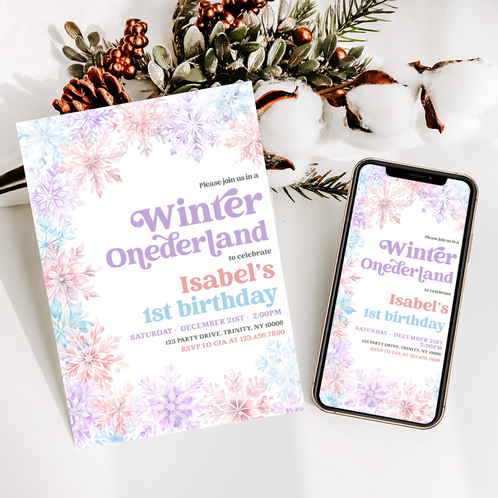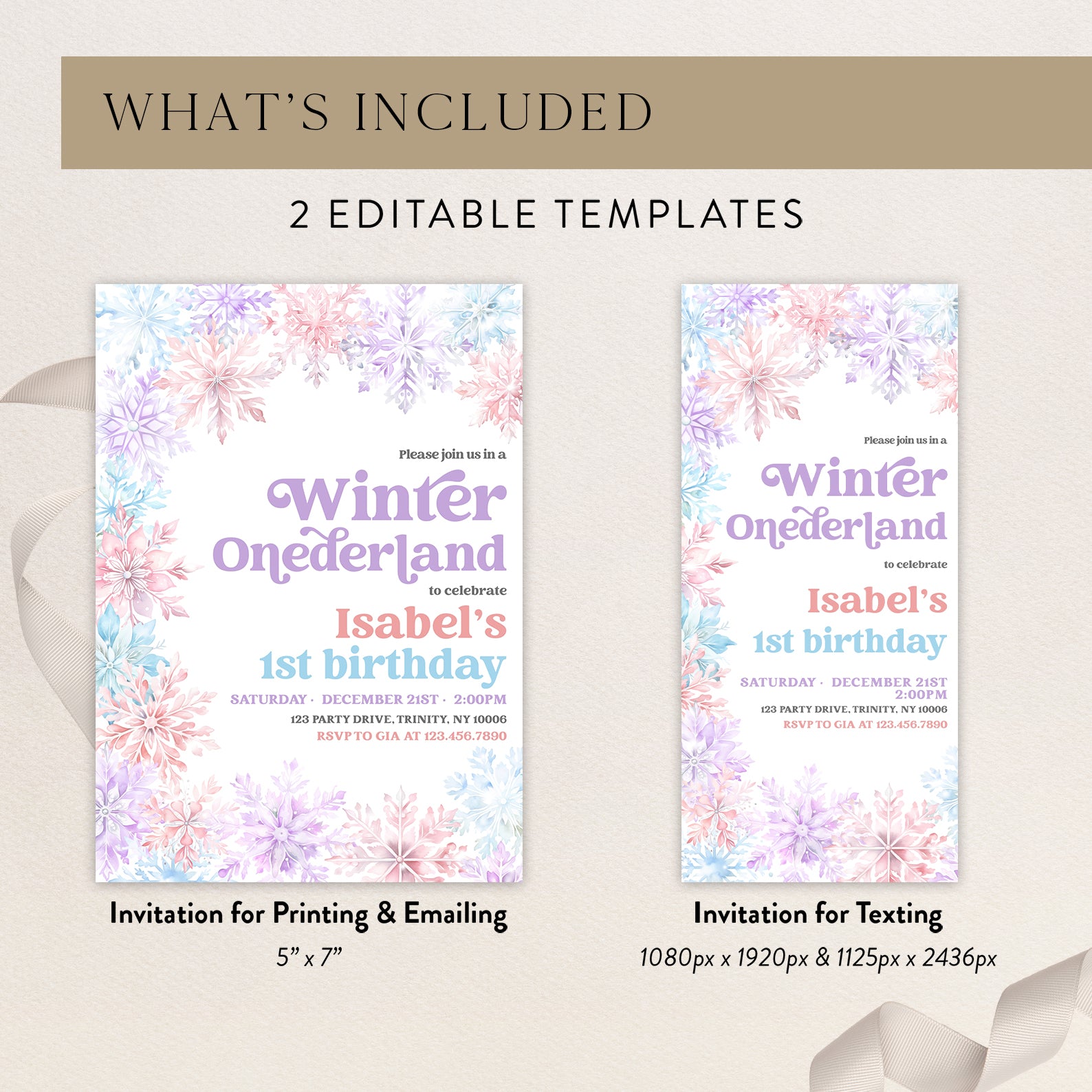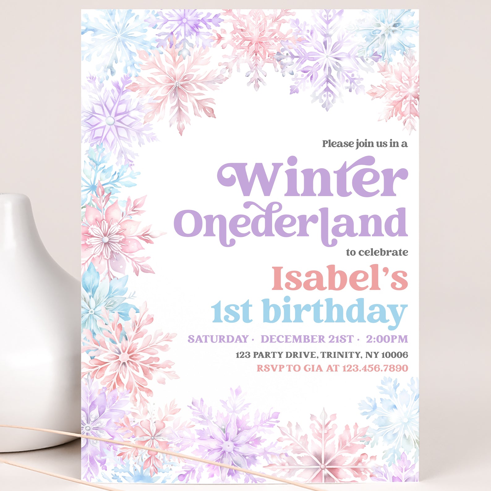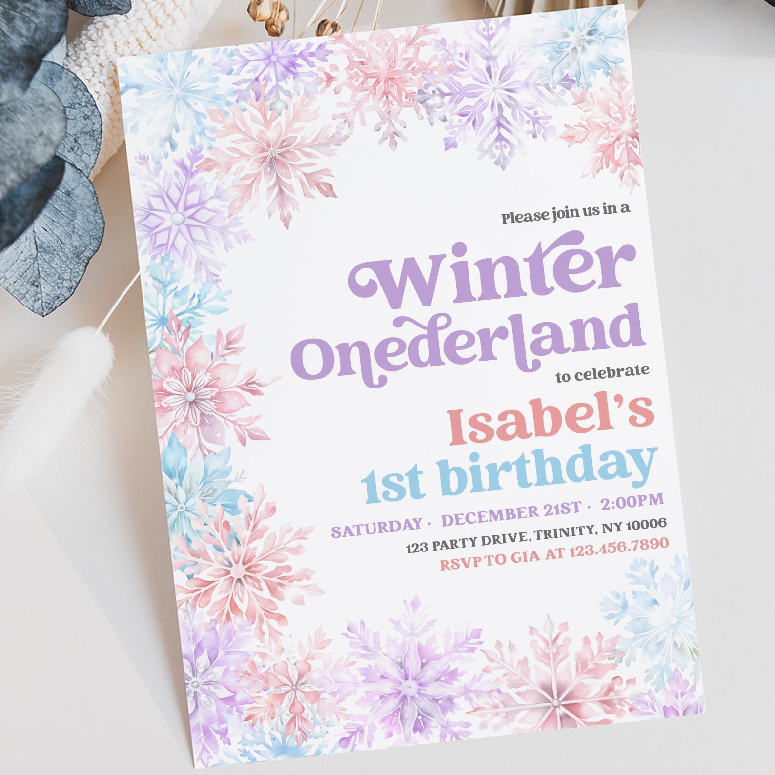 - Purchase this Winter ONEderland 1st Birthday Invite: Pastel Snowflake Theme template