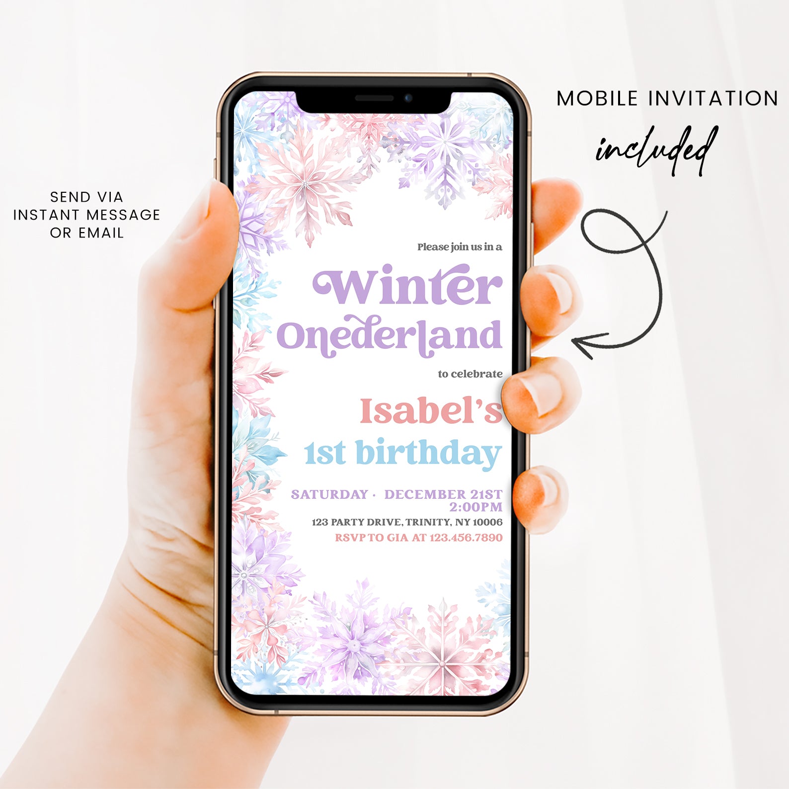 Celebrate your little one's first birthday with our enchanting Winter One-derland digital invitation! Adorned with a charming snowflake border in soft pastel pink, blue, and purple, this invitation sets the perfect tone for a magical winter celebration. Effortlessly customizable, it allows you to add your party details and send it out to friends and family in just a few clicks. Make your child's milestone unforgettable with this delightful and whimsical design that captures the essence of a winter wonderland!